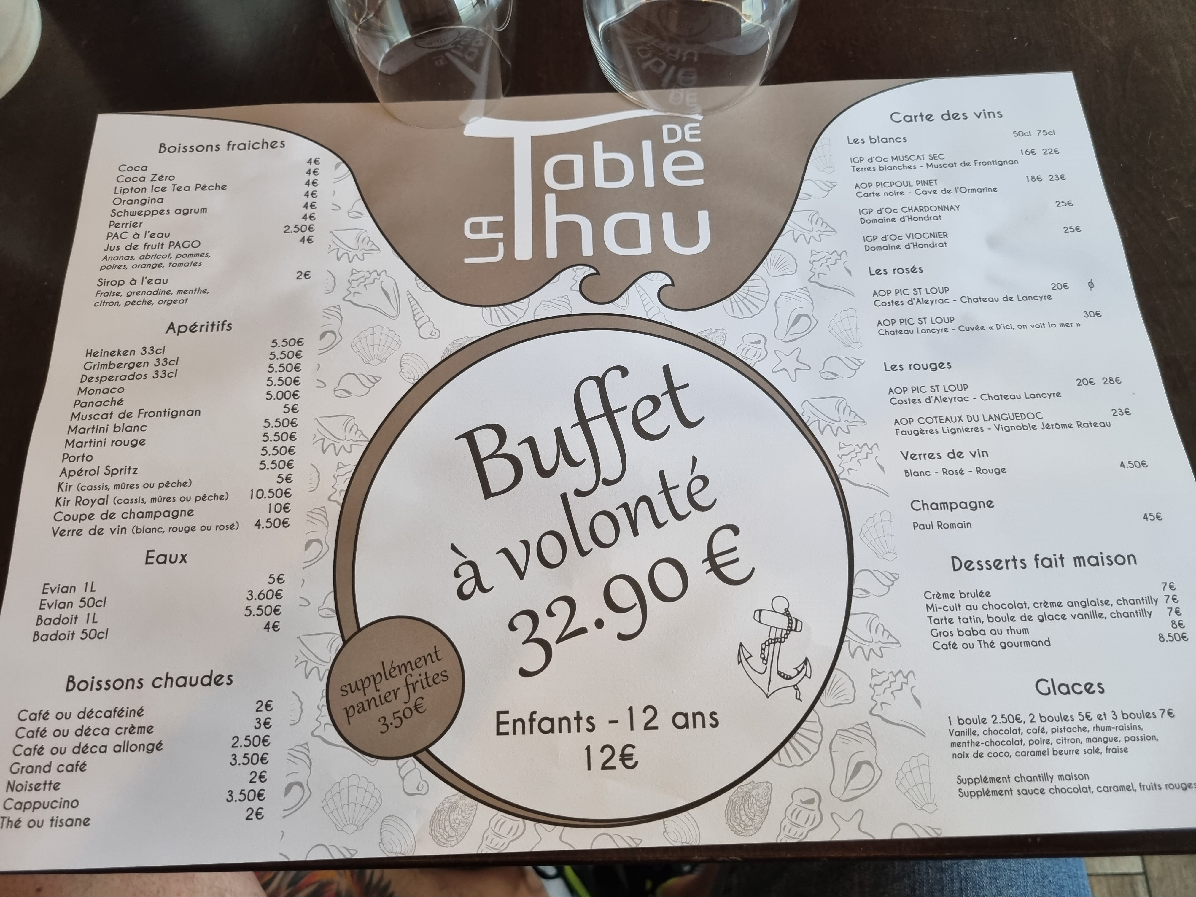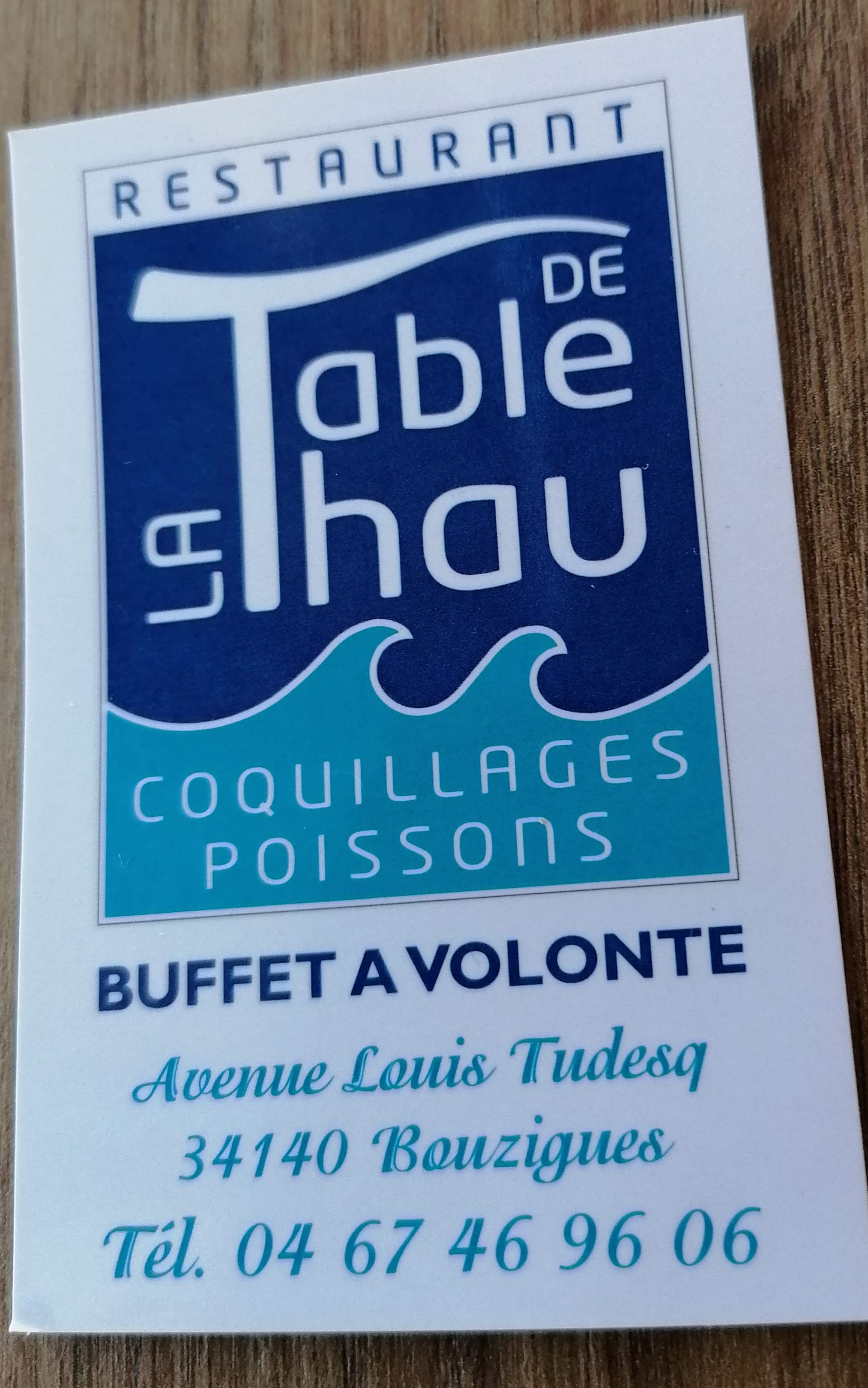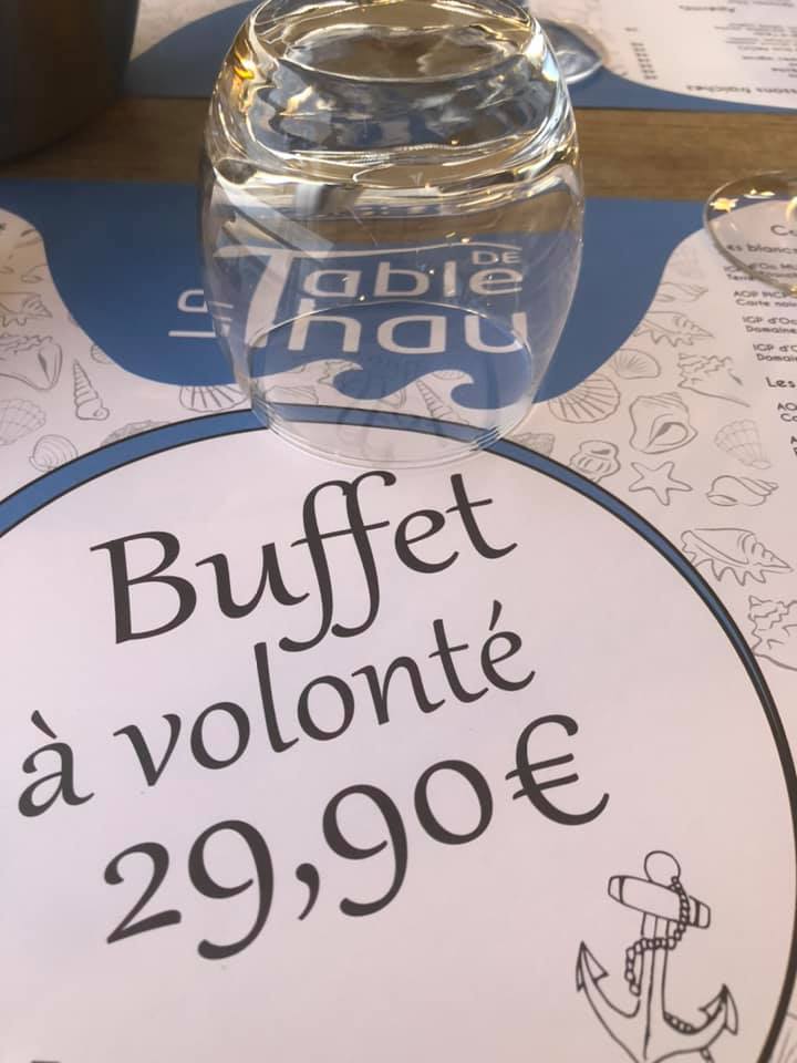 La table de thau, bouzigues buffet à volonté, très bon produit frais . plat chaud très bon , huîtres gratinées, couteaux en persillades, moule cuite, brandade de morue, rouille de seiche à la setoise. pour 29,90 euro rien a redire !! et superbe vue sur les parcs à huîtres. retour en septembre et toujours parfait