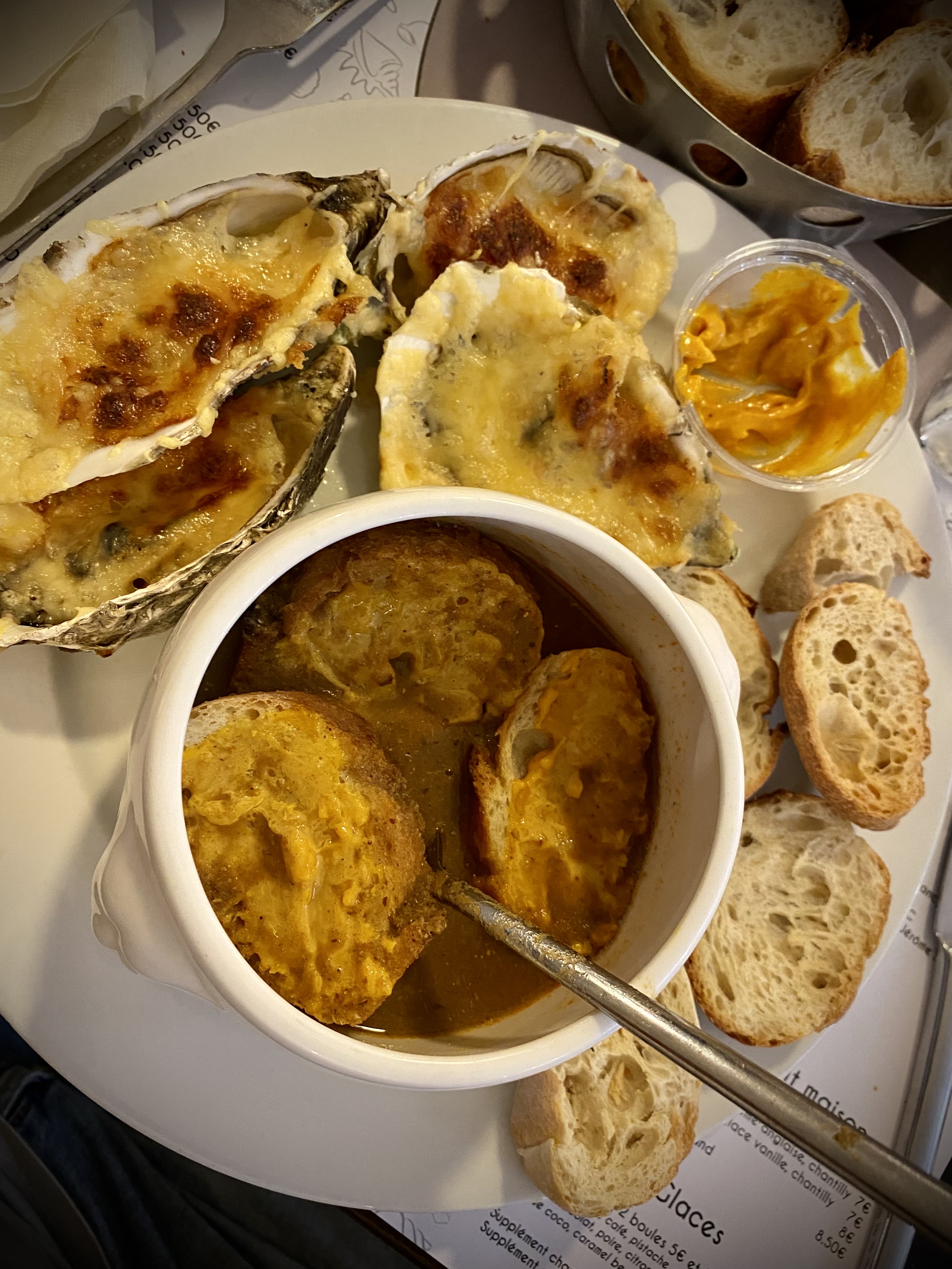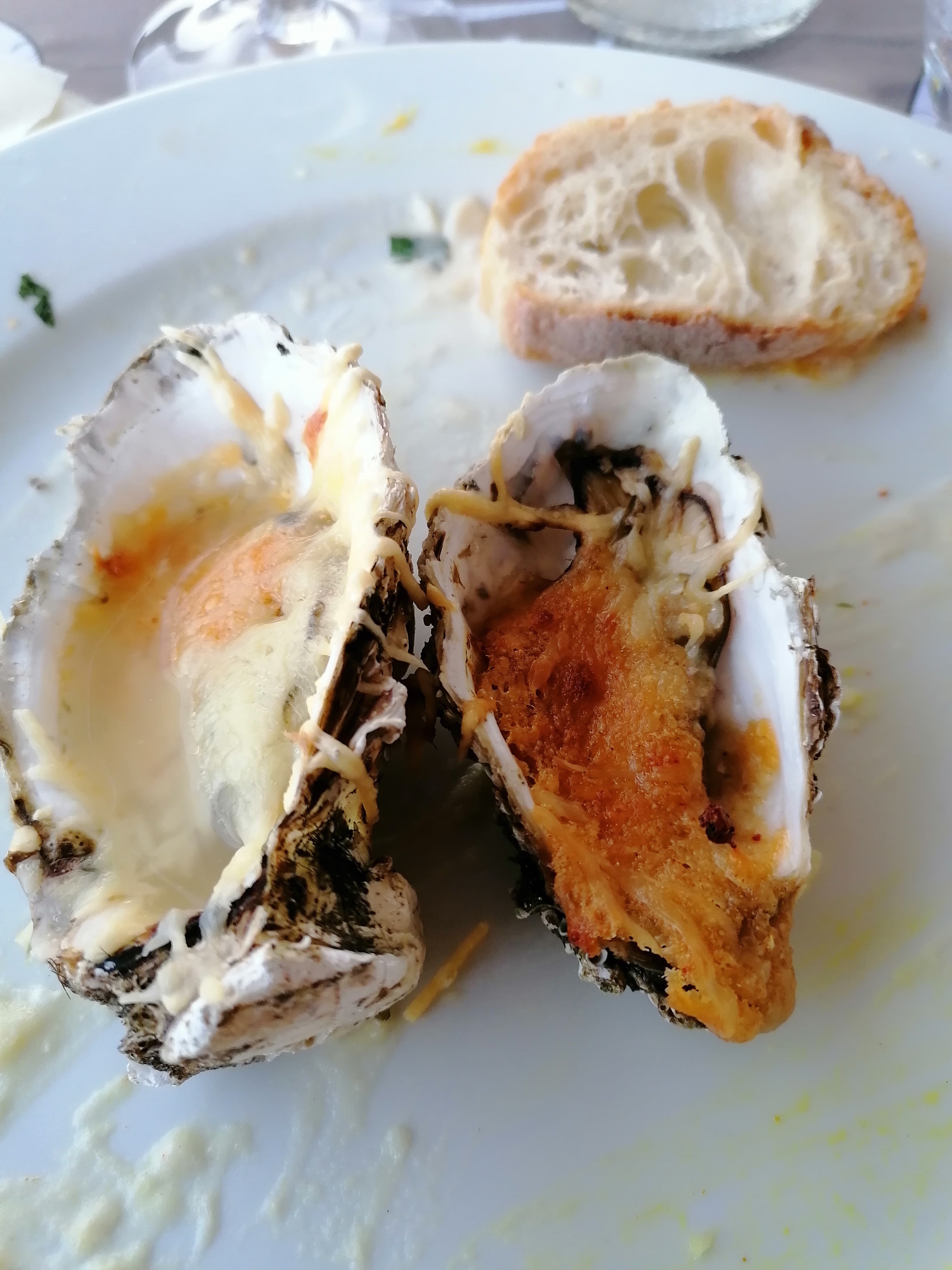 Huîtres gratiné tiède. Moules farcies froide. Fruits de mer frais très bon