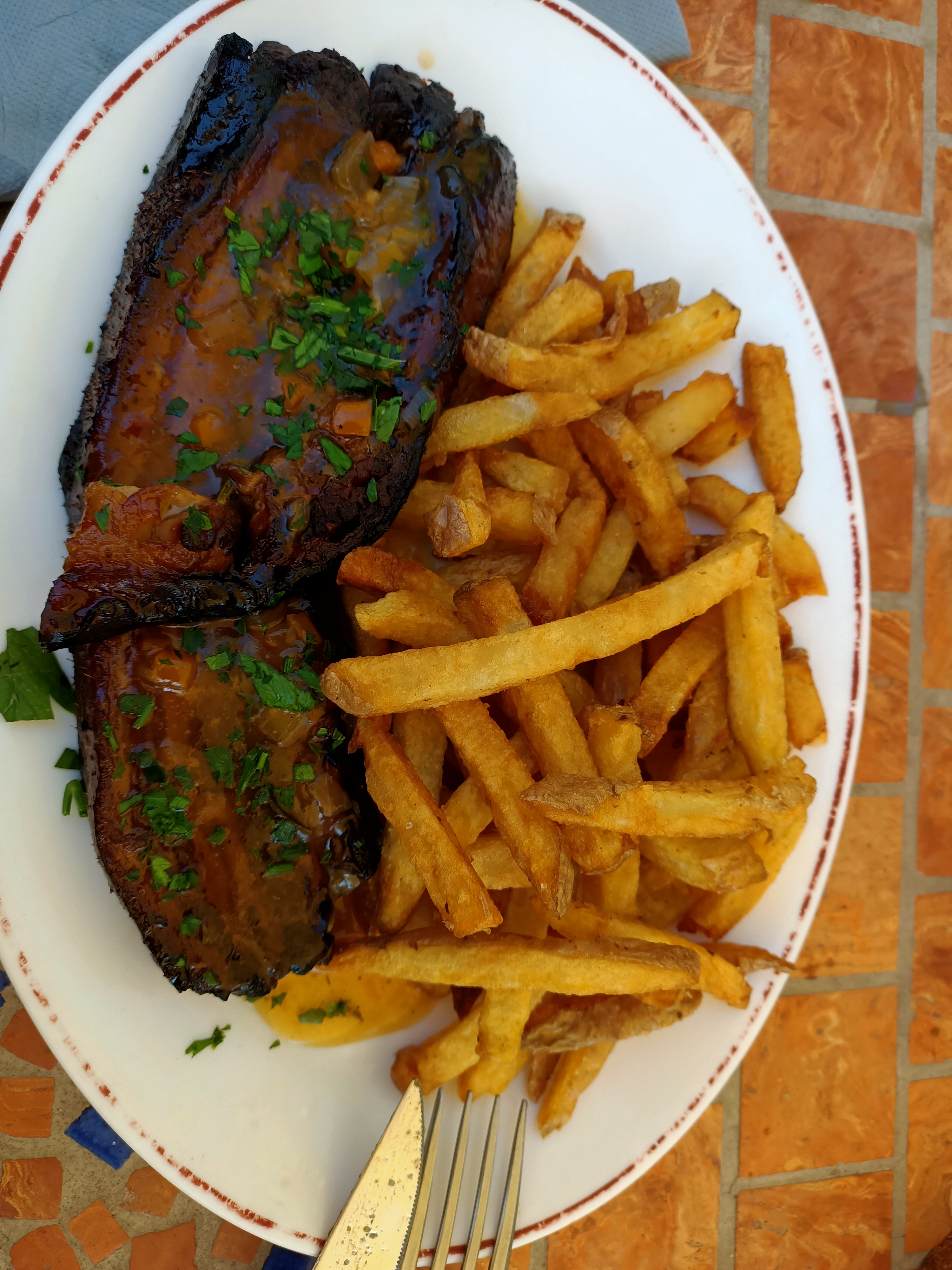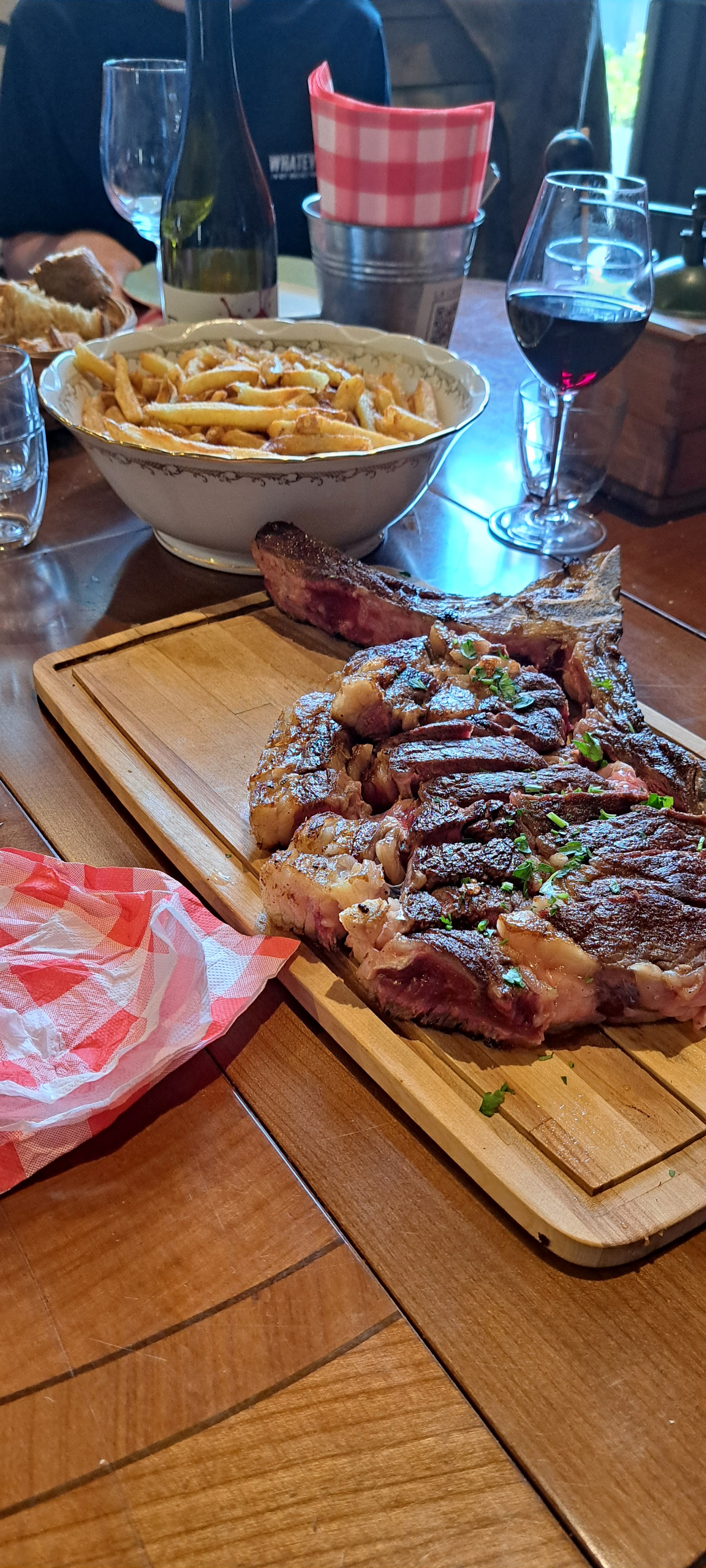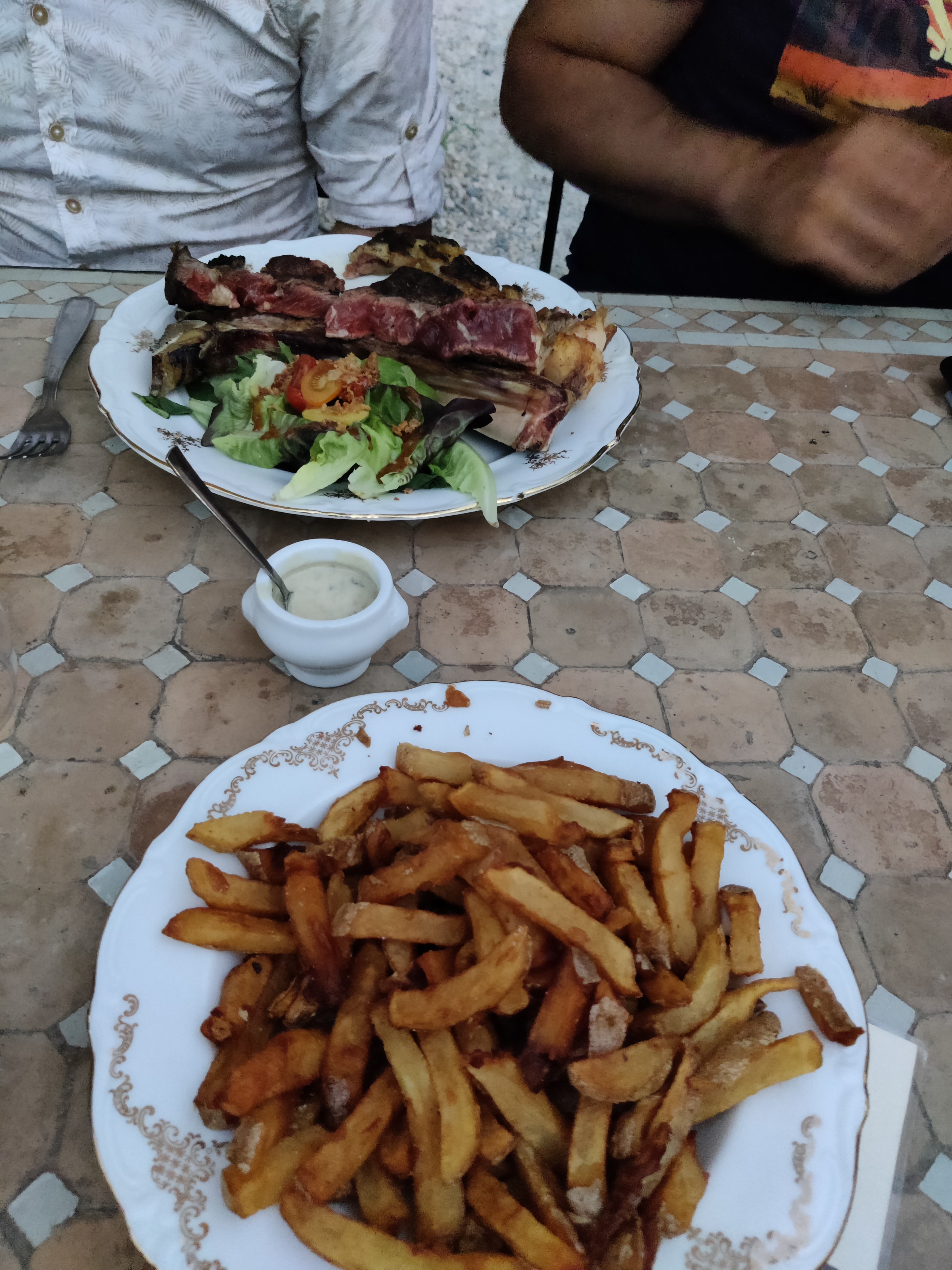 Expérience plus que décevante au vu de la note (4,6) affichée au moment de notre visite. - nous avons attendu plus de 45 min pour la prise de commande de l'apéritif, lors de la commande notre choix n'était plus disponible ( pas les ingrédients pour faire de simple mojitos). 3 d'entre nous se sont rabattus sur des bières pression ( pas fraîche ... ) - commande de l'entrée : escargots et planche de charcuterie avec pan con tomate. Nous étions 6 il y avait 4 tranches de pain ... (4e les 4 bouts de pains ...) La serveuse aurait au moins pu nous prévenir des quantités afin que nous en commandions d'avantage. ( Au vu de la lenteur du service nous n'avons pas pris le risque de les voir arriver pour le dessert) - lorsque le plat est arrivé deux d'entre nous ont du manger leur côte de boeuf dans la même assiette. En effet la côte de boeuf arrive bien chaude pour deux sans les assiettes, on nous dit que les assiettes suivent mais nous les attendons encore. Résultat ils ont fini par manger leur plat dans la même assiette et tout était déjà froid. - nous étions 5 a commander des frites en accompagnement, une assiette arrive , voir photo, nous demandons au serveur si c'est pour les 5 personnes il nous confirme que oui. Une table de deux personnes a côté de nous avait exactement la même quantité. - pour finir deux d'entre nous commandent des cafés, deux autres des desserts, les cafés sont oubliés et servis une fois que les desserts sont terminés. Pour conclure : mauvaise expérience, tarifs élevés pour le service proposé, manque de personnel flagrant. Et si seulement ça s'était arrêté là mais le lendemain 4 d'entre nous ont eu des troubles gastriques. (Plateau de charcuterie partagé ?)