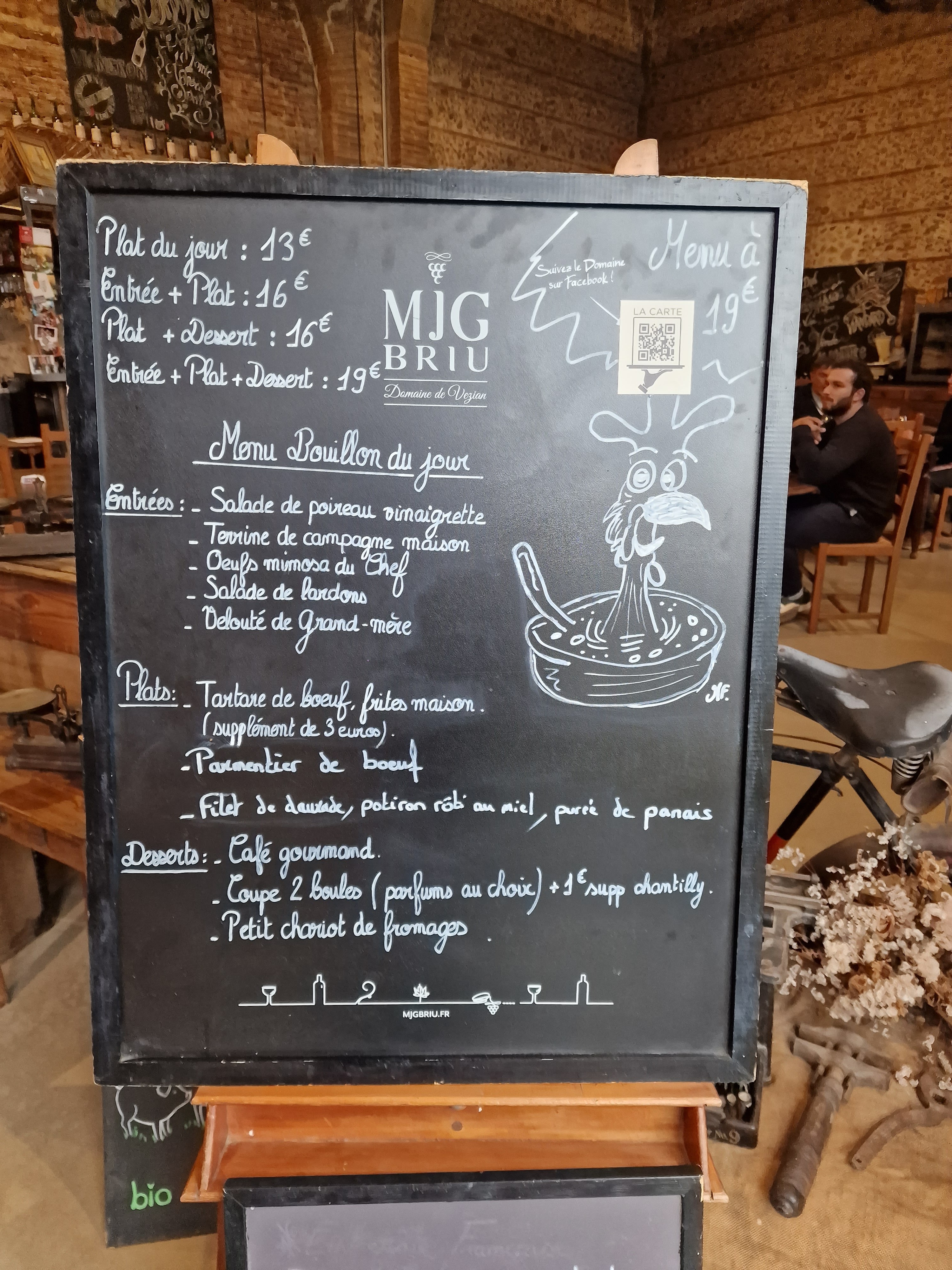 Déco brocante sympa sauf les chaises en paille pas confortables du tout. Menu Bouillon en semaine.. nous avons testé un samedi midi...pâté maison un peu sec mais bon sauf que dans la salade j'avais un morceau de l'assiette que j'ai croqué et j'ai dû cracher oups. Croquettes au jambon malheureusement trop cuites pour pas dire cramées... Ensuite deux propositions manquantes un samedi midi...on s'est rabattu sur l'onglet très bien ,un tartare coupé et une lotte au chorizo très bonne mais frites maison recuites , bronzées et toutes molles...bref ça nous a pas passé l'envie Question tarif c'est pas donné et c'est très bruyant vu la hauteur du plafond c'est logique, ça raisonne...