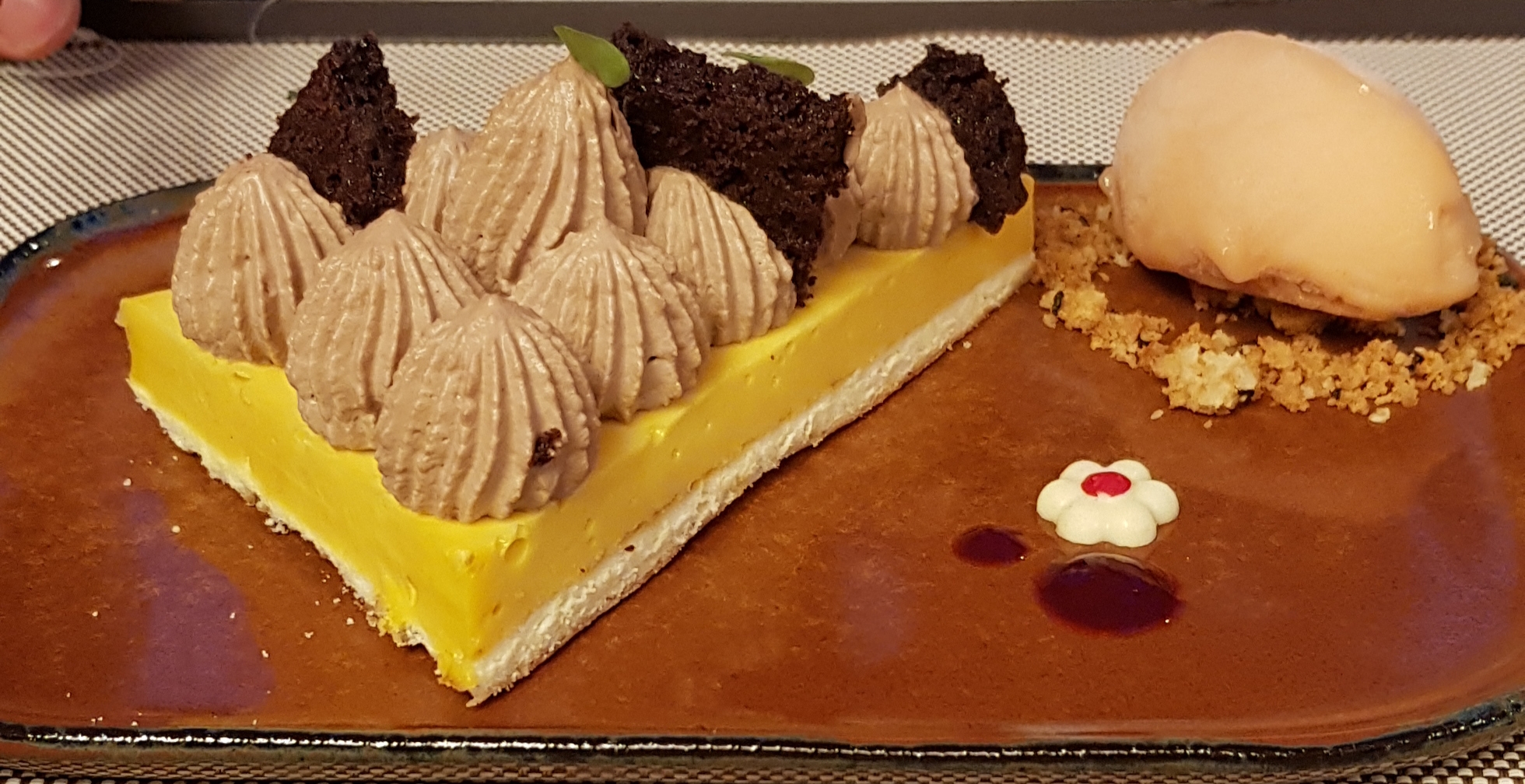 Tres jolie cadre 4 etoiles, service six étoiles timing entre chaque plat 5 étoiles, tous les plats sont excellent et bien présenter juste l entree ou le chèvre manque de caractère. Par contre, étant non-fumeur il serait judicieux de ne pas mettre de fumeurs à proximité même si c est en terrasse il serait bon de séparer les accros à la nicotine des autres personnes.