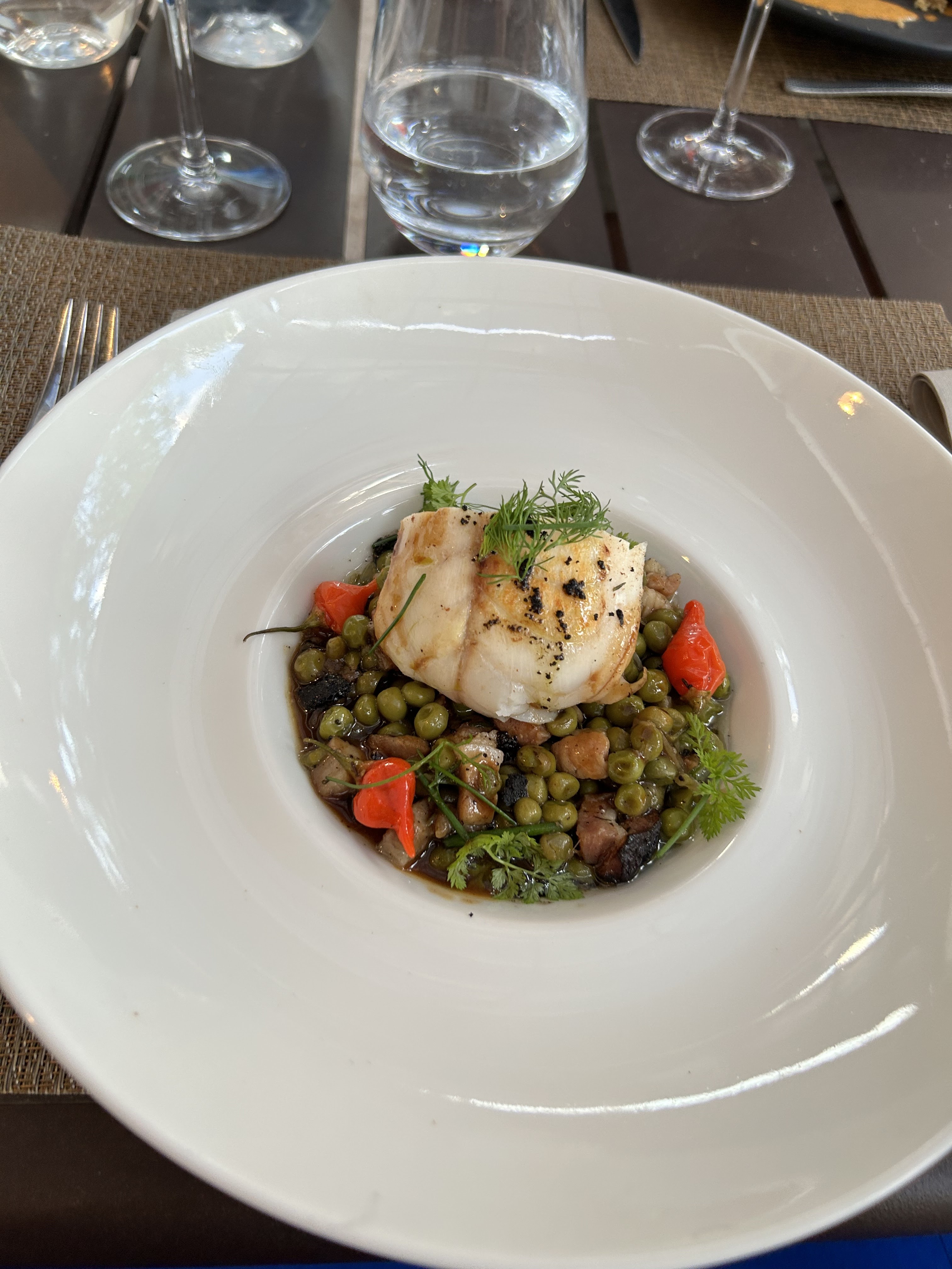 Restaurant vraiment très agréable. Le site et la vue sont superbes. Service impeccable, sympa, pro, les plats s'enchaînent parfaitement. Dans l'assiette c'est un sans faute. Ils ont su s'adapter sans problème au sans gluten ni lactose. Le vin est excellent et au prix de la cave.