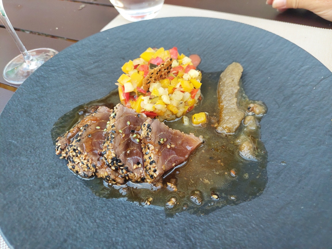 Moment magique entre terre et mer ! une table avec vue sur les vignes , un vin de tres belle couleur s accompagne aux differentes formules et la cuisine : C est juste fondant ! J oubliais : quand vous arrivez , à la reception du restaurant , vous apercevez les cuves en lumière ...