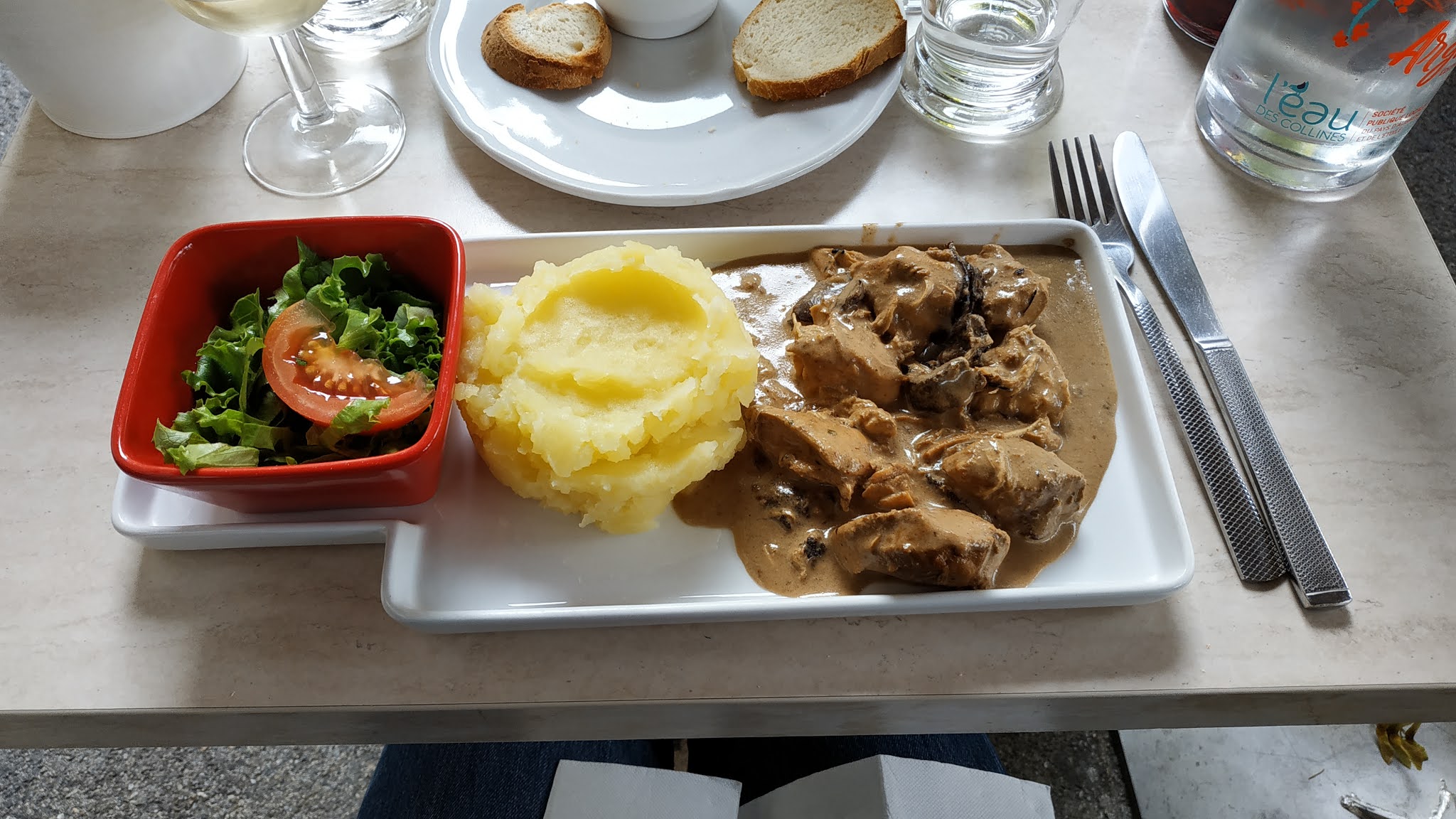 Nous y avons déjeuné mardi 29/09/2020 en couple. Nous avons été très bien accueillis, le serveur est très aimable, souriant, la patronne est très aimable, ambiance familiale ... Nous avons été installés en terrasse, pas très bruyante malgré la présence du marché. Un verre de vin blanc en apéritif, accompagné de tapenade faite maison, excellente, avec du pain frais... Plat du jour: blanquette de poulet aux cèpes, très bon, bien préparé, accompagné d'une écrasée de pomme de terre et d'une salade verte et quartier de tomate. Rien d'exceptionnel, mais c'est bon, c'est copieux, et le rapport qualité / prix est excellent, 11,50 € le plat du jour ! Le pain est frais, le vin rouge en pichet est de bonne qualité. Merci à toute l'équipe...