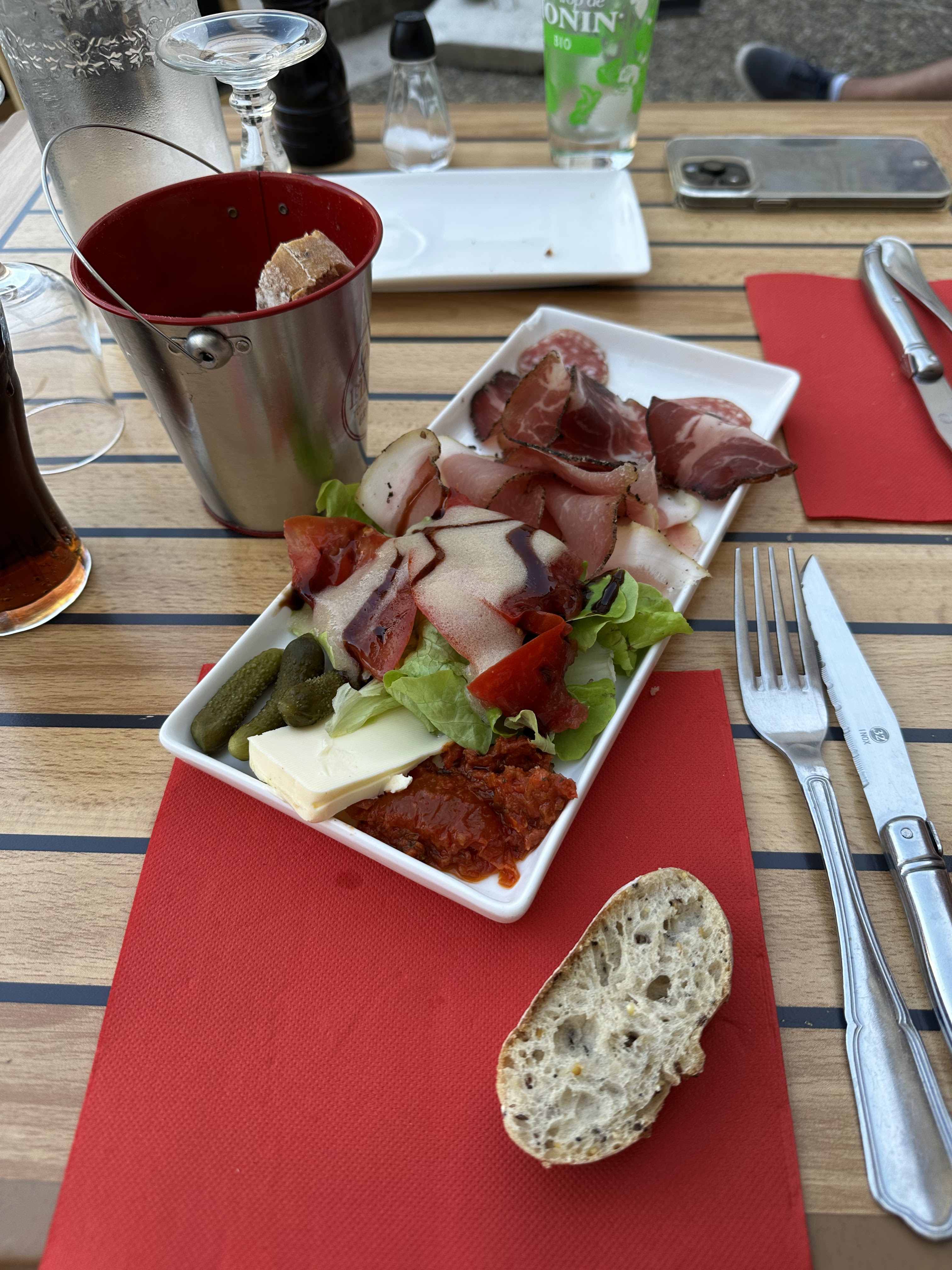 👍Très belle assiette en entrée de charcuterie et gourmande 👎Côtes d'agneau trop cuites donc sèches 👎Entrecôte pas de grande qualité 👎Frites pas terribles 👎Salade d'accompagnement sans aucun intérêt gustatif Juste bon pour les touristes !