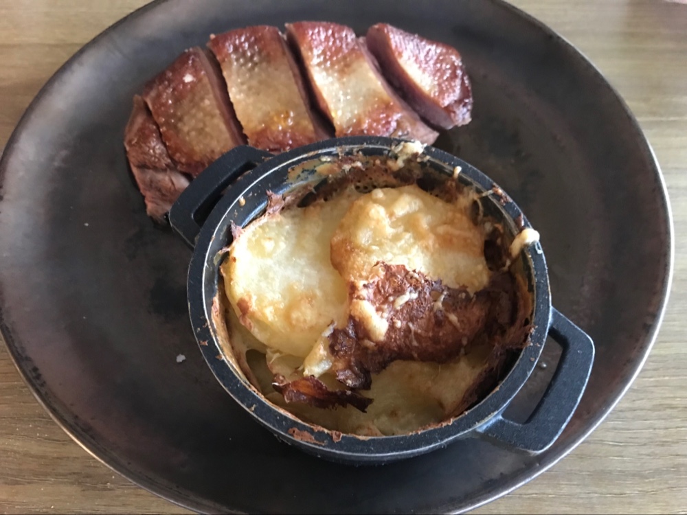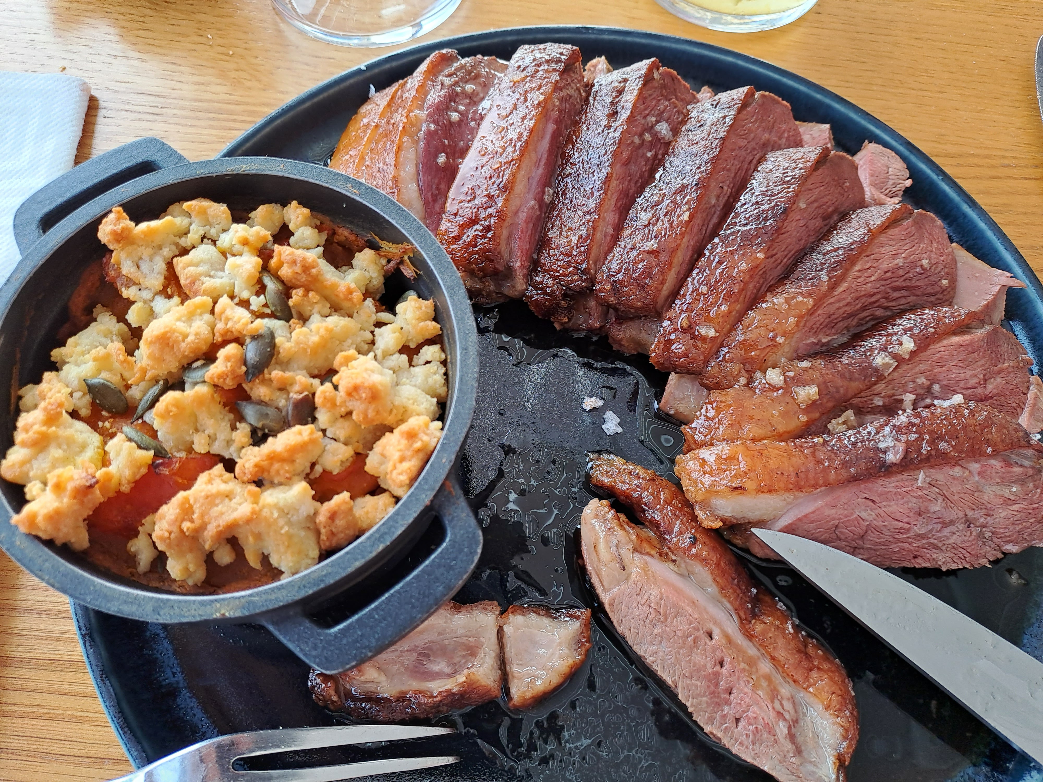 Suprême de canne très ordinaire. Fade, nous demandons une sauce on nous apporte un bouillon de volaille sans gout. Cerise sur le gâteau, la tarte Tatin revisitée (les soeurs Tatin doivent se retourner dans leur tombe) une pomme froide et dure coupée en 3 sur un biscuit (bof) et une boule de glace. Quelle cuisine et tout ça un peu cher. Voilà....