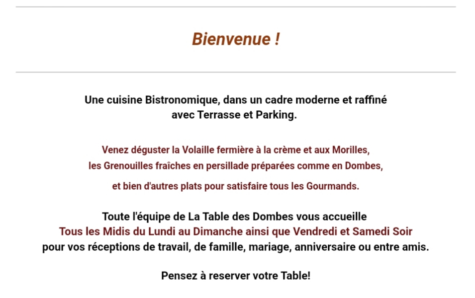 Repas du jour de l'an à emporter: nous avons choisi La Table des Dombes pour ce repas familial à la maison et en sommes extrêmement ravis. Tout était excellent, un beau menu très bien cuisiné, dans les bonnes proportions. Belle organisation pour la vente à emporter, tous les conseils adaptés pour bien réchauffer les plats, parfait!