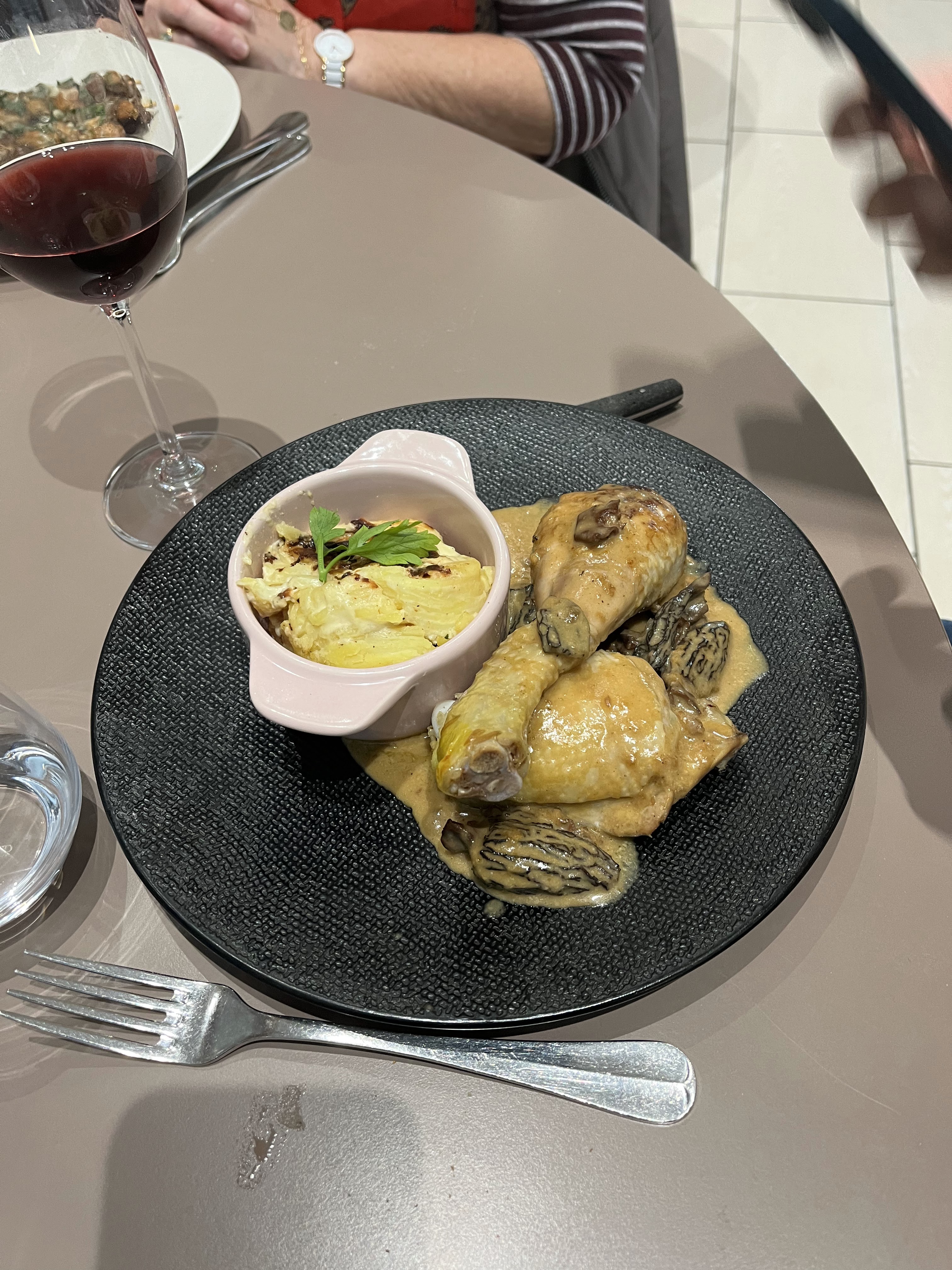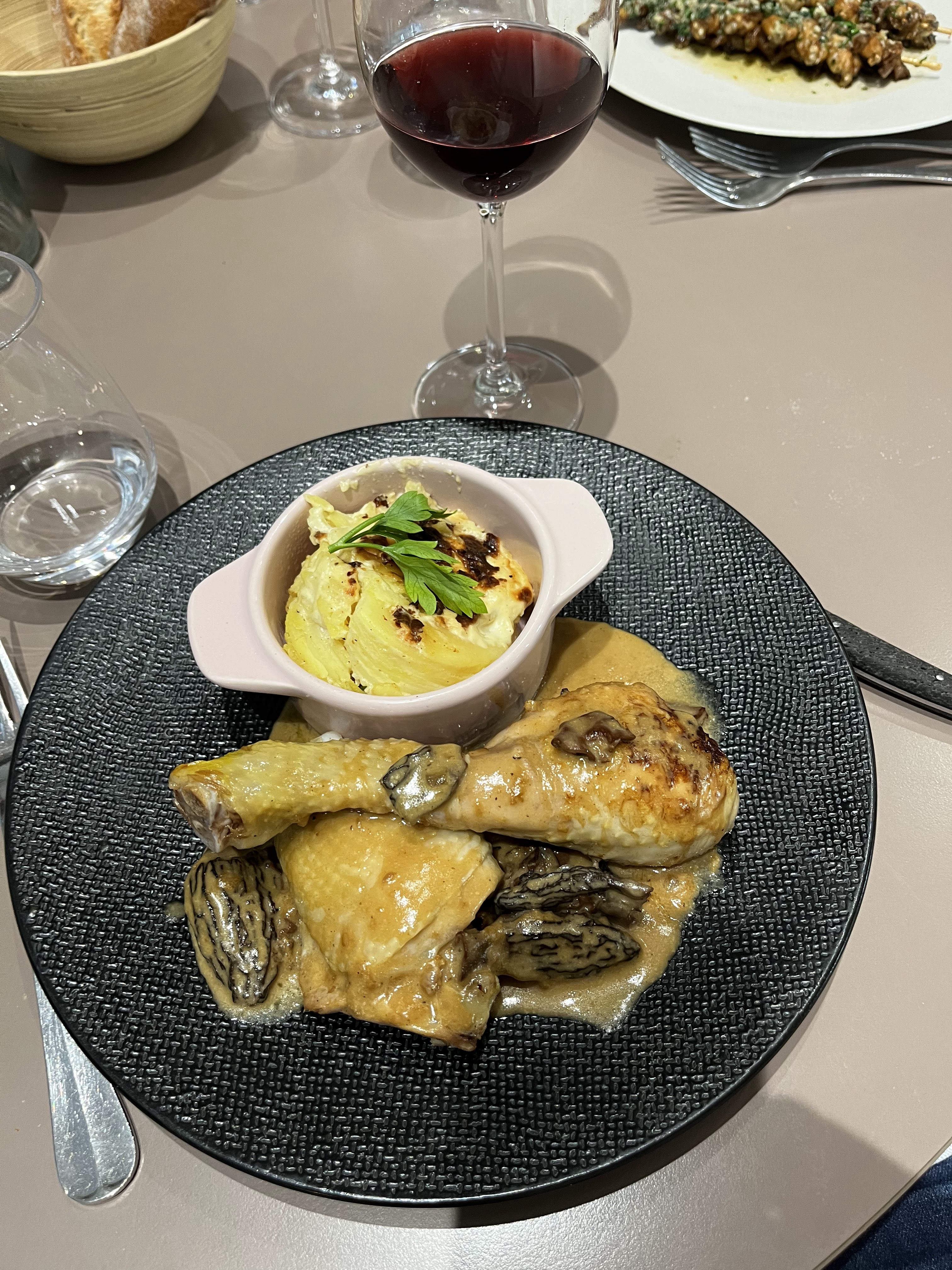Plat a emporter pour noel. Tres bon poulet aux morilles. Il n y a rien a dire au niveau du goût. Seul bemol pour un plat a emporter, manque de sauce, et surtout la portion de gratin dauphinois etait ridiculement faible, sinon c etait tres bon