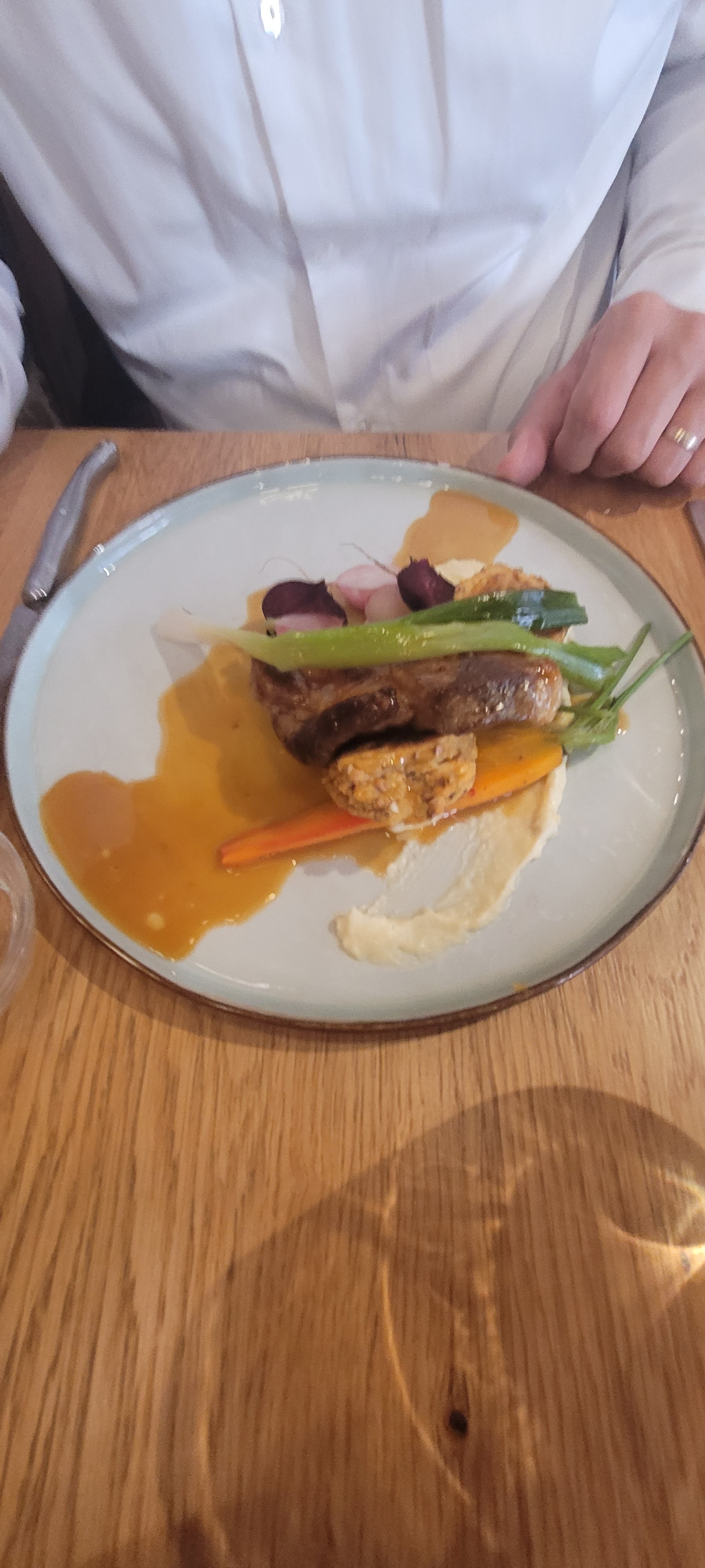 Nous avons pris le menu entrée/plat/dessert avec les 2 choix possibles à chaque fois. Ravioles à l'angus et dessert clafoutis abricot glace au sureau particulièrement bons. Lapin un tout petit peu sec. Service avec sourire apprécié.