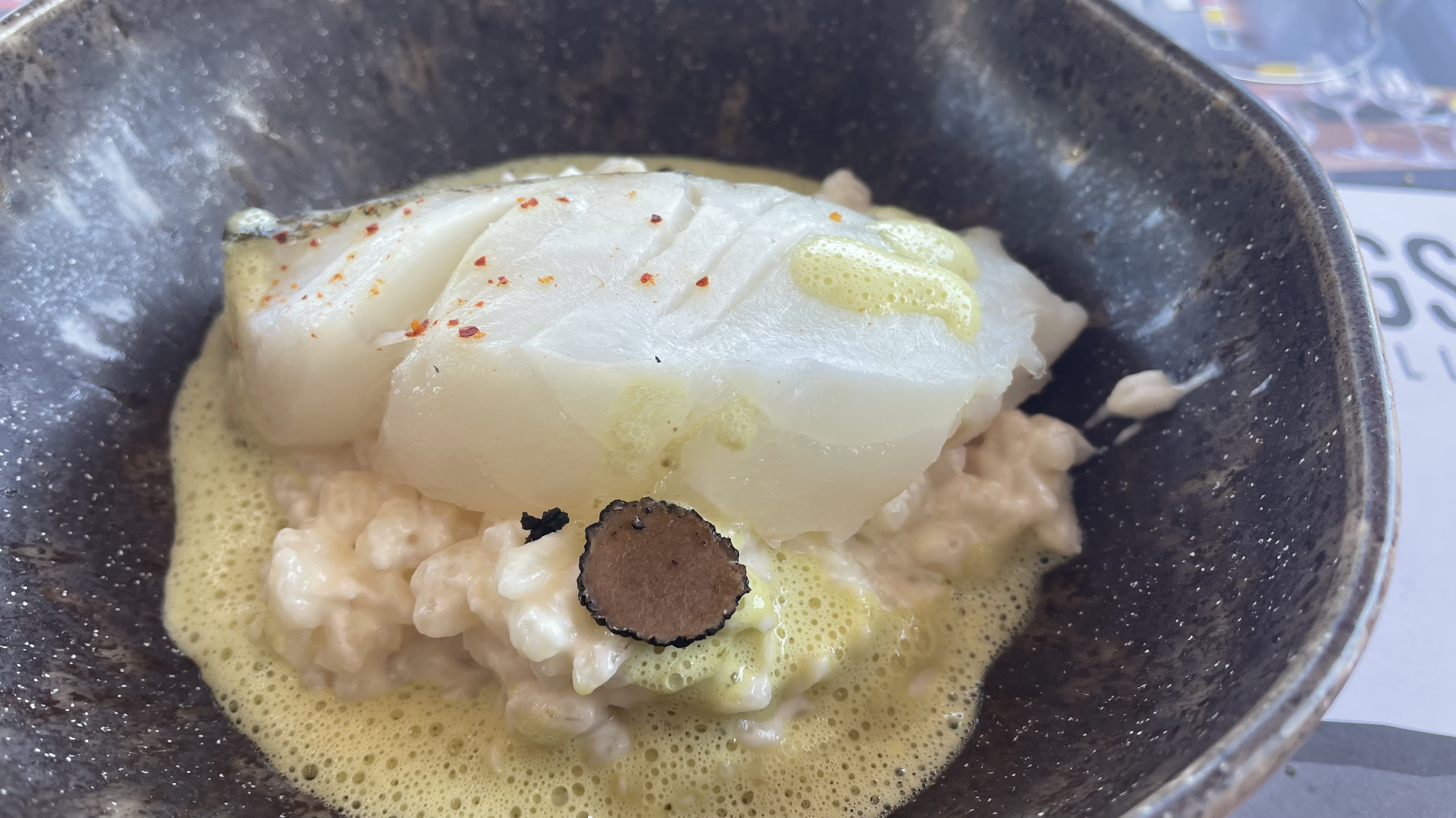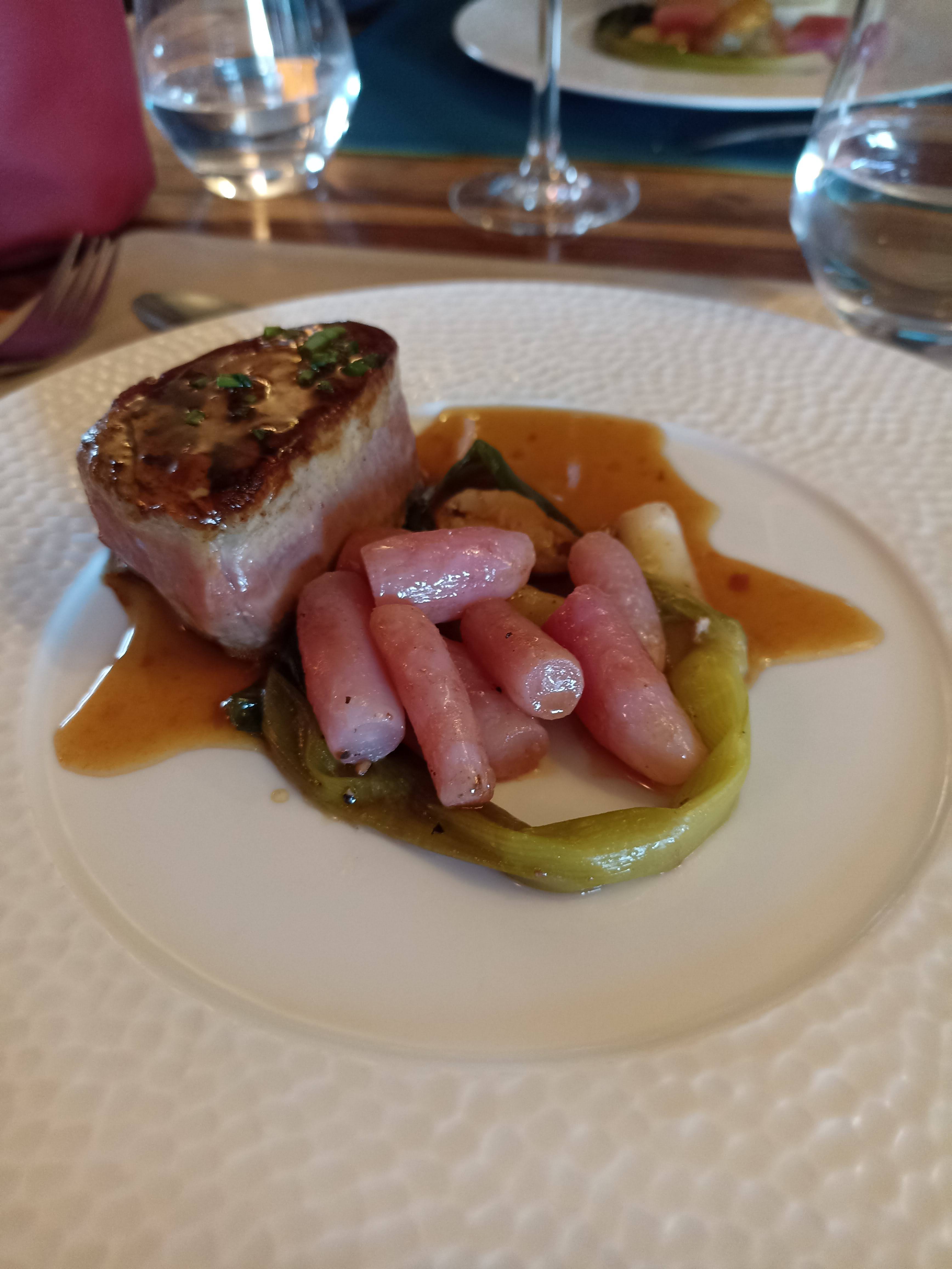 Très dessus le foie gras commencé a fondre il était chaud .g pris de la lotte a pene cuite catchouteuse purée d aubergine fade betterave rouge a peine cuite avec la courgette idem et pas de sel et poivre sur la table je suis dessus je ne le recommande pas. Et les fleurs en decors je v bien une mais c presque un bouquet dans les assiettes.
