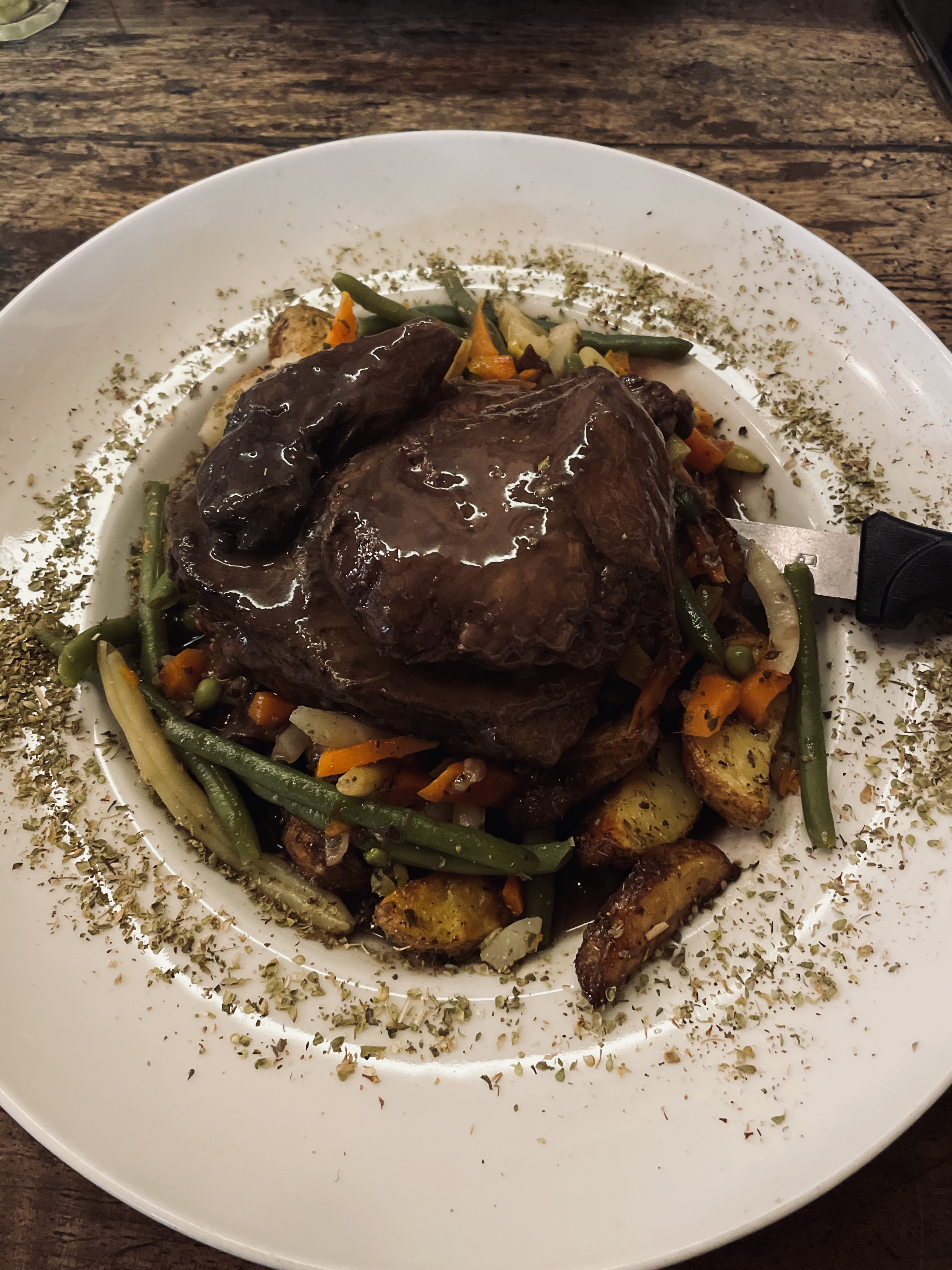 Joli jarret de porc cuit avec pommes de terre rôties et légumes vapeur. Les portions étaient très généreuses, nous étions absolument rassasiés après. Mais nous avons décidé d'essayer l'un des desserts et avons commandé un gâteau Forêt-Noire. C'était délicieux et suffisant pour deux à trois portions ! La sélection de boissons était très abordable et comportait des vins de la région locale. Les serveurs étaient très sympathiques et parlaient anglais, et étaient très excités lorsque nous parlions quelques mots en français. Enfin, ils ont d'adorables lapins comme mascottes du restaurant 🐇 . Pendant une seconde, j'ai pensé qu'ils auraient pu être servis comme nourriture. J'aurais été triste s'ils l'avaient fait. Dans l’ensemble, c’est une excellente expérience pour un agréable brunch français du dimanche.