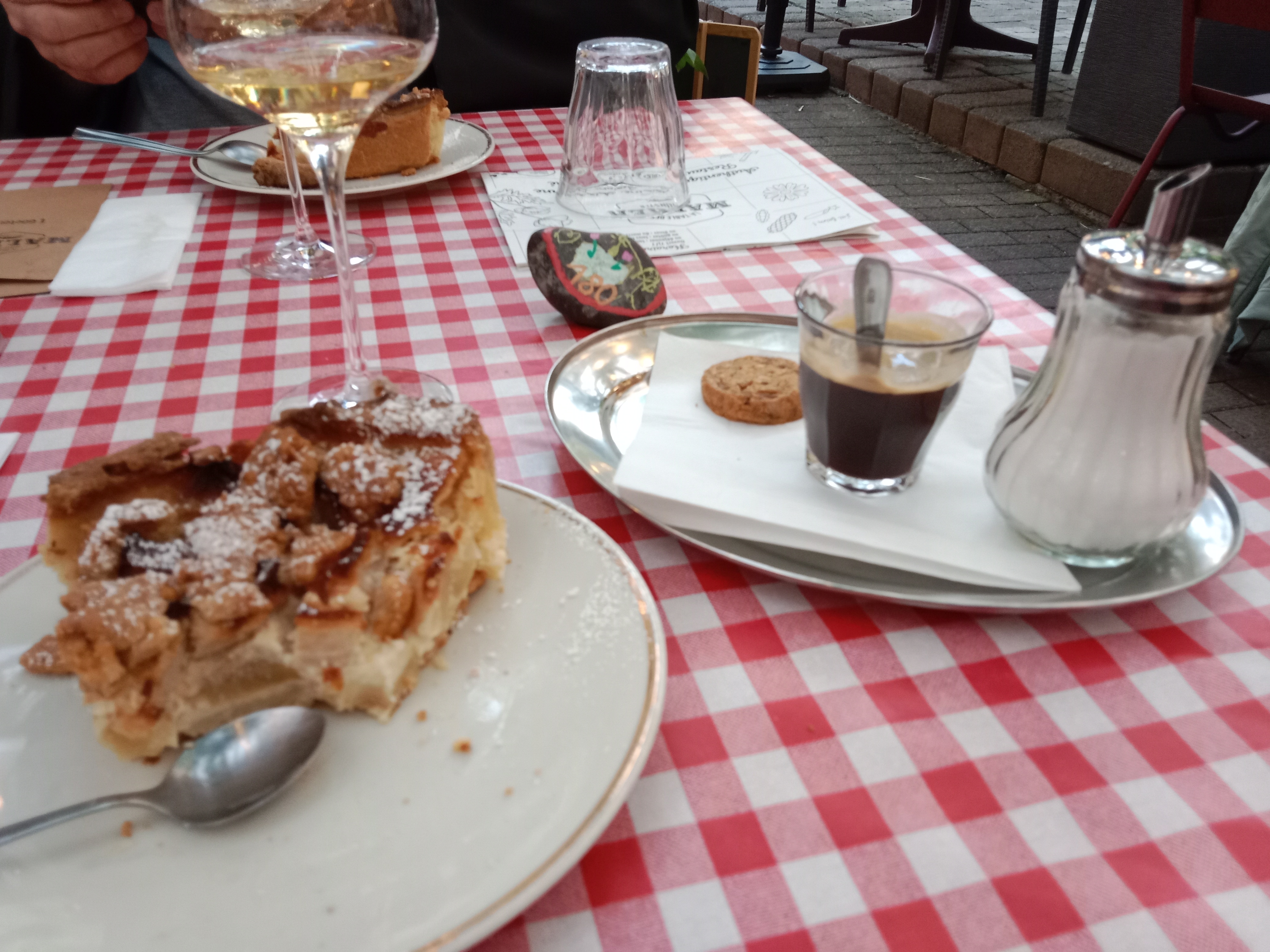 Il faut garder un peu de place pour le dessert. Excellent et copieux. Terrasse très sympa avec vue sur nos vélos.