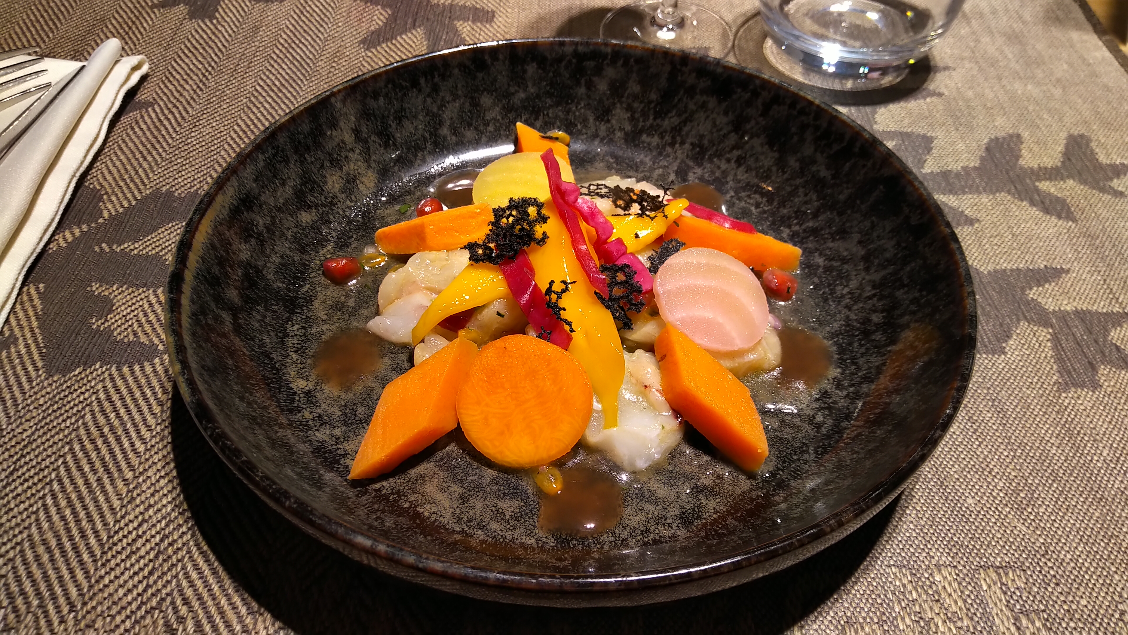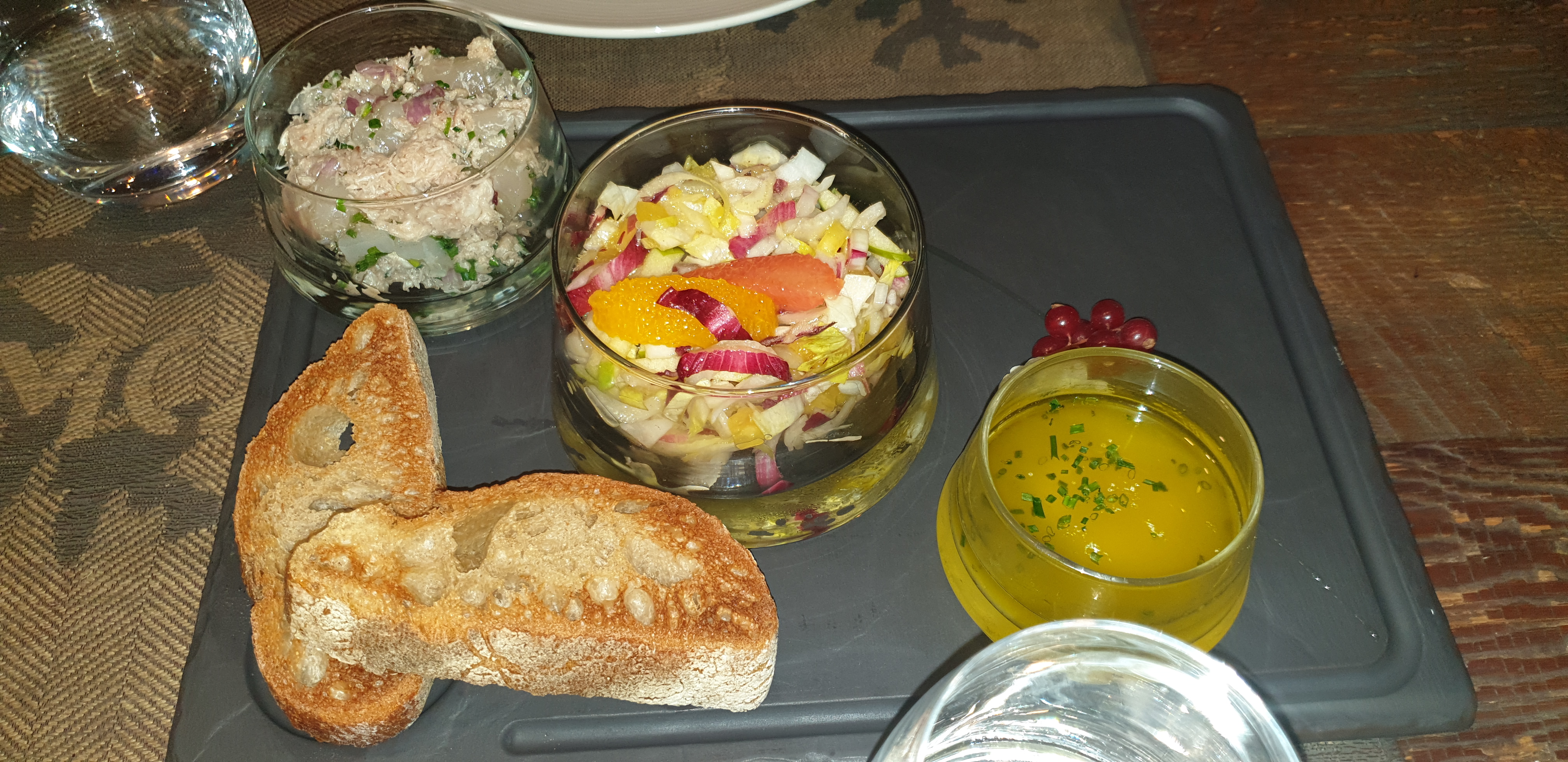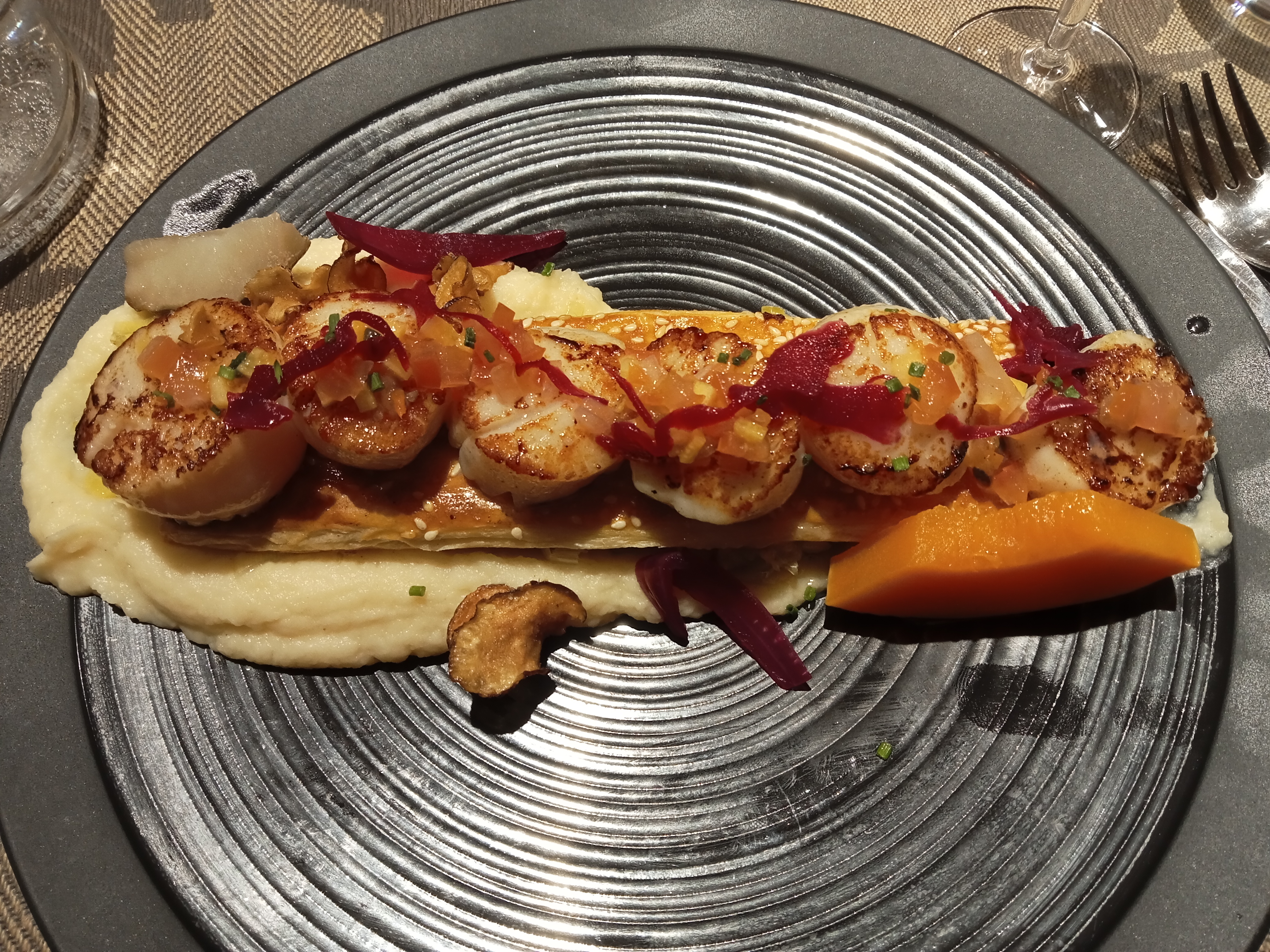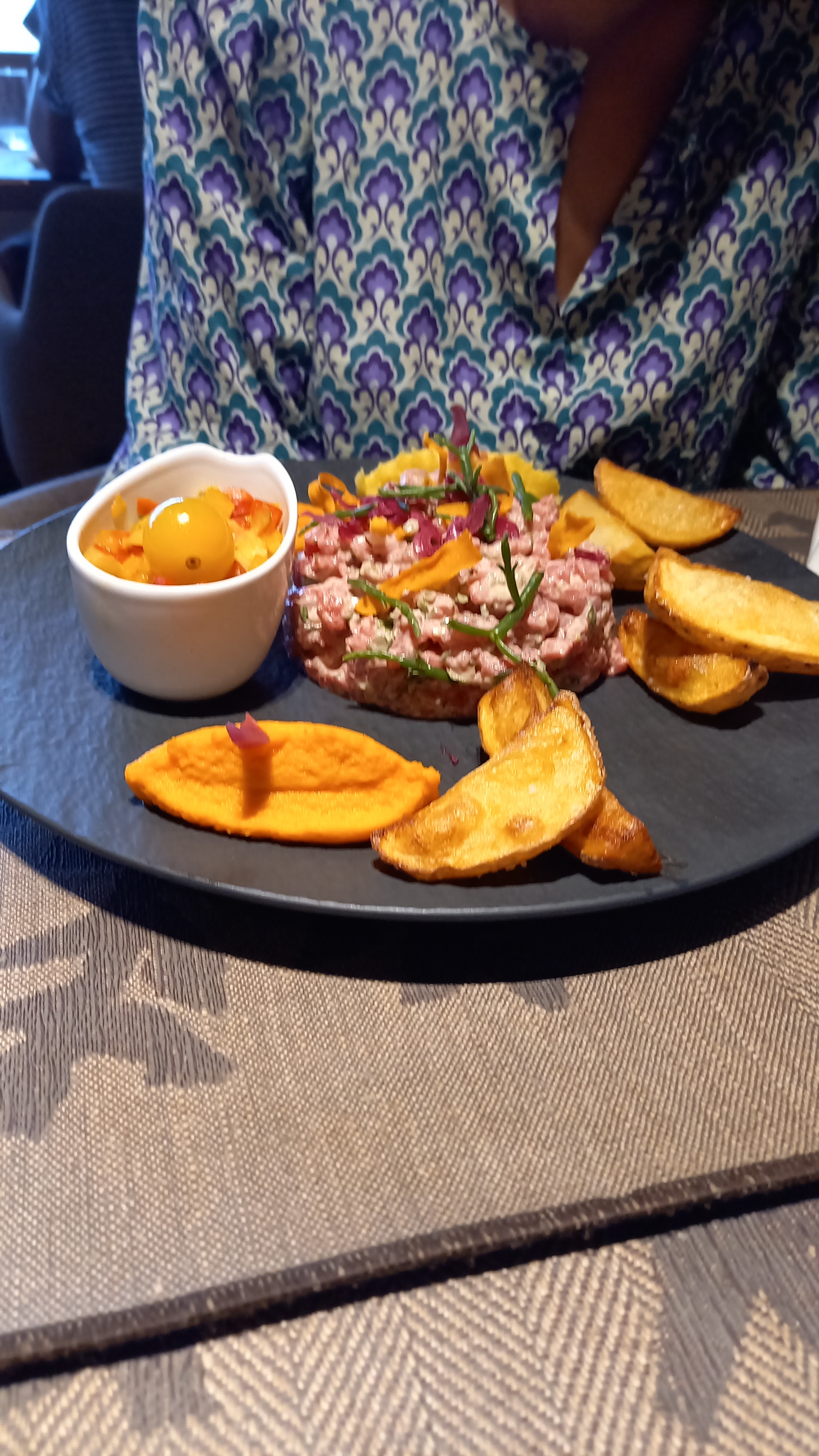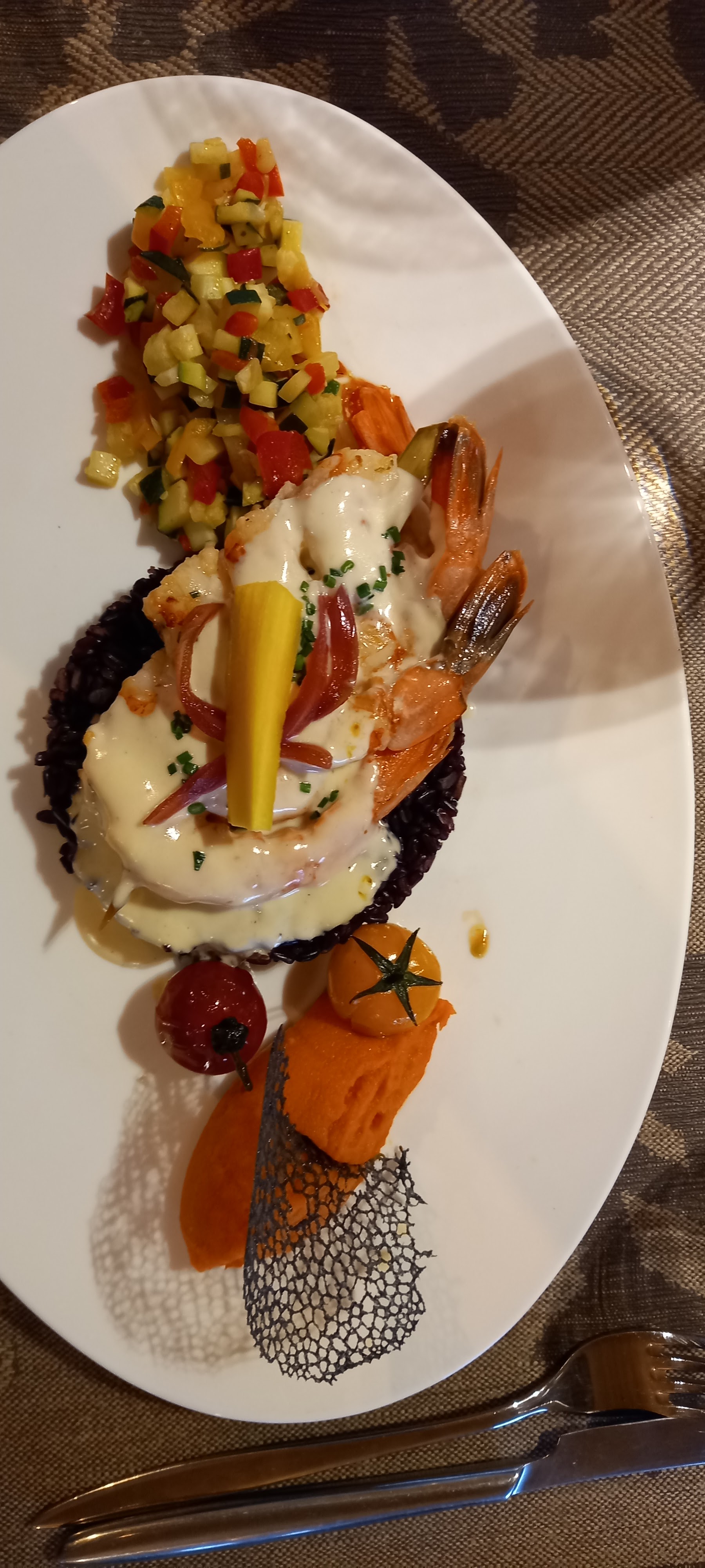 Nous avons correctement mangé, mais c'est selon moi trop cher pour ce que c'est. Le restaurant se donne des allures de haut de gamme mais il n'en est rien. Nous avons remarqué que la plupart des plats partagent les mêmes accompagnements, que ce soit les viandes ou les poissons, laissant peu de place à un élément singulier dans votre assiette. Bref, à essayer pour le cadre sympa, mais sans être trop exigeant.