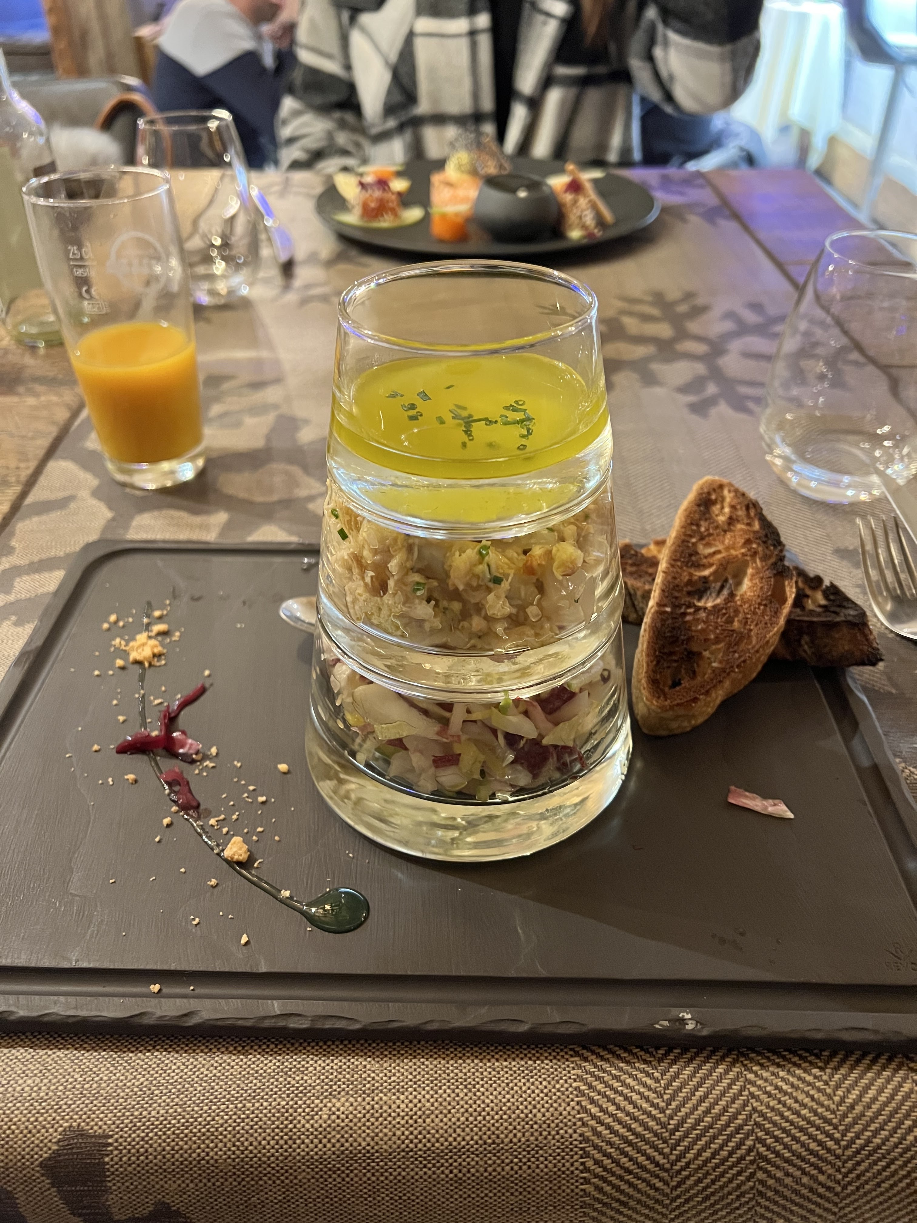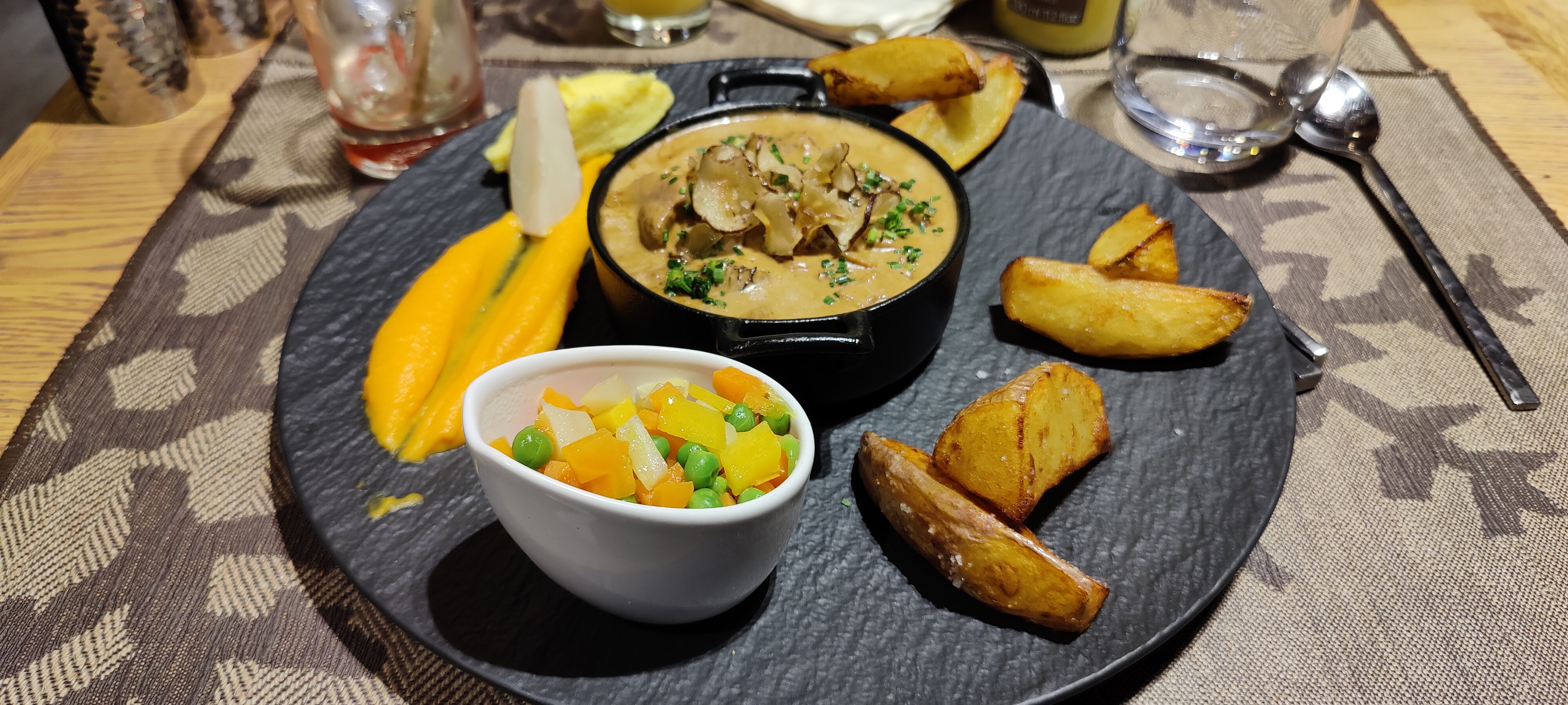 Bonjour, le restaurant a un jolie cadre, cela doit être encore plus plaisant l'hiver car la salle a une belle vu sur la montagne. J'ai choisis en plat principal les saints Jacques et c'était parfaitement cuisiné. De même pour le dessert avec le trio de pana cota et la présentation très original. Je recommande vivement car les plats sont très bons et les portions correct. J'ai également goûté l'entrecôte de mon voisin de table et la viande était fondante avec ça cuisson parfaite.