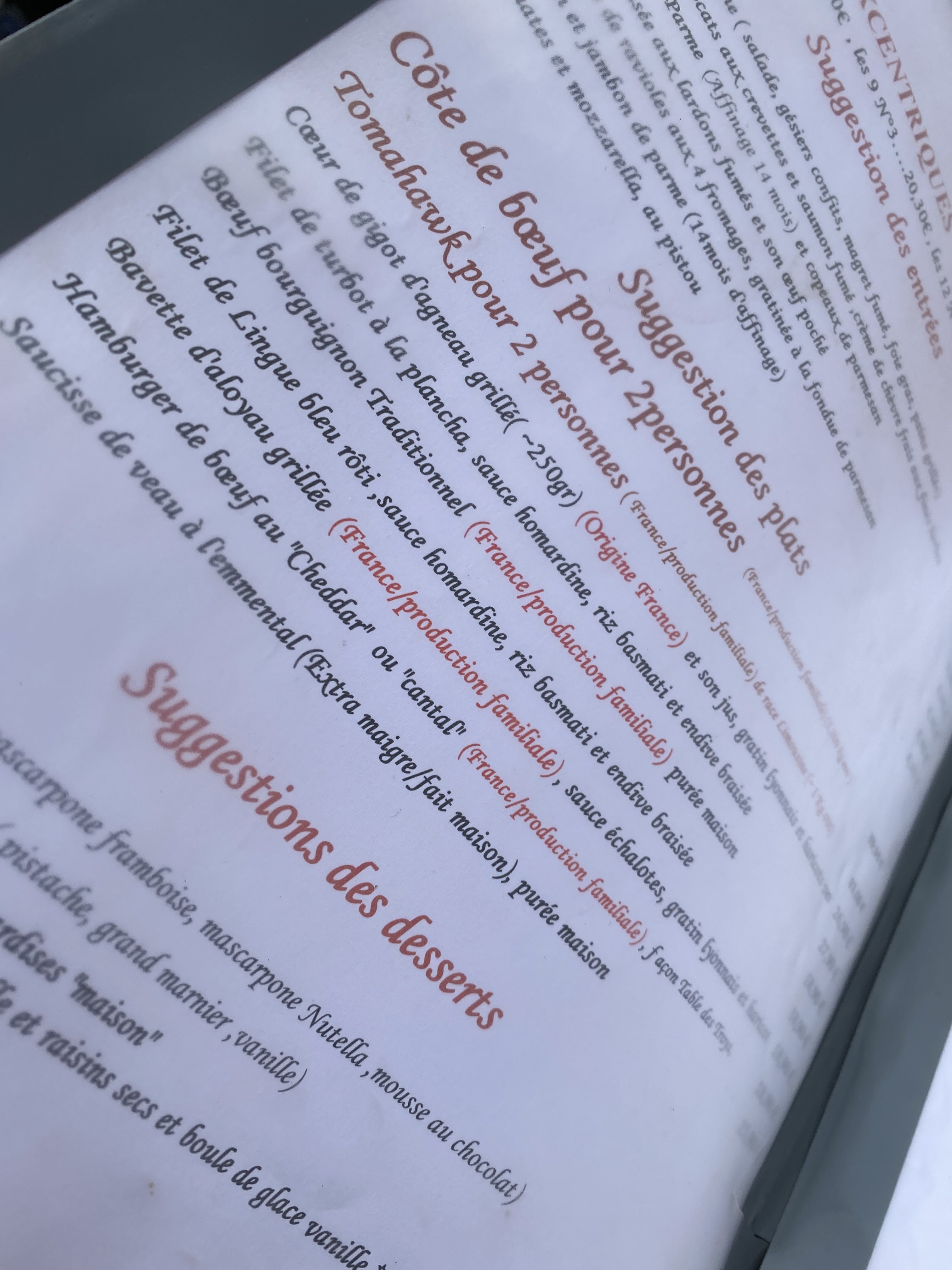 Le menu à 28,90 est pas mal du tout! L os a moelle est copieux, le pavé de bœuf est savoureux et l ile flottante est à tomber! Le personnel est drôle et aux petits soins!