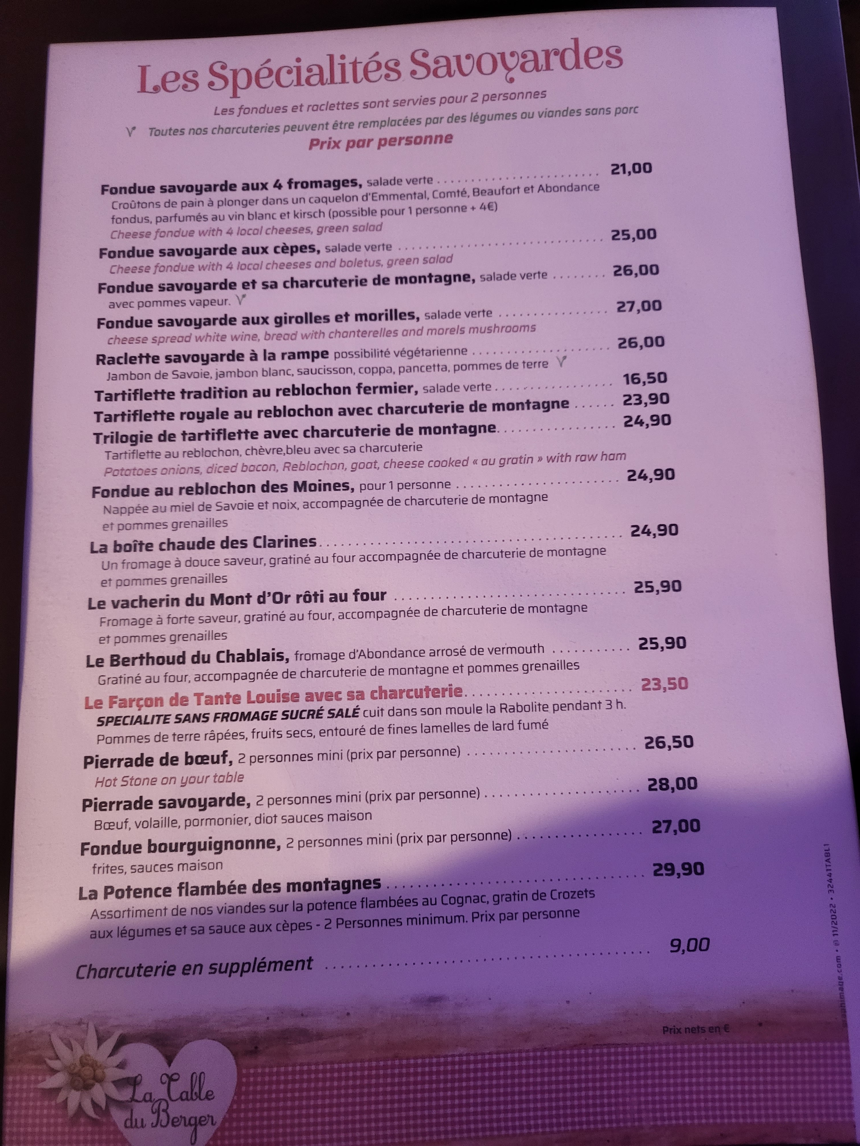La fondue était très bonne. Les prix était assez élevé mais comme dans toutes les stations. Le restaurant est charmant bien qu'un peu petit, nos coudes se touchaient avec ceux du voisin !
