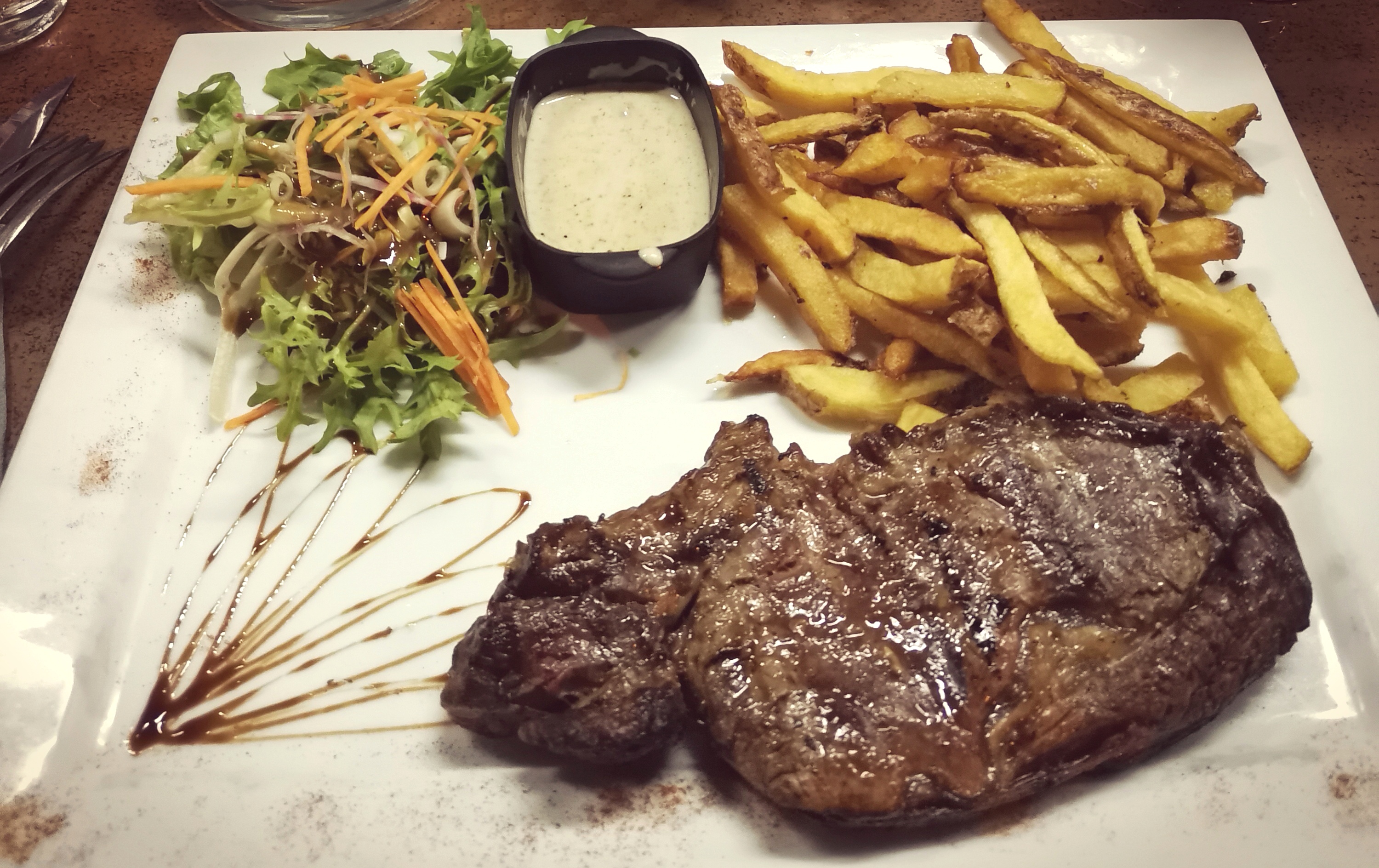 Le nom du restaurant laisse présager une viande parfaite, elle était bonne mais les accompagnements un peu justes, et nous avons réclamé le repas du petit non servi ainsi que ma boisson, petit bémol mais laissons s'installer le nouveau proprio peut-être handicapé par ce virus qui peut modifier des plans. La côte à l'os de 1,2 kg est sûrement une option plus attrayante.