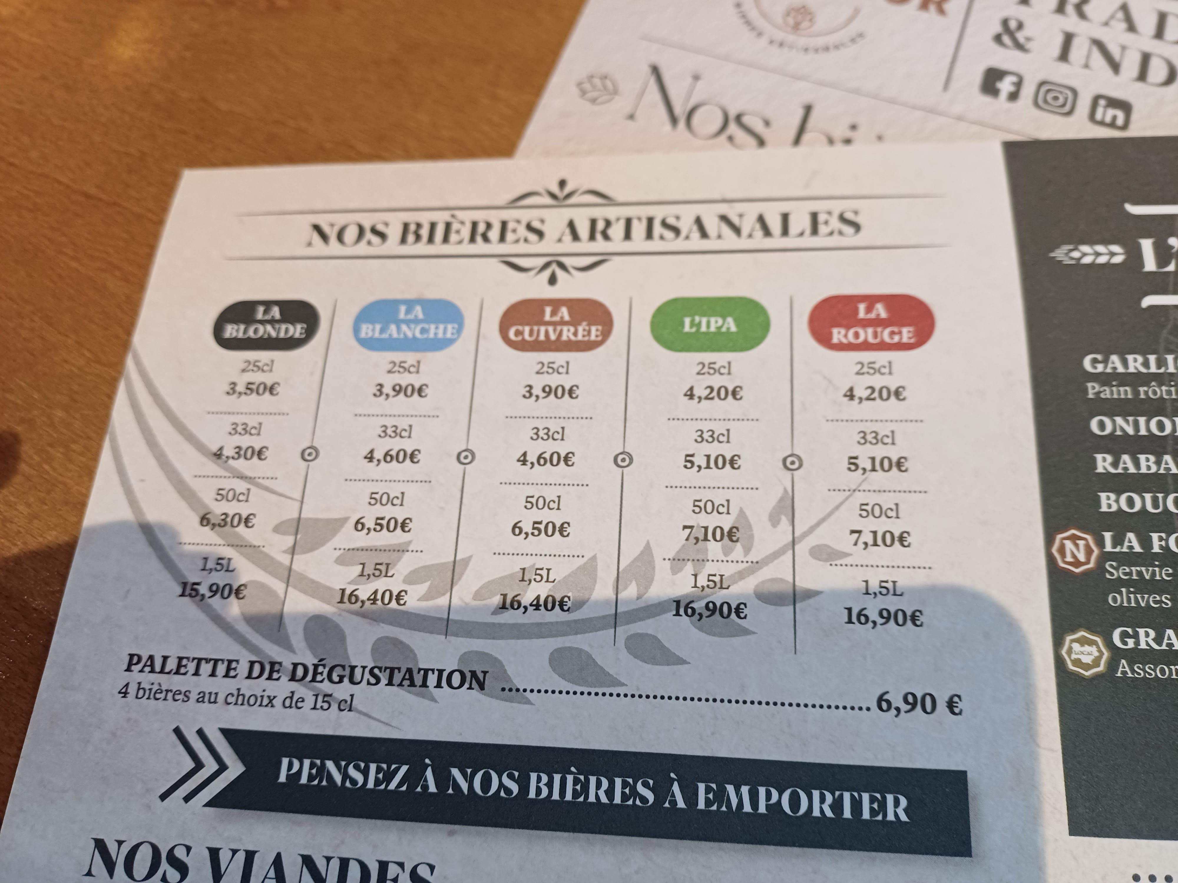 Établissement qui s'est vraiment dégradé. (Nous étions des habitués) La dame à la caisse avec des lunettes est hautaine et ne connaît manifestement pas ses propres bières qu'elle confond (dommage pour un brasseur) Serveur toutefois sympa Je ne recommande pas