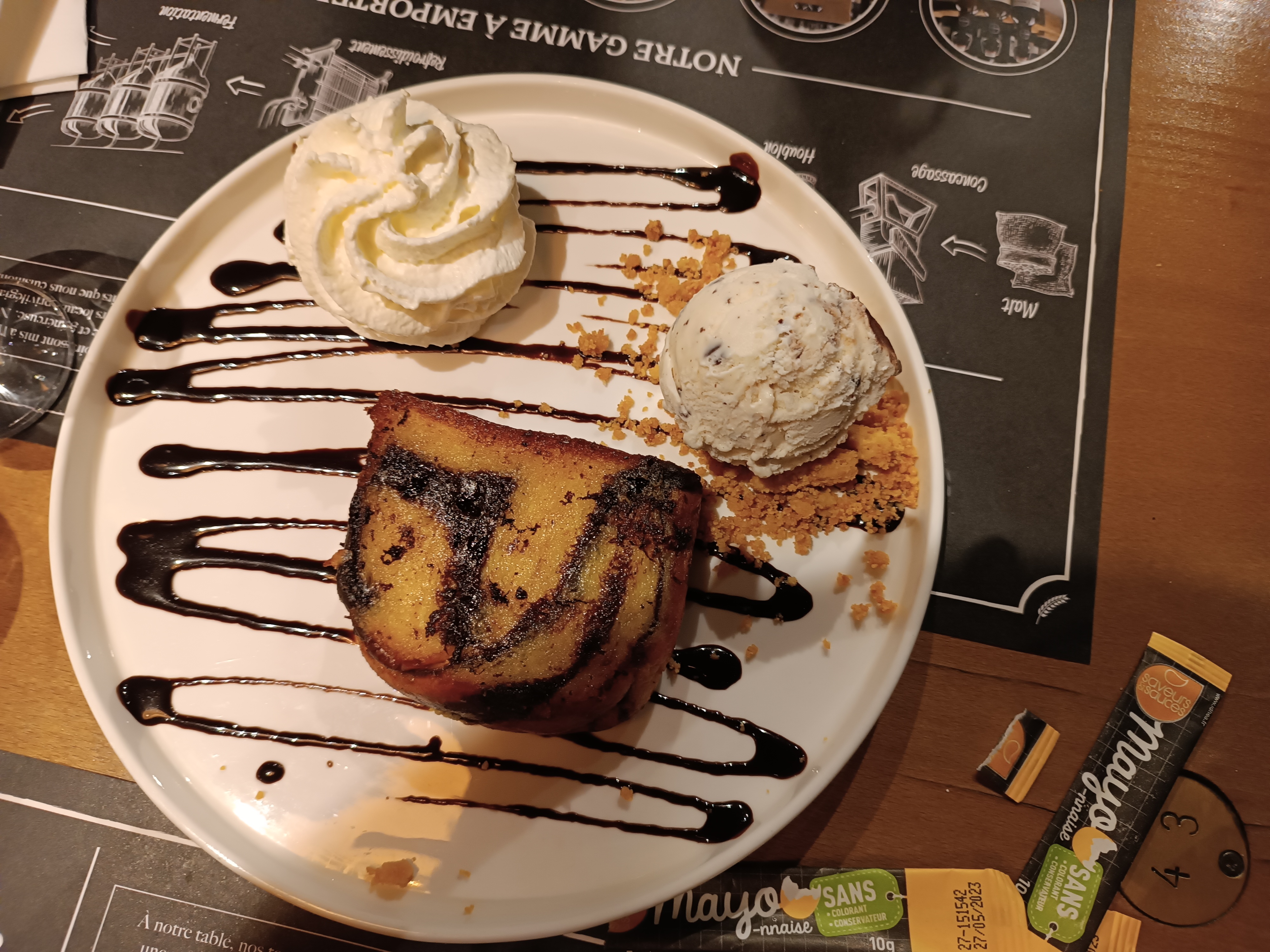 Accueil et service au top, par contre on ne peut pas dire la même chose de la Qualité des plats...🤨. J'ai commandé une carbonnade flammande, il serait bien que le cuisinier revise la recette ! On m'apporte une assiette creuse avec un bouillon dans lequel nage des morceaux de viande, pommes de terre et carottes, on se rapproche plutôt du pot au feu, aucun goût, très très déçue. Bière blanche très bonne.
