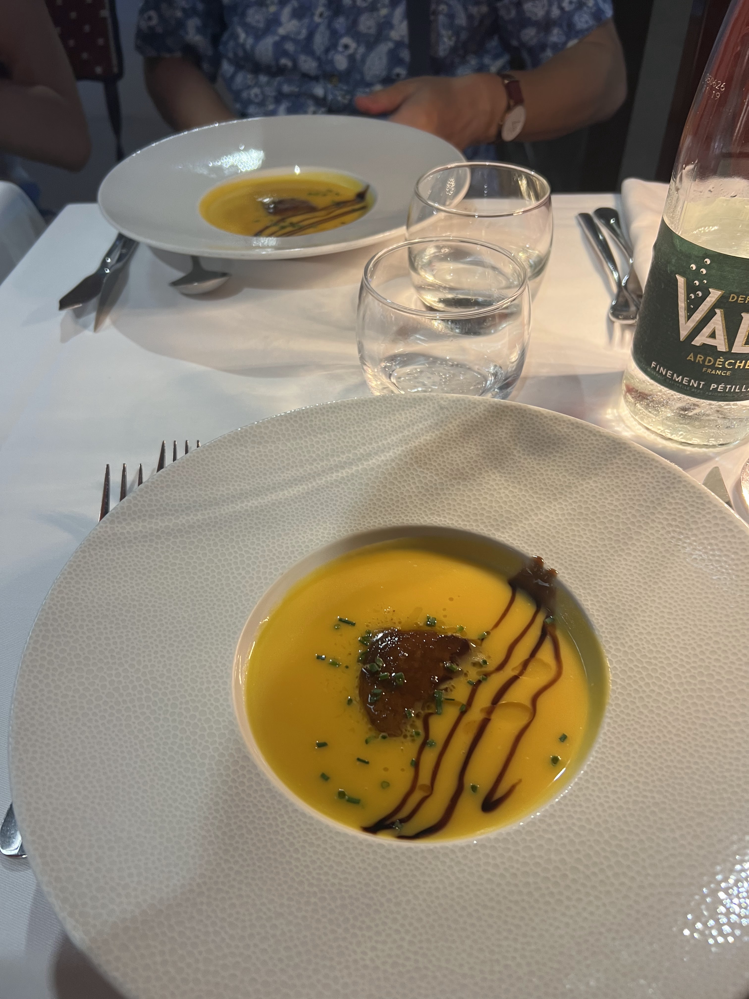 Il s'agit d'un petit restaurant intime avec un menu fixe pour le dîner. Au début, j'hésitais car notre famille de 8 personnes était presque en compétition pour se surpasser. Chaque plat des 4 servis a été universellement apprécié par notre équipage. La soupe aux carottes avec une seule délicieuse coquille Saint-Jacques a dominé le repas du soir et nous a tous époustouflés. Suivi d'un plat de saumon incroyable, de viande également incroyable et enfin, d'une tarte aux pommes avec une glace riche et crémeuse. Le petit cadre dégageait une atmosphère française par excellence que notre aimable serveur a rehaussée par son service de qualité supérieure. C'est un endroit spécial!