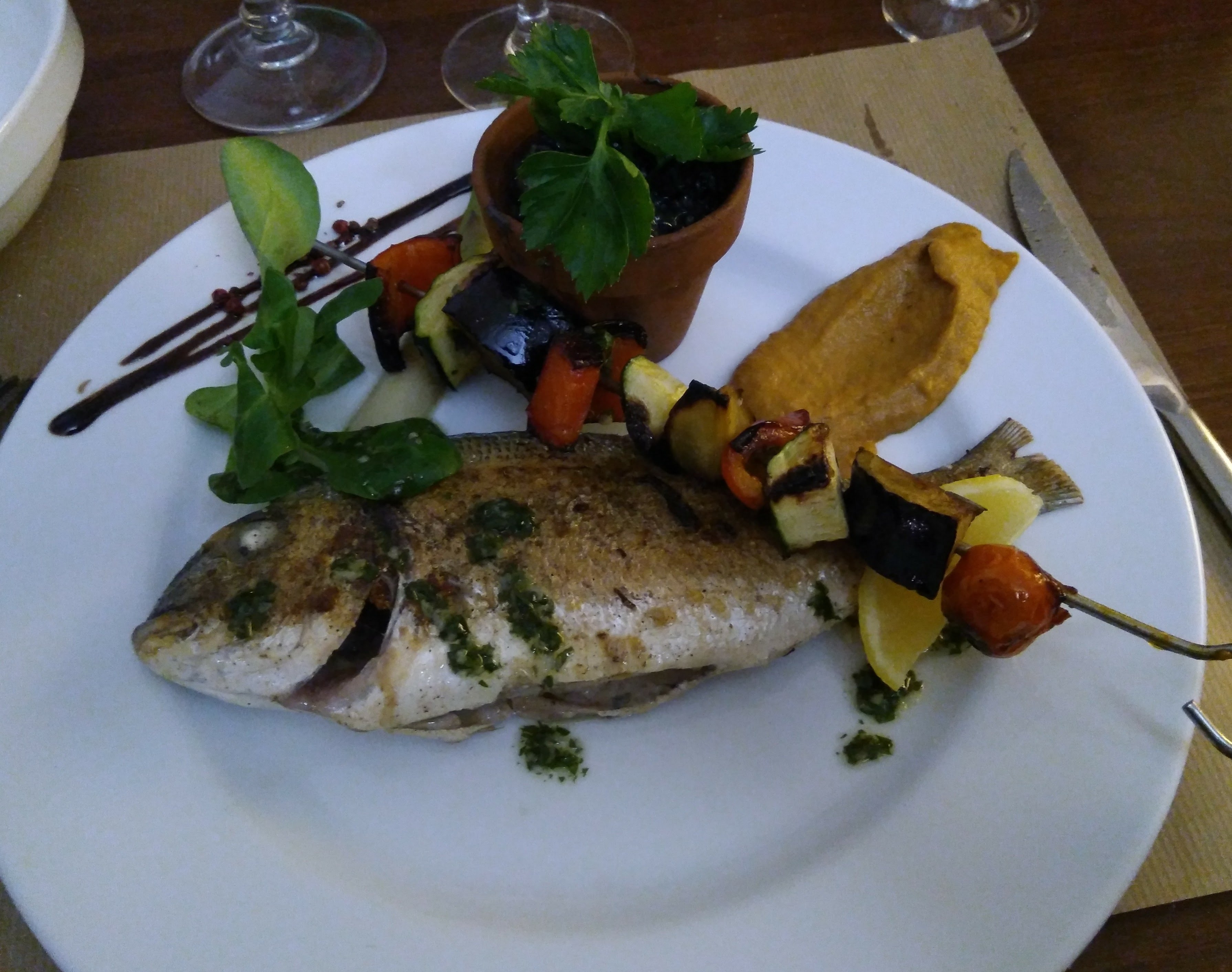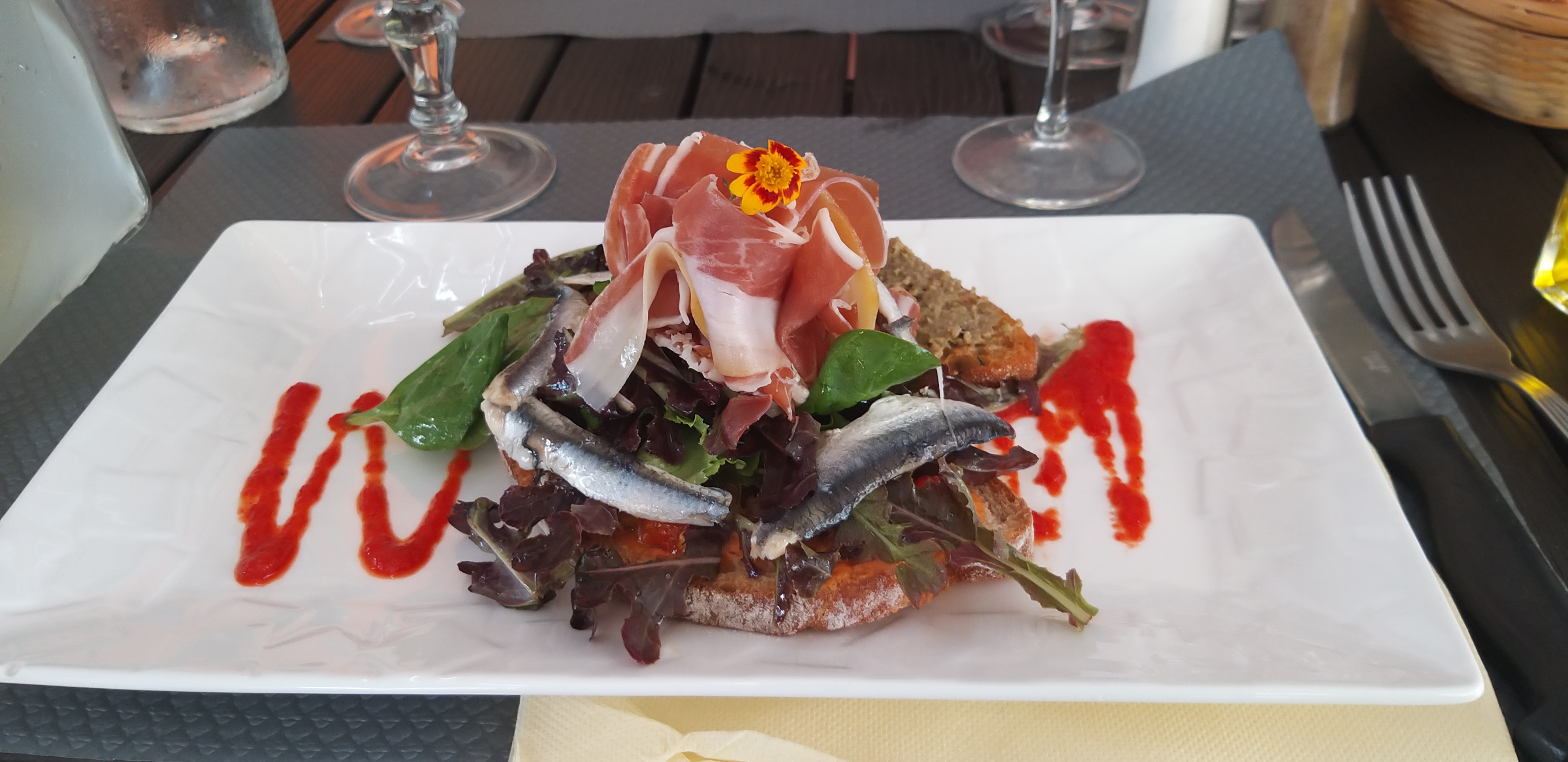 Cette table nous a été recommandée, et à raison. Le couple gérant est fantastique de gentillesse, avenant et aux petits soins. Ma femme a adoré le dos de cabillaud en crumble de chorizo et olives, avec son risotto au chorizo et ses petits légumes. Mon entrecôte était aussi excellente, cuite bleue ET chaude comme peu de restaurant savent le faire. Ma fille a même mangé son steak en entier, alors qu'elle est d'ordinaire plutôt difficile avec les viandes rouges, c'est pour dire la qualité de la viande servie. Nous avons été ravis, et allons surement essayer d'y retourner durant notre séjour.