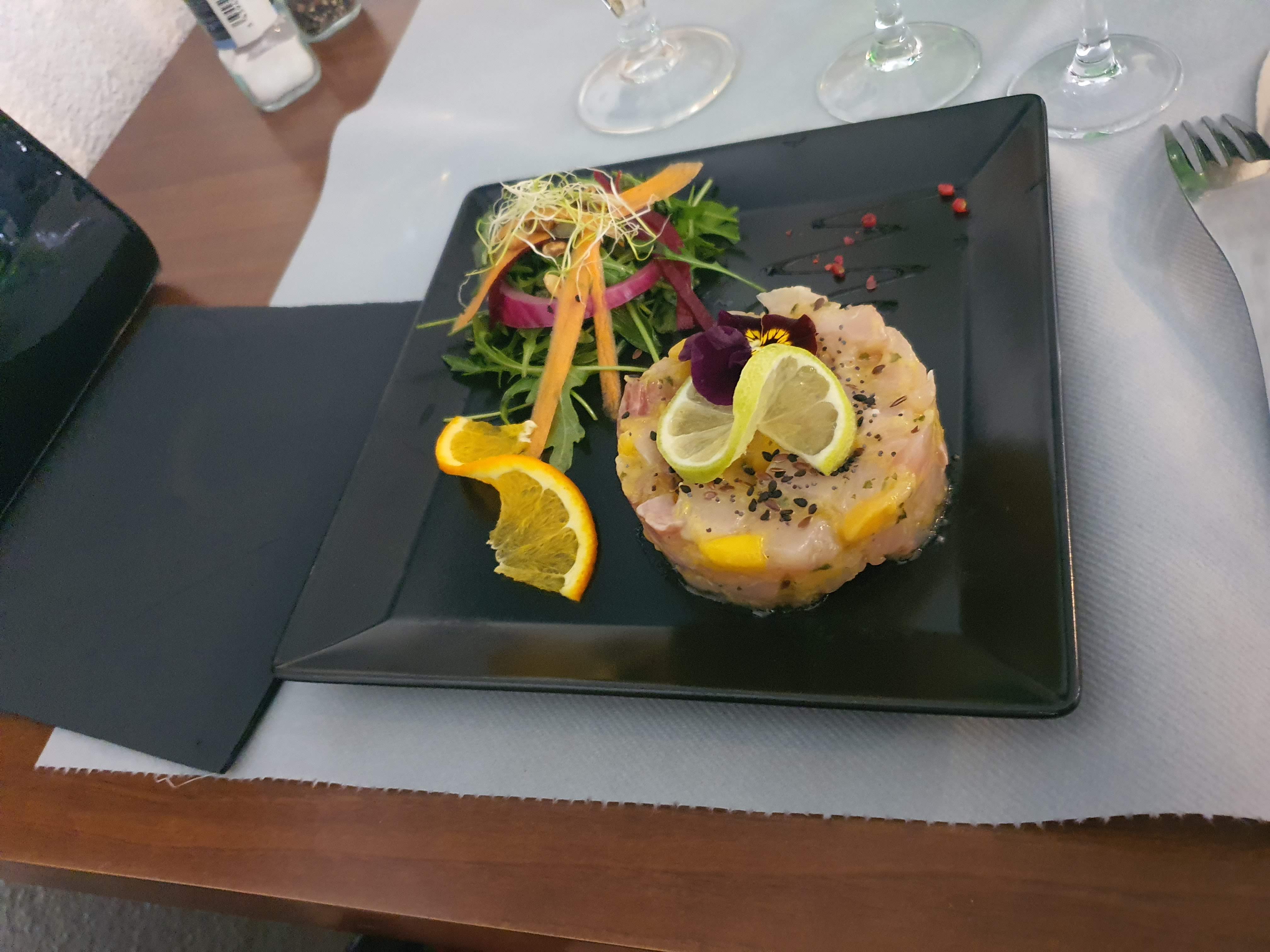 Personnel aux petits soins et qui sait vous donner envie des plats à chaque explication. N'hésitez pas à leur demander la description de la carte. On a pris le premier menu à 27,80 €. Très goûtu. Belle présentation. Beaucoup de saveurs et des mets qui changent (espadon pour la pêche du jour avec de la mangue entre autre). La photo est l'entrée : tataki de thon. Tout est fait maison et ça se ressent. C'est un 10/10 pour nous. Je recommande donc vivement !