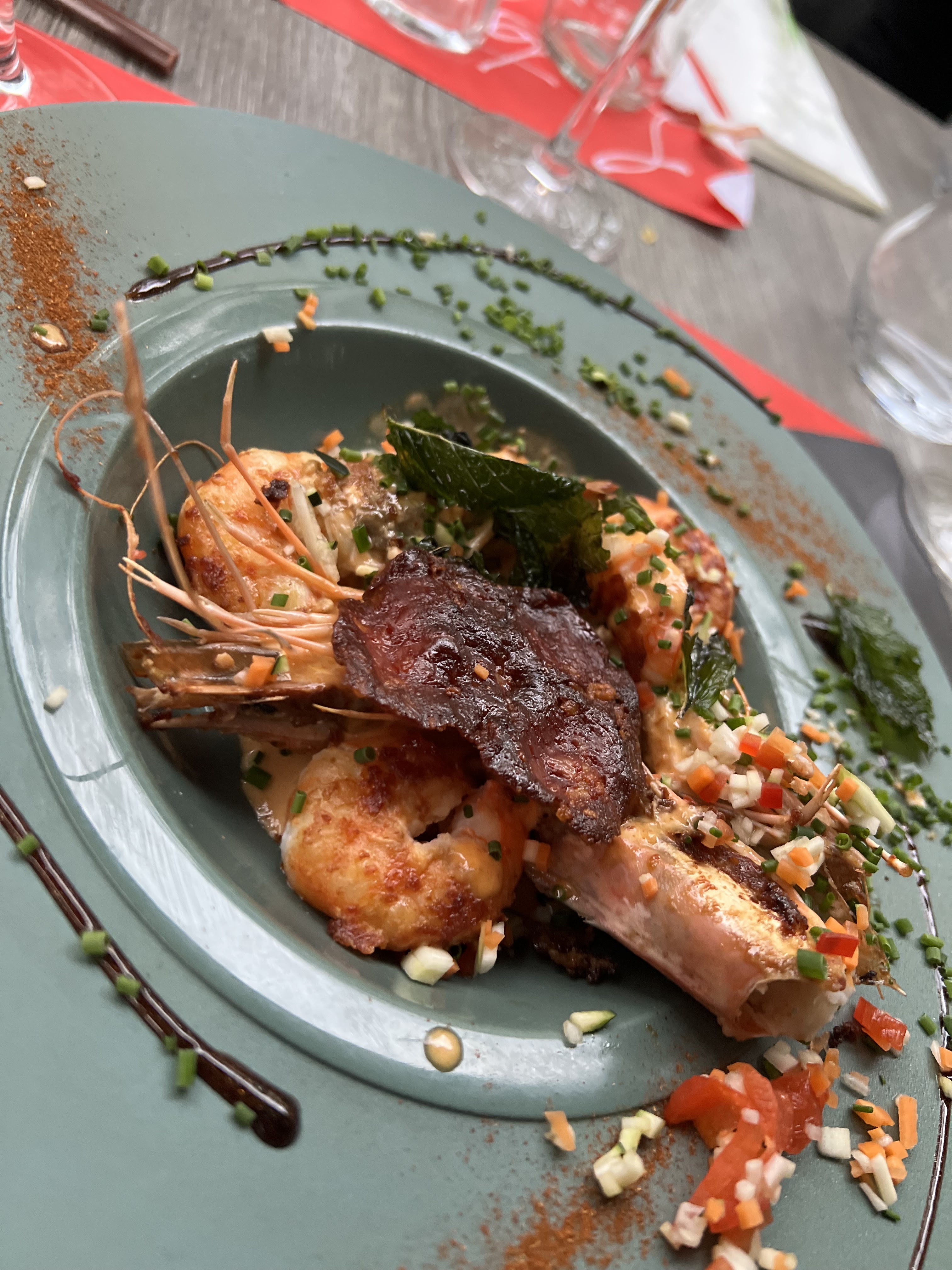 Très bonne soirée dans un cadre agréable, le personnel a été très accueillant et serviable Les entrées, plats et desserts étaient très bons Ma côte de veau bien épaisse et très bien cuite (bien rosée comme il faut) Le dessert, millefeuille crème Chiboust à la vanille bourbon et ses framboises fraîches, était délicieux et léger Les langoustines étaient bonnes. Le seul petit aspect à améliorer serait de revoir la présentation de l’assiette (spécialement le plat principal) car tout est un peu mélangé, j’ai eu du mal à goûter les ingrédients séparément, sans sauce.