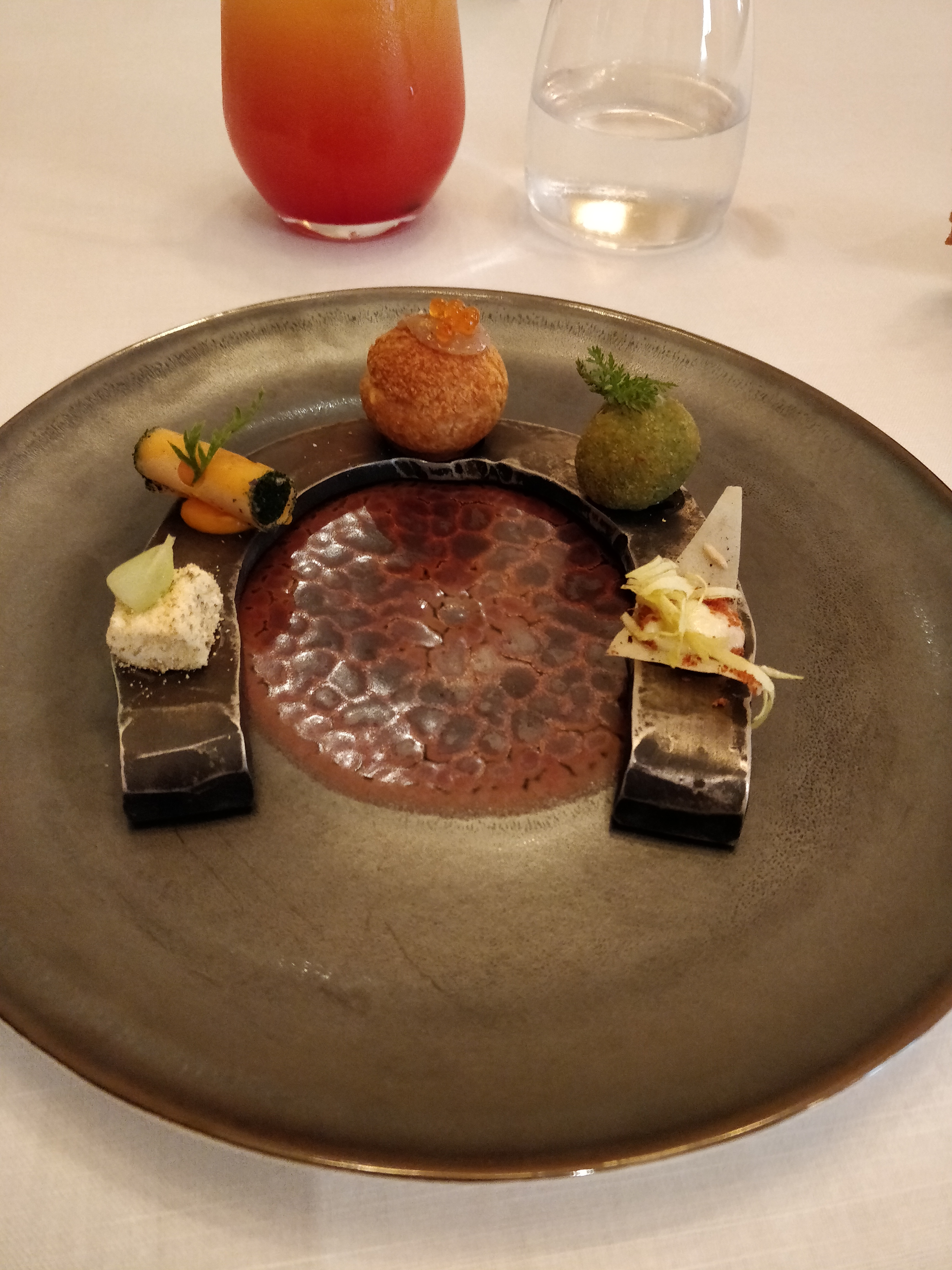 Expérience enrichissante de dîner dans cette ambiance différente du quotidien, malgré tout on se sent légèrement espionnés, savoir si l'on a fini ou pas l'entrée, savoir si l'on a aimé ou pas ... les amuses bouches étaient très bien présentés et très originaux sur le fer à cheval, le beurre au sapin n'était pas à mon goût (personnellement) le plat était vraiment délicieux même s'il n'etait pas très copieux pour le prix (et malgré les arrêtes pour un filet de brochet ...) Les deux petits morceaux de chevreuil etaient également un peu petits ... La carte des desserts était trop pauvre en choix, dommage. Une addition à 250€ tout de même, et nous sommes restés sur notre faim ...