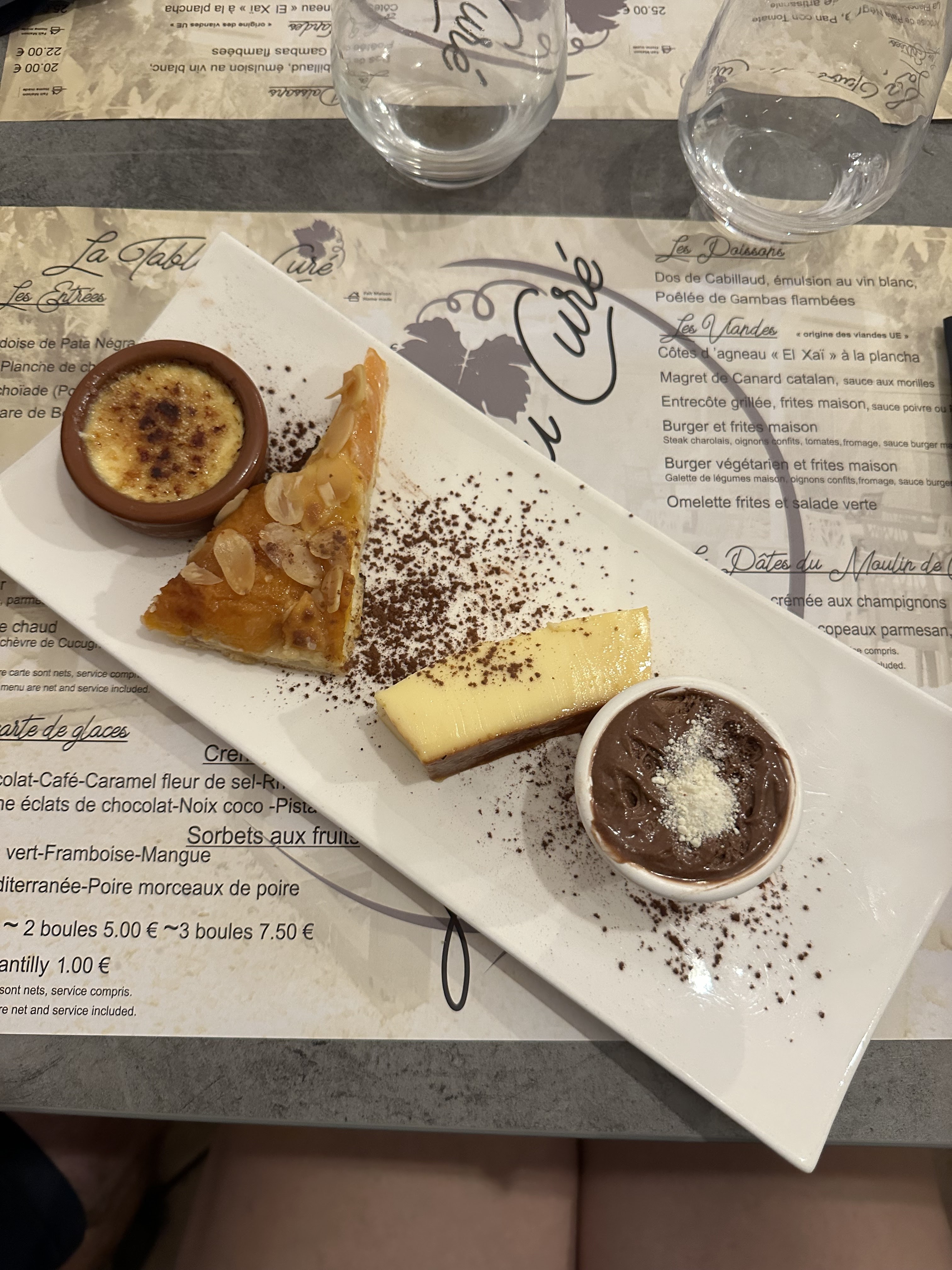 Restaurant fort sympathique dans un jolie village des Pyrénées orientales. Super accueil, service impeccable et très agréable. Concernant la nourriture j'ai pris le burger qui était parfaitement réalisé, très bon. Les frites pour accompagner également faites maison et ça se sent. Pour boire j'ai pris un verre de vin également succulent, En dessert j'ai pris le café gourmand qui permettait de goûter un peu tous les desserts qu'ils proposaient car tous avaient l'air super. Du coup j'ai goûté la crème brûlée, le tiramisu ainsi que que la mousse au chocolat et j'ai été déçu par aucun de ces dessert on sent que c'est fait maison rien à dire je recommande tous les desserts qu'ils proposent. Seul petit point négatif le prix de 10€ et la quantité qui est très réduite et ne vaut pas le prix selon moi . Donc dans l'ensemble je recommande les yeux fermés ce restaurant !