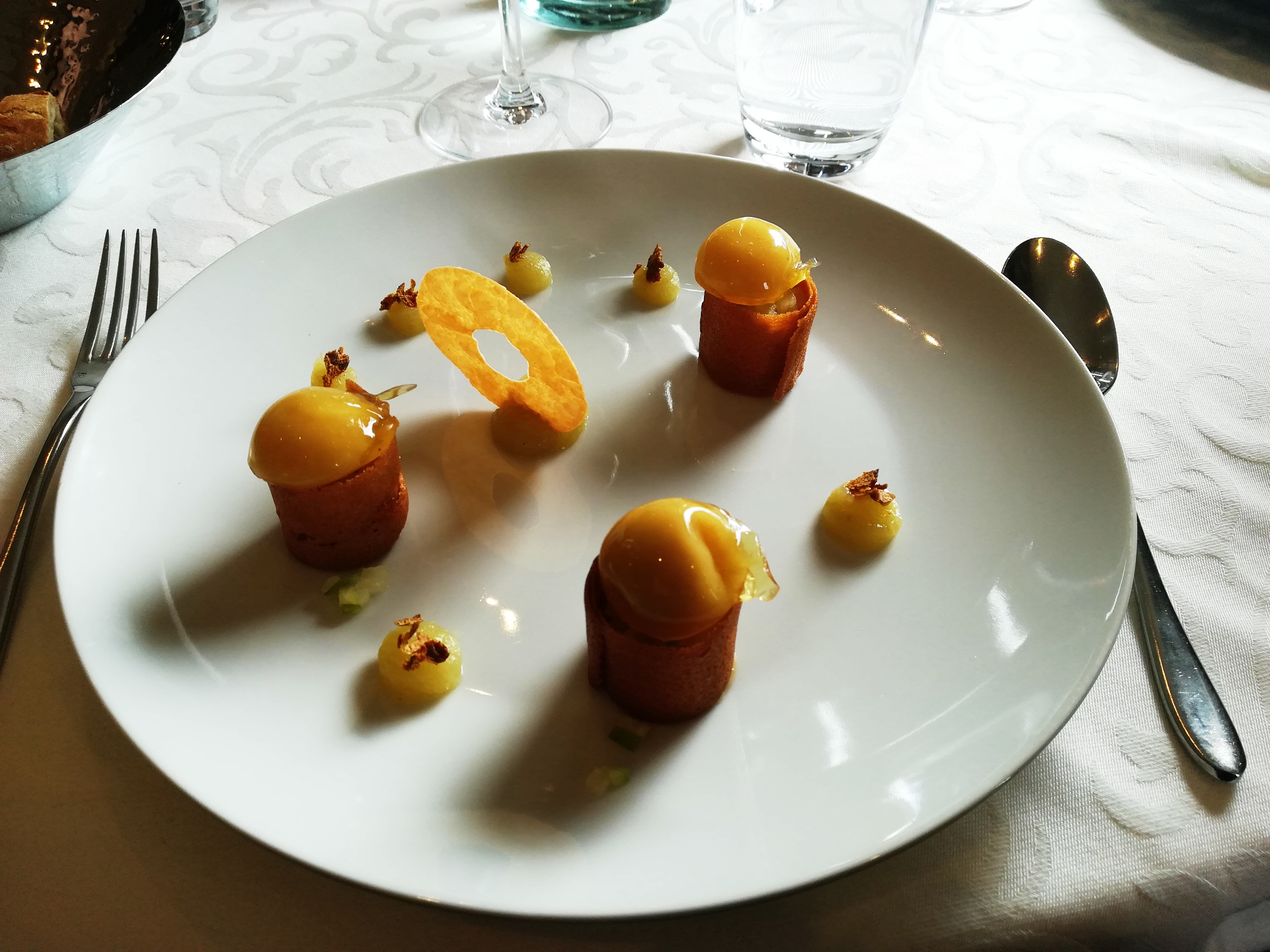 Excellent moment, des mises en bouche au dessert. Les carafes biseautées sont originales et mettent dans l'ambiance. Très belle cuisine où il faut absolument voir la préparation de la sole avec deux cuillères : impressionnante de dextérité. A refaire avec plaisir.
