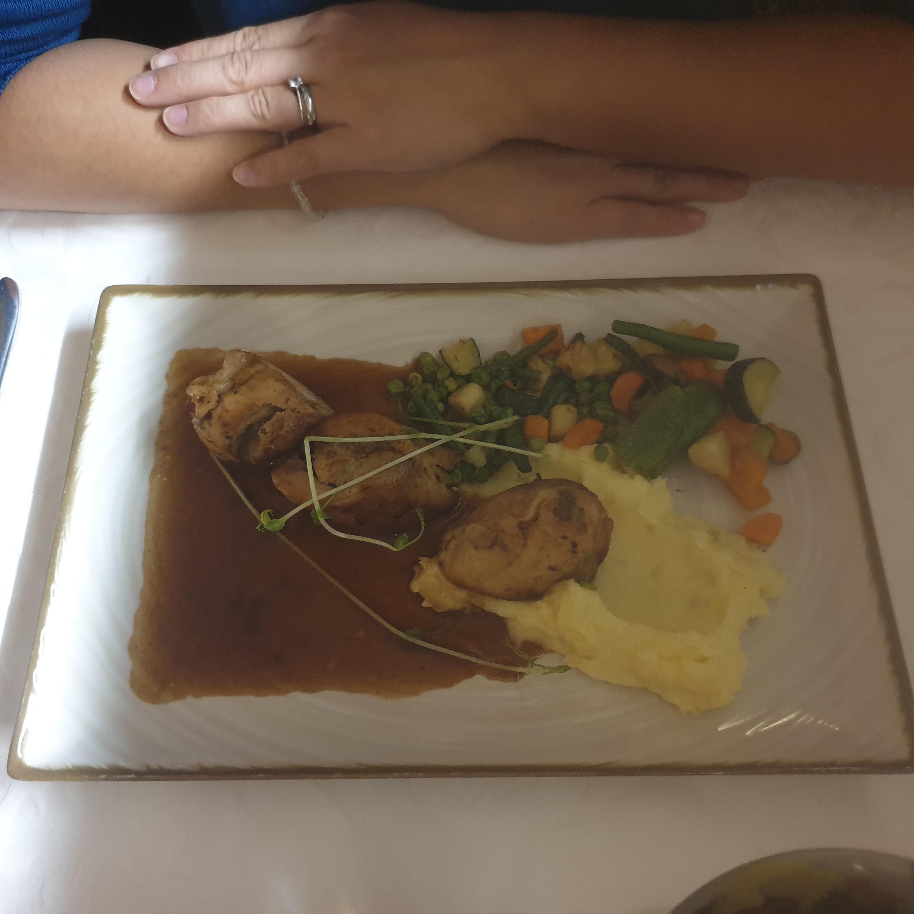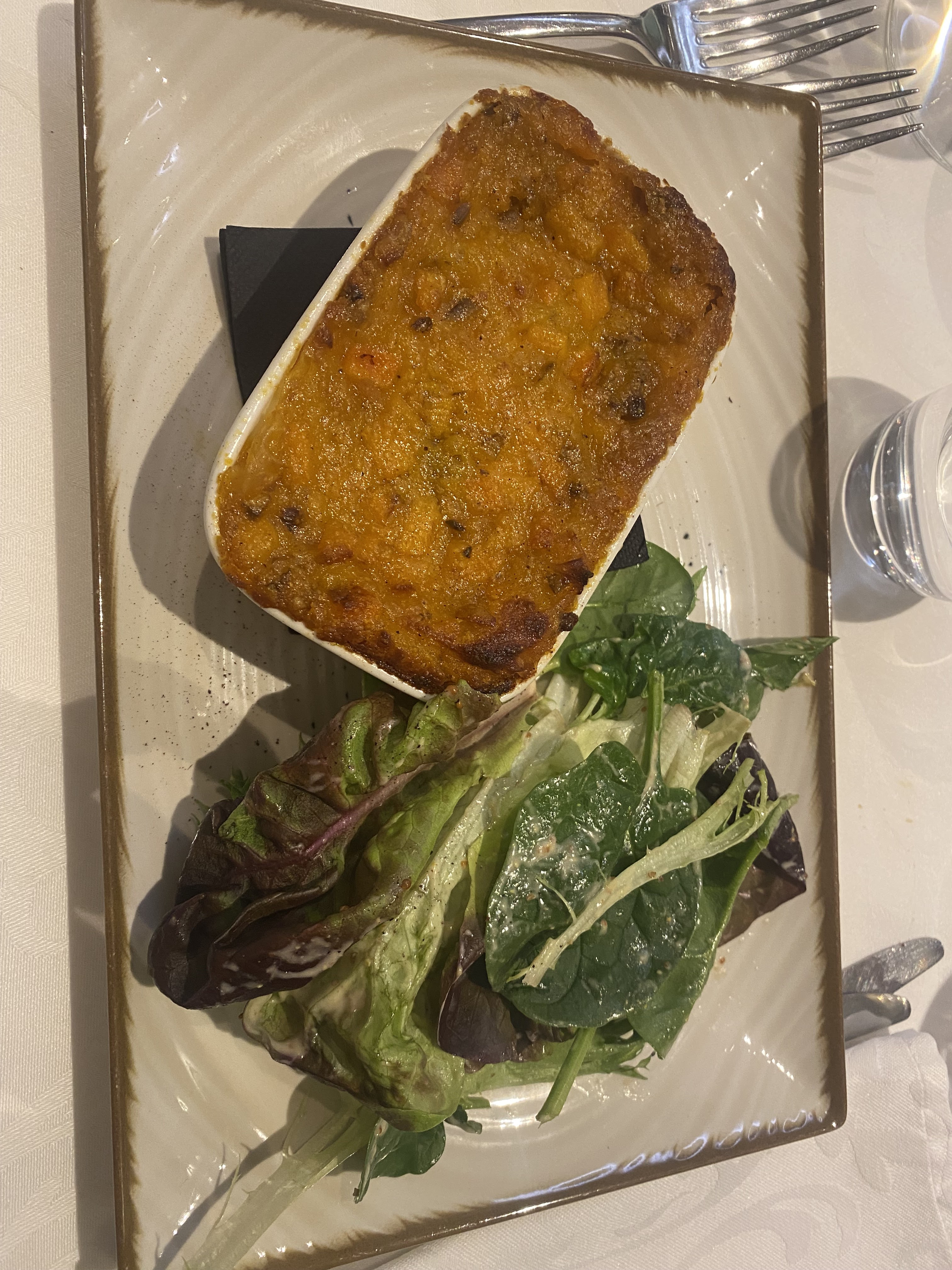 L'ambiance et le cadre étaient vraiment suberbes. Néanmoins, le service est serveur dépendant. L'un d'eux m'a enlevé les couverts des mains pour débarrasser mon désert que j'avais encore en bouche. Mon plat était bon malgré une poêlée de légumes surgelée. Mon conjoint, végétarien, n'a eu qu'un simple plat de pates. Ma mère n'avait pas de rubarbe dans son désert à la rubarbe... Pour un restaurant de ce standing, nous sommes très déçus.