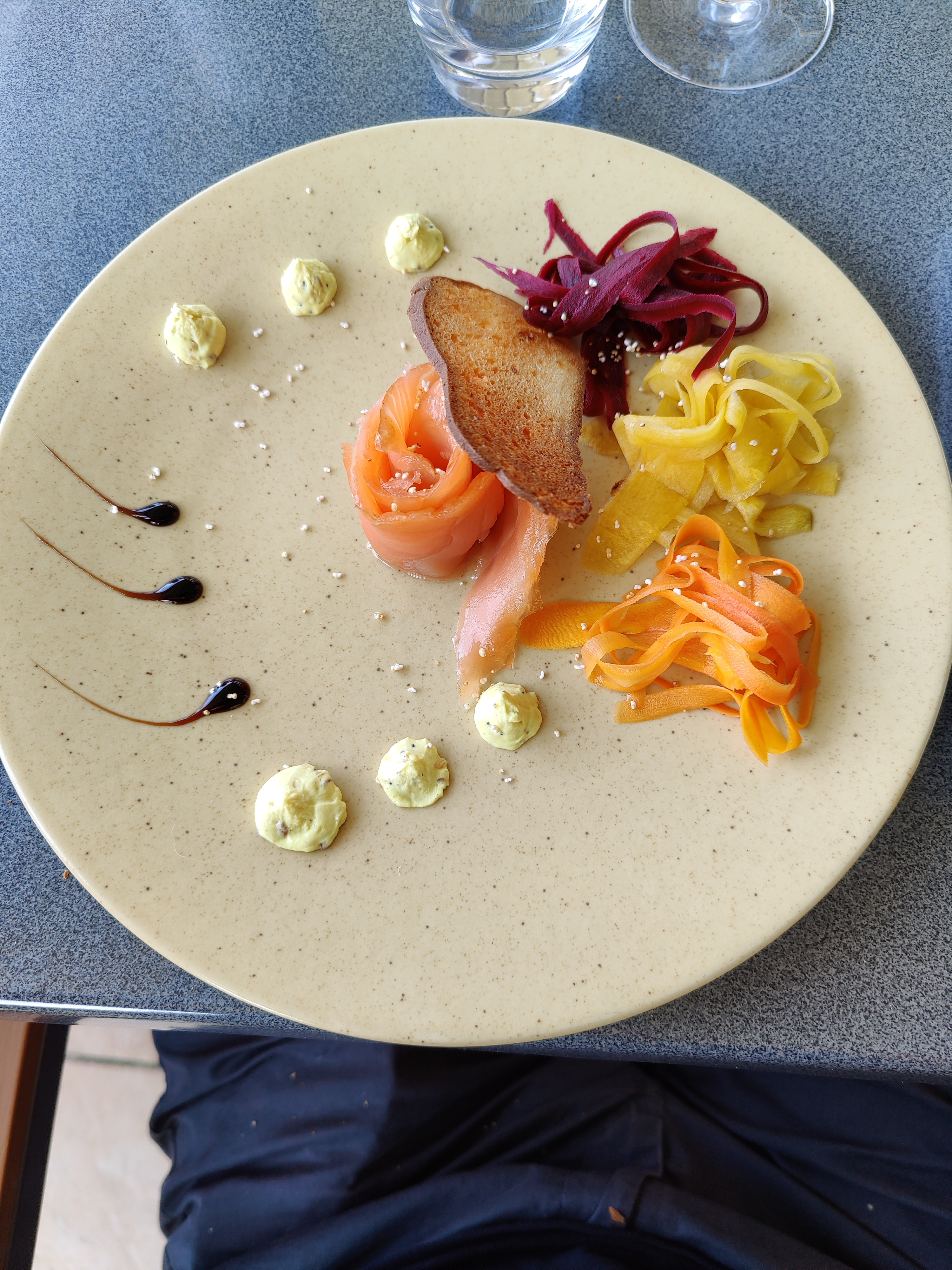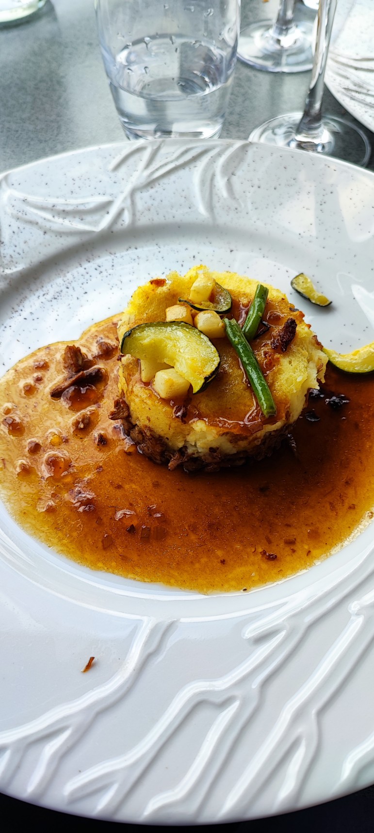La vue de la terrasse est magnifique. Les plats sont goûteux. Le service est impeccable. UN seul bémol qui ne retire rien à la qualité de ce que j ai vécu mais qui est agaçant. On n amène pas l entrée tant que l'apéro n est pas terminé.