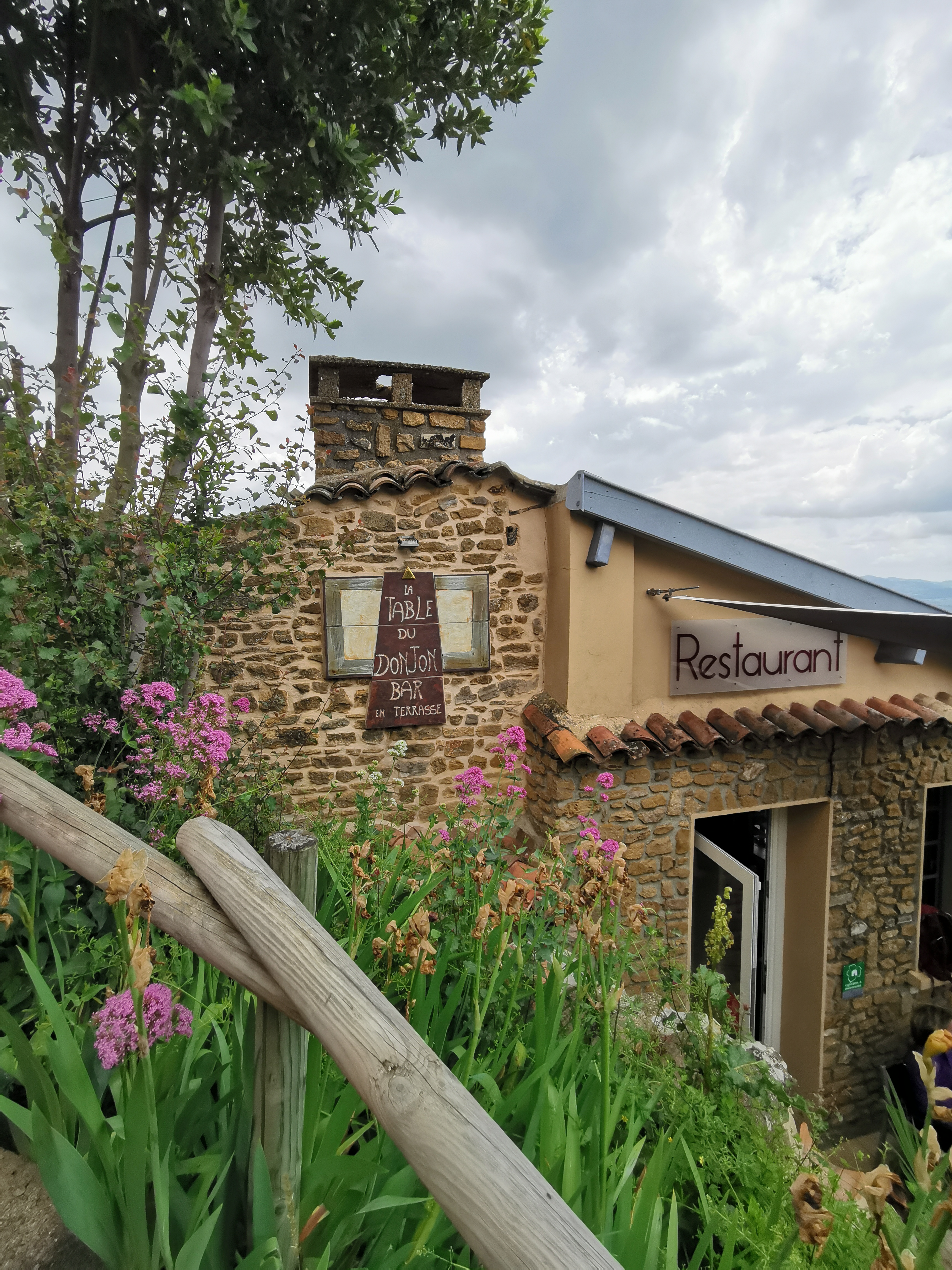 Situé sur un des versants du village d'Oingt surplombant les environs à 360° (d'où l'emplacement rêvé d'un donjon), ce restaurant n'a pas été totalement à la hauteur de sa réputation en ce dimanche ensoleillé. Presque aurait-il fallu manger dans la salle sobre et élégante pour profiter d'un lieu plus cosy que la terrasse balcon aux tables dénudées de nappes, aux chaises trop basses mais à la vue imprenable. En tout cas l'accueil est au rendez-vous, et très vite, les papilles s'émerveillent avec une mise en bouche remarquable. Les entrées, composées de produits traditionnels et agrémentées par quelques pointes de saveurs plus originales, sont d'une agréable finesse. Quant aux plats, espérons que le retour en cuisine d'un poisson pas assez cuit (plat accompagné de rattes d'aucun intérêt et pour seule saveur, l'échalote crue) est un simple accident de parcours... sans compter que la viande (filet de boeuf tendre mais peu goûteux, sauce aux morilles insipide) a été servie bleue au lieu de saignante, passons... Il faudra attendre les excellents desserts, parfaitement dosés, pour redorer le blason du menu à 41€ (contenu modifié entre le jour de la réservation sur le site et le jour du repas). La Forêt Noire, si absolument divine, ne saurait un jour disparaître de la carte ! Côté vins, commandés au verre, rien à redire. Tous sont, sans exception, de très bonne qualité. Il est par ailleurs impératif de déguster le vin local Terra Iconia, beaujolais blanc typique du terroir d'Oingt. Après cette pause déjeuner quelque peu déconcertante, il est temps de flâner dans les ruelles où les pierres dorées enchantent les nombreux touristes.