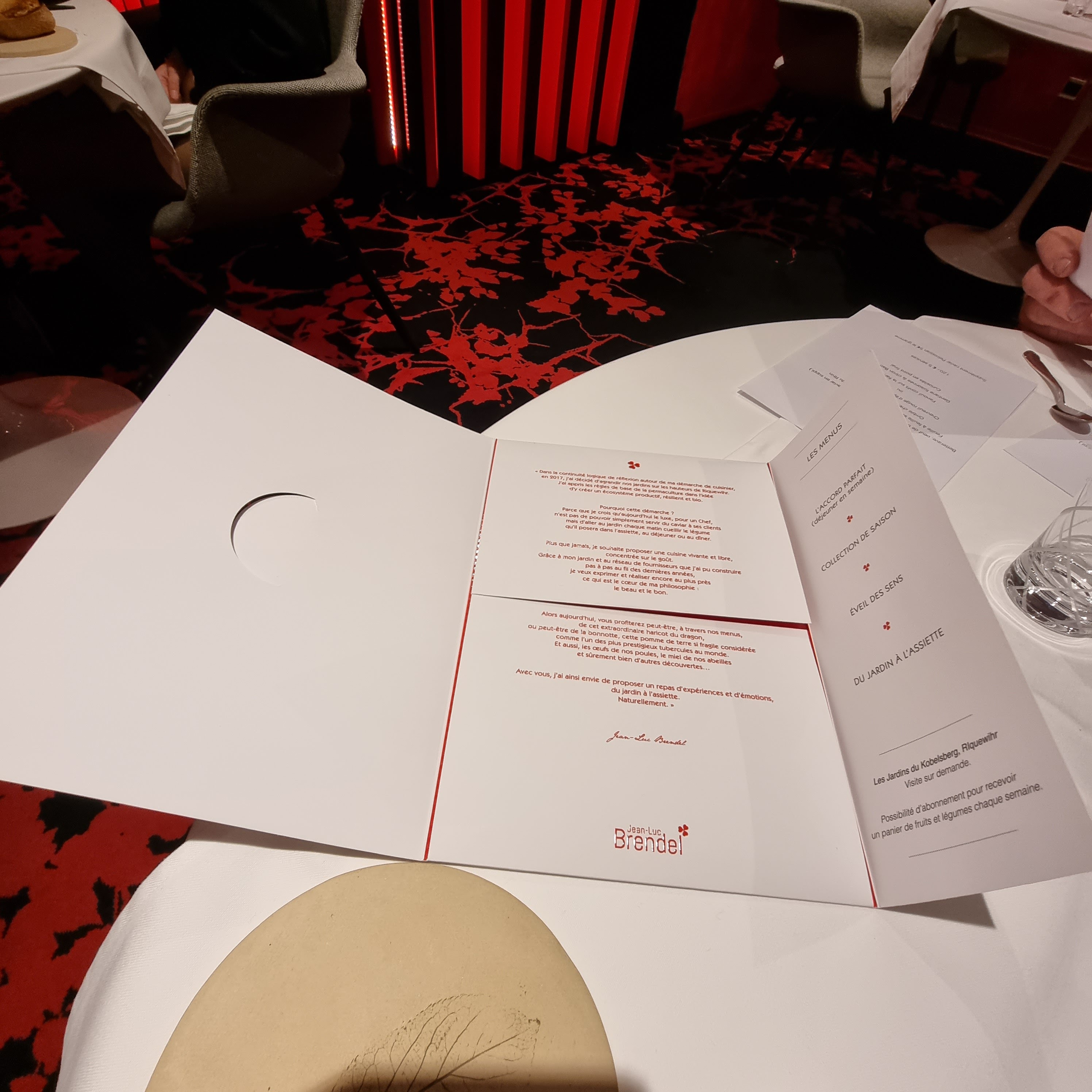 Voici notre expérience du Menu Grande Symphonie avec son accord mets-vins. Il est déjà à noter que l’établissement se trouve dans une ville Alsacienne caractérisée par son charme. Profitez-en pour la visiter si vous ne la connaissez pas déjà. L’établissement drapé de rouge et de noir, est lumineux et décoré avec goût. Tout ce rouge peut paraitre presque too much mais il n’en est rien. L’accueil est chaleureux et pris en main par Mme Brendel. Nous évitons les quelques belles poutres basses, nous arrivons à notre table où le menu nous attendait. Le concept de l’établissement nous est décrit avec amour par Mme Brendel. Permaculture, producteurs locaux, tout est fait pour que l’expérience qui nous est comptée soit le fruit de réalisations locales et de producteurs dévoués à l’art de prendre du plaisir et de nous le retransmettre. Ce qui est encore plus agréable c’est que ce qu’elle décrit, elle le vit et est capable de parler de chacun de ses producteurs et des produits sélectionnés. Monsieur Brendel devient celui qui lie avec harmonie tous ces produits d’exception. Le menu Grande Symphonie : Betterave, oeuf de brochet sur plancton & raifort Poireau sur la flamme, jus alambiqué à la cuillère Escargot entre jardin et forêt Jeu d'héliantis & truffe Sandre sauvage Ikejime & persil simple Homard bleu à la flamme, opus incertum Veau fermier sur la braise, choux variés Alliance citrouille, tagète & mandarine Oh bouleau ! Curiosités en point final Tout a su nous émerveiller mais je garde en mémoire 3 choses: Le sandre nacré d’une délicatesse infinie, le homard bleu qui est certes le seul a avoir voyagé (d’ailleurs il fut tellement agréable que M. Brendel vienne partager quelques mots avec nous autour de ce plat qui lui tient à coeur), et le veau d’une tendreté mémorable. L’accord mets-vin est juste parfait, en nous proposant des vins de la région, mais en sachant également nous surprendre. Le service est orchestré pour que nous ayons le temps d’apprécier les moments de découverte. Mme Brendel n’aura de cesse avec parfois un humour taquin de veiller sur nous et à ce que cette expérience reste gravées dans nos mémoires. Je la remercie encore d’ailleurs pour la petite attention de fin de repas ;)