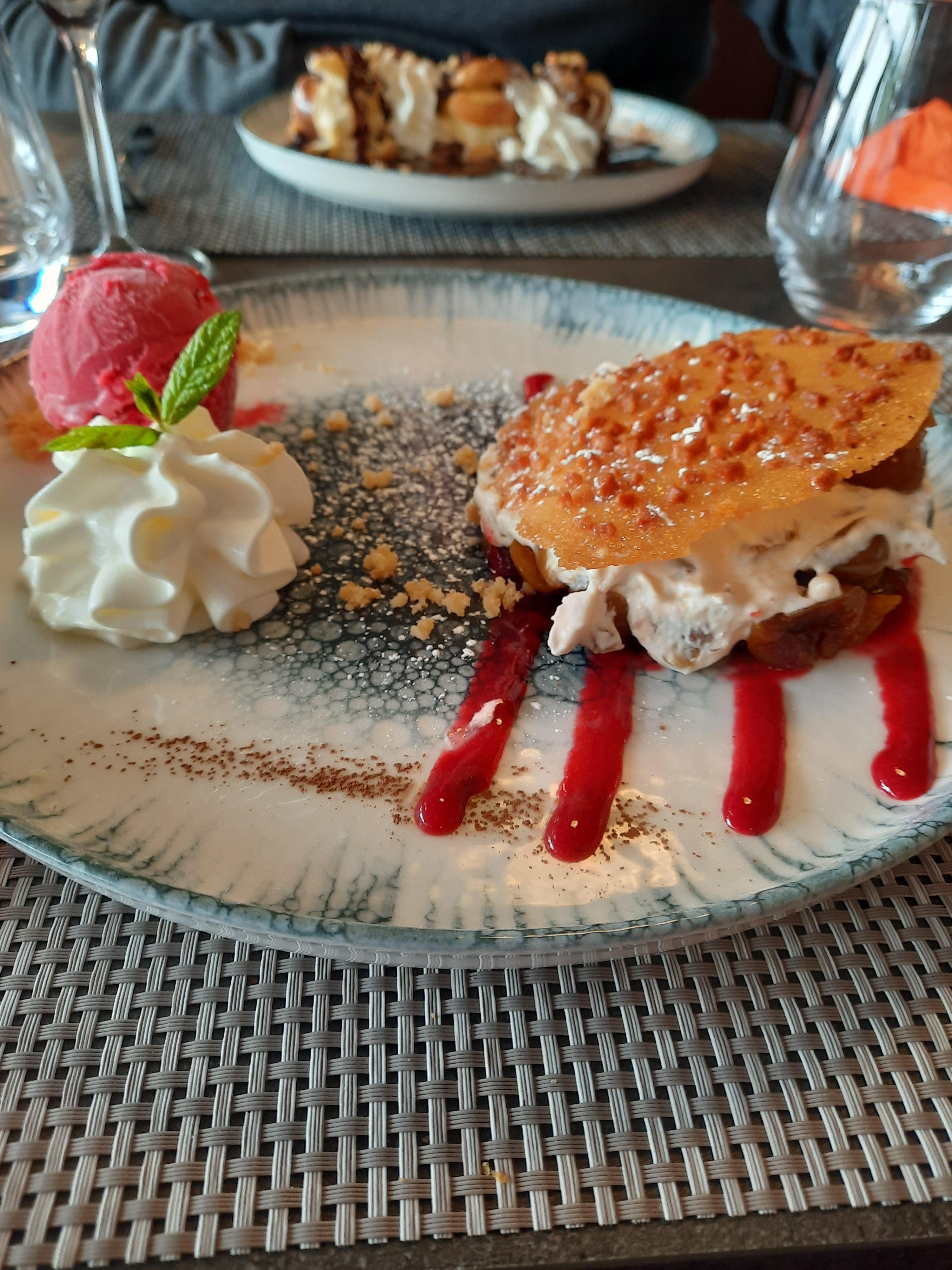 C'est une cuisine raffinée, le personnel est au petit soin, rapport qualité prix, c'est parfait. La photo, Nougatine sur des mirabelles compotées avec une glace framboise le tout succulent