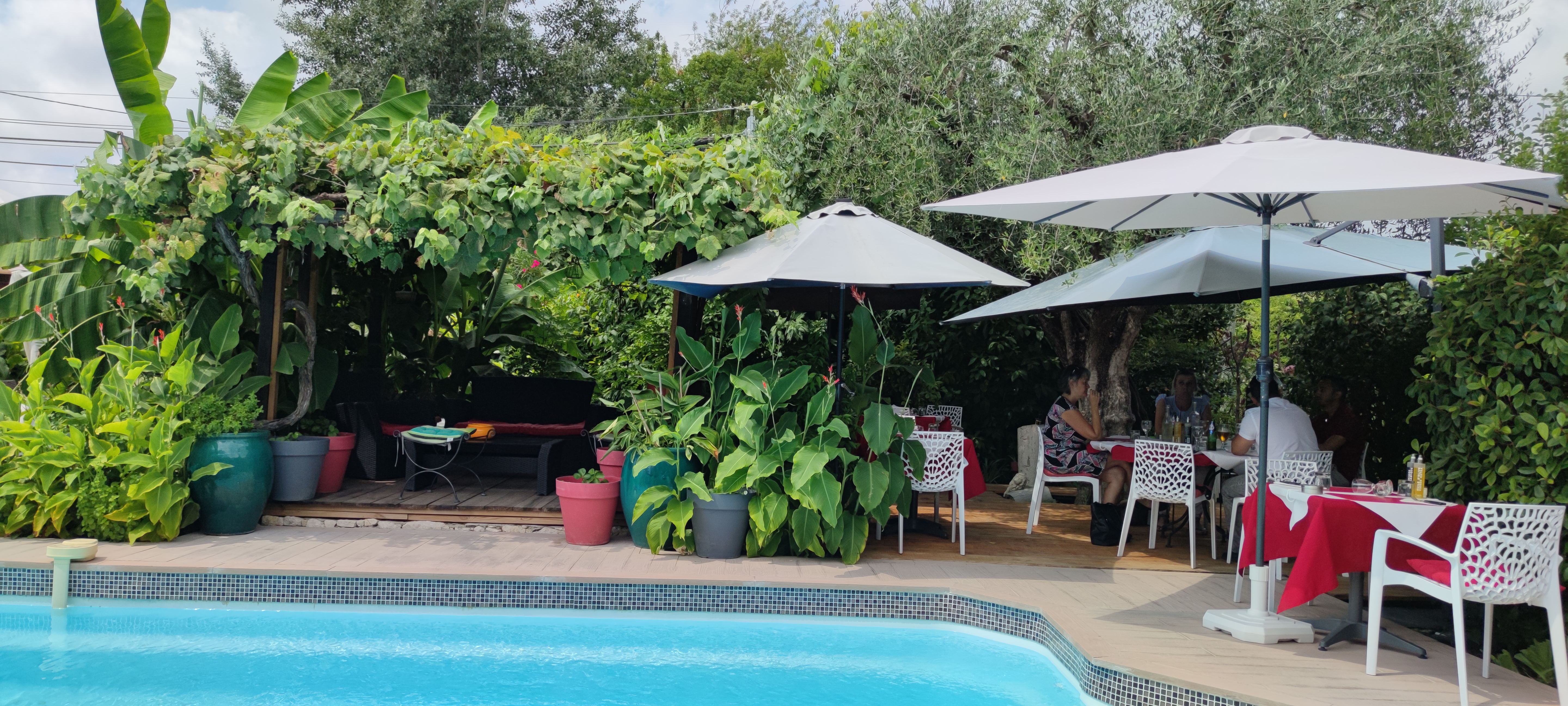 Accueillant. Piscine et cadre fleuri. Idéal pour aller manger entre amis et les salades sont copieuses.