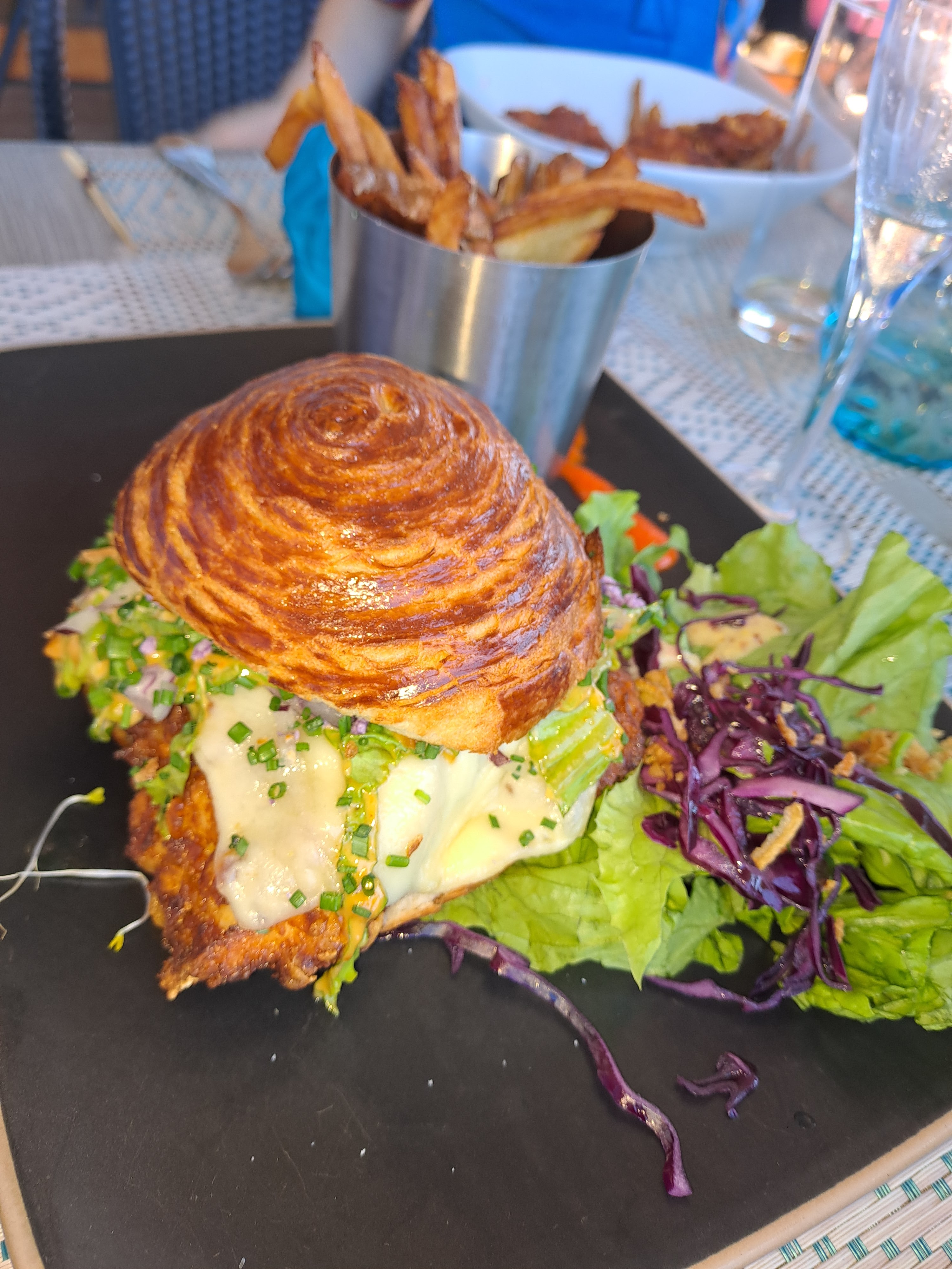 Service débordé mais souriant. Une entrée oubliée arrivée quand tout le monde a fini. Frites maison grasses, immangeable. Cuisine fade. La vue est belle.