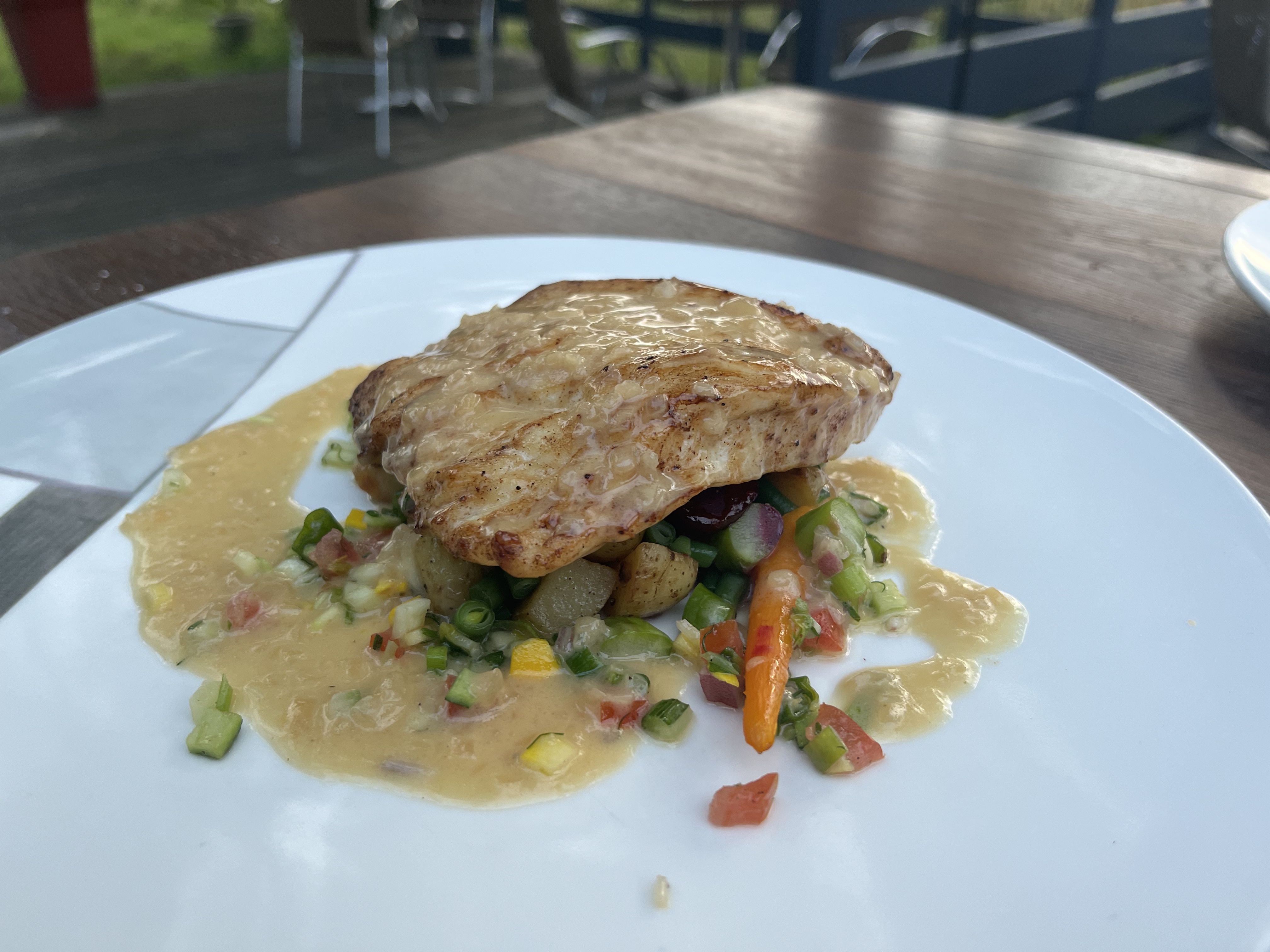 Plats fins et originaux Service parfait Cadre bucolique en terrasse très agréable