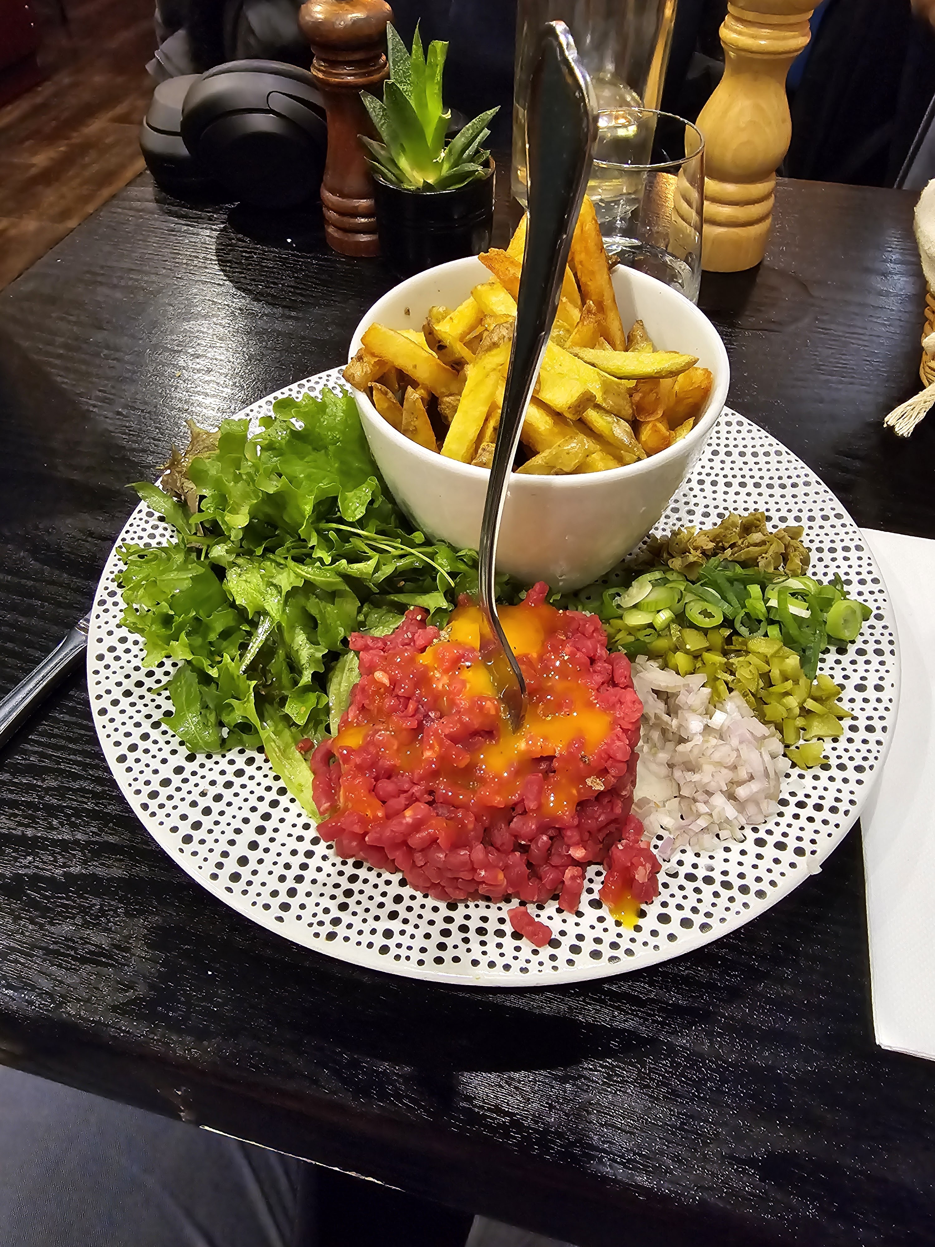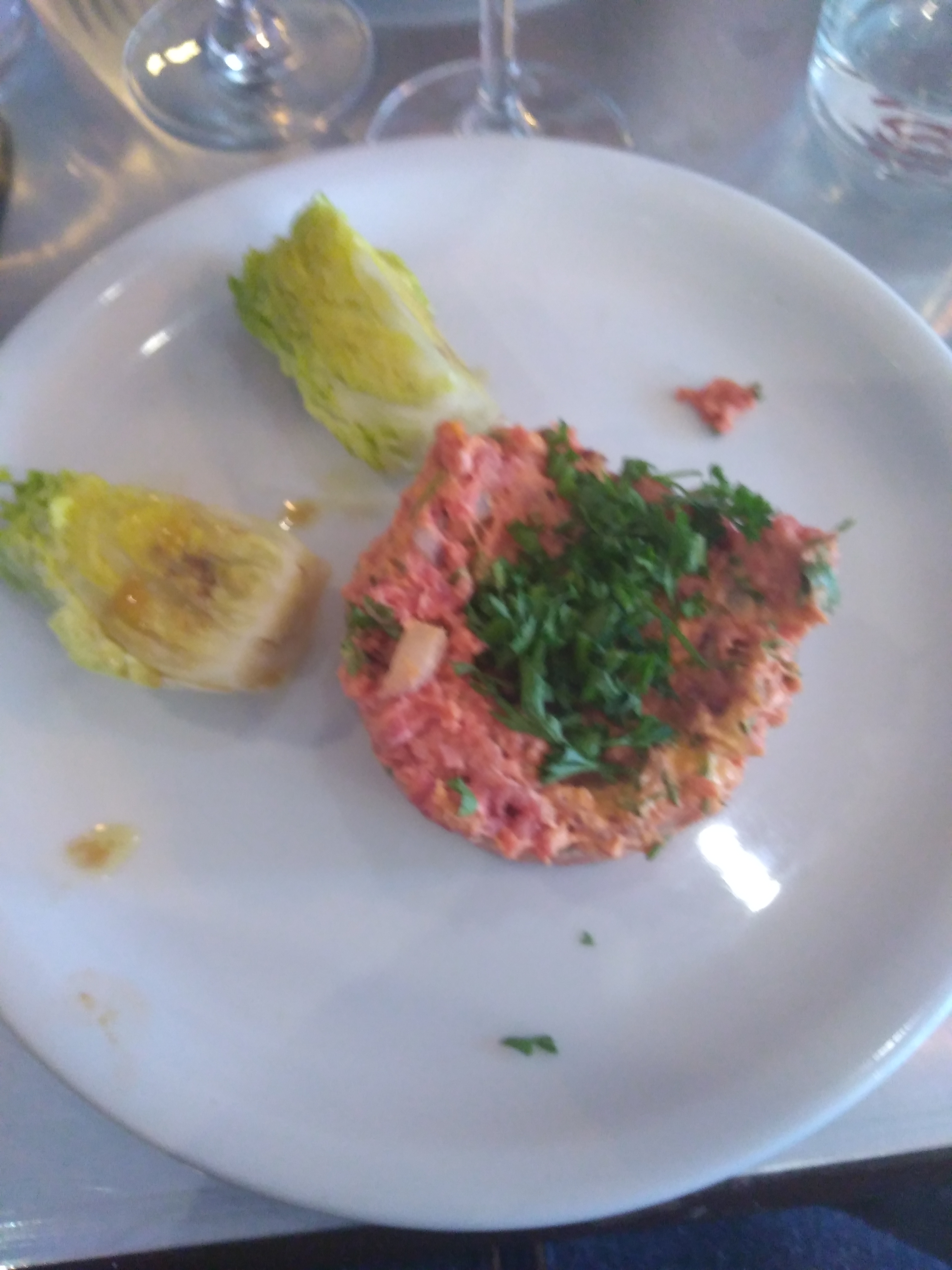 Très bon restaurant à l'ambiance agréable et aux serveurs sympathiques (mais trop pressés / pas agiles). Ils n'avaient malheureusement plus de burgers du menu au moment où nous sommes venus. Je me suis rabattu sur un tartare non préparé qui était délicieux. Ils ont mis tous les ingrédients de la préparation sur le côté et l'œuf sur la viande. Le serveur revenait régulièrement pour nous resservir de l'eau et/ou du vin, mais mettait constamment plusieurs goûtes à côté, dans nos assiettes, sur nos couverts. Si vous êtes trop pressés pour nous resservir convenablement, ne le faites pas. Les portions n'étaient pas très grandes (malgré les prix très élevés), donc ça force souvent la main à prendre un dessert pour être rassasié.
