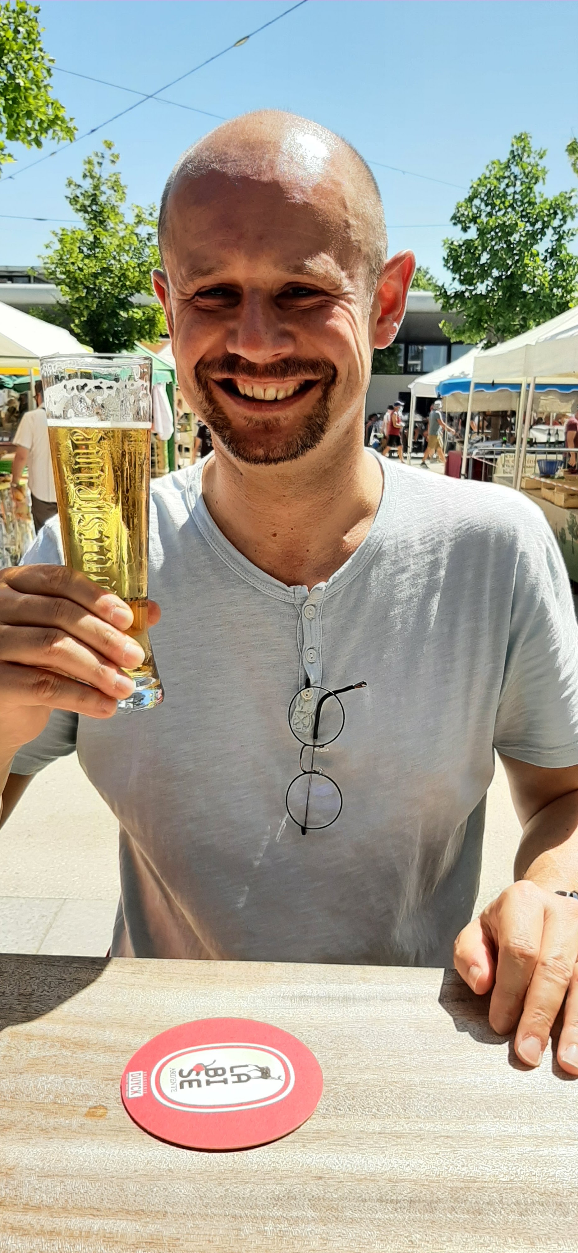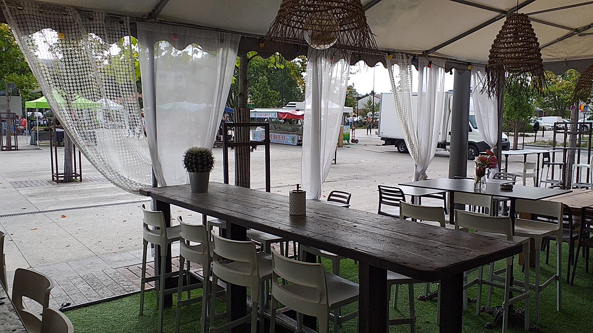 Cadre agréable avec sa proximité du marché - personnel sympathique- assiettes bien garnies- prix correcte pour un panaché , un blanc limé, un rosé , 2 tartares, une planche de jambon truffé, une soupe de framboise, un café = 85€ Seul bémol des frites cuites et recuites et une feuille de basilic défraîchie Je recommande tout de même et je reviendrai