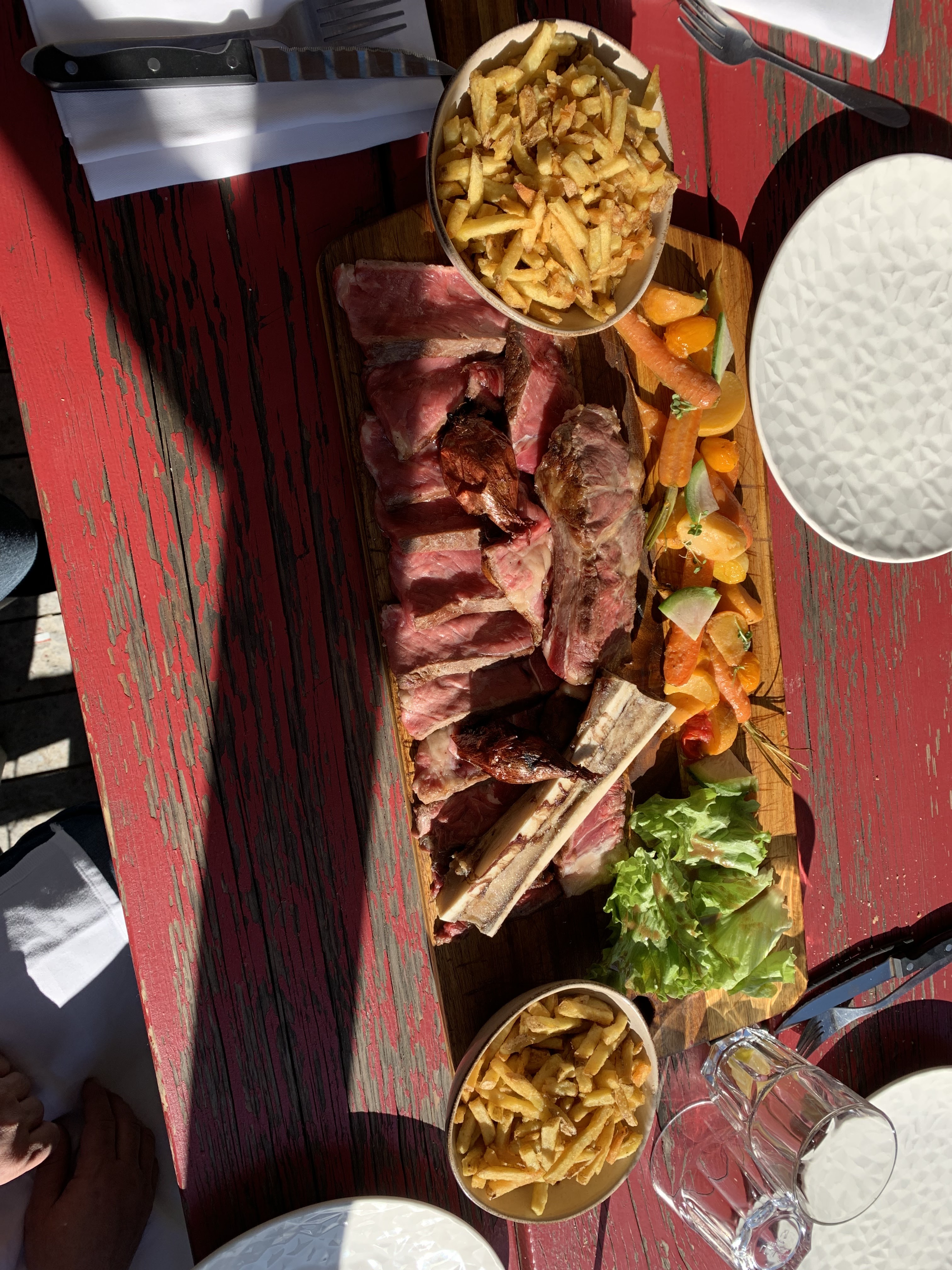 Côte de bœuf exceptionnelle présentée sur une grande planche avec des légumes rôtis, os à moelle, salade verte et des frites à part ... c'est beau, c'est bon, c'est parfaitement cuit et très copieux. L'accueil et la déco sont vraiment top !!