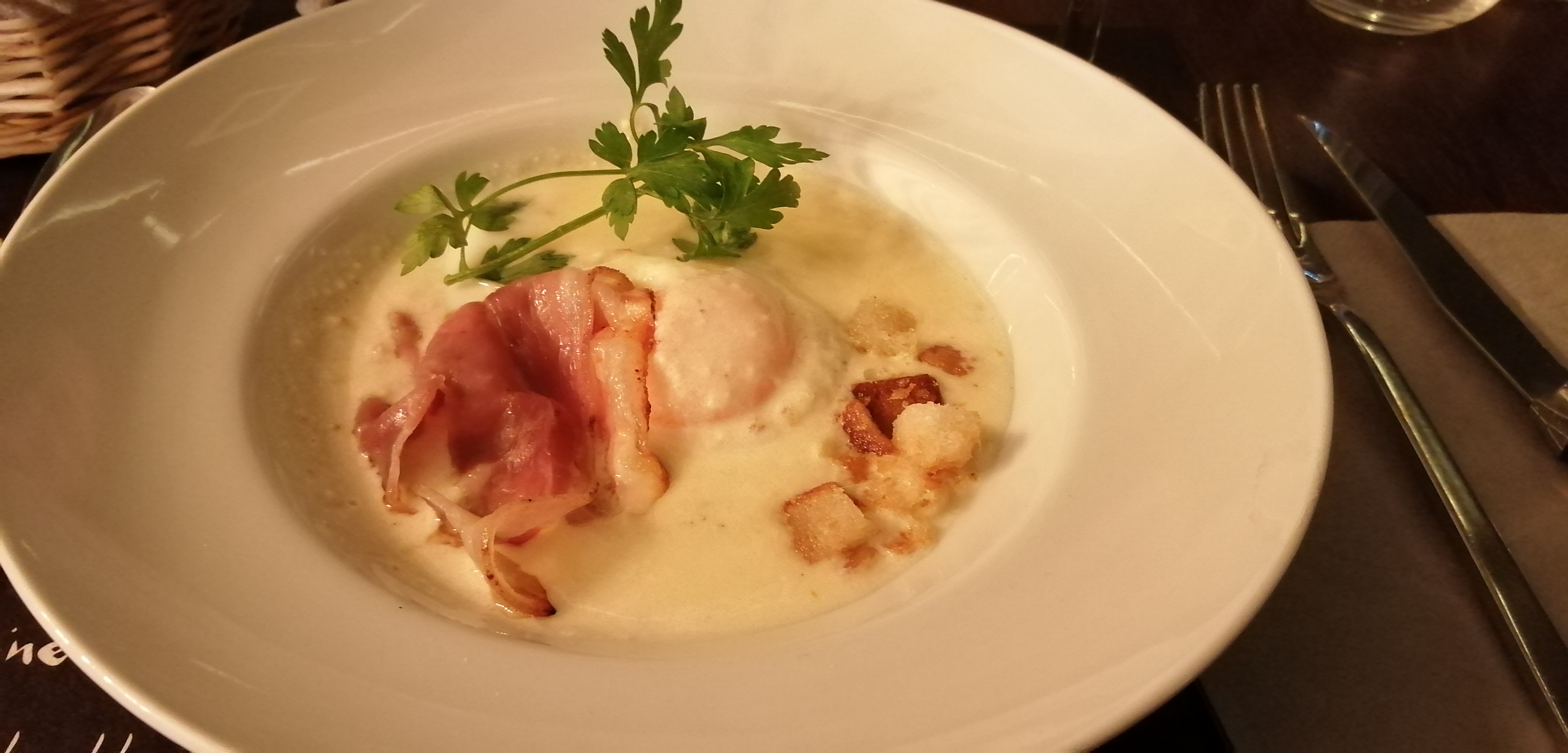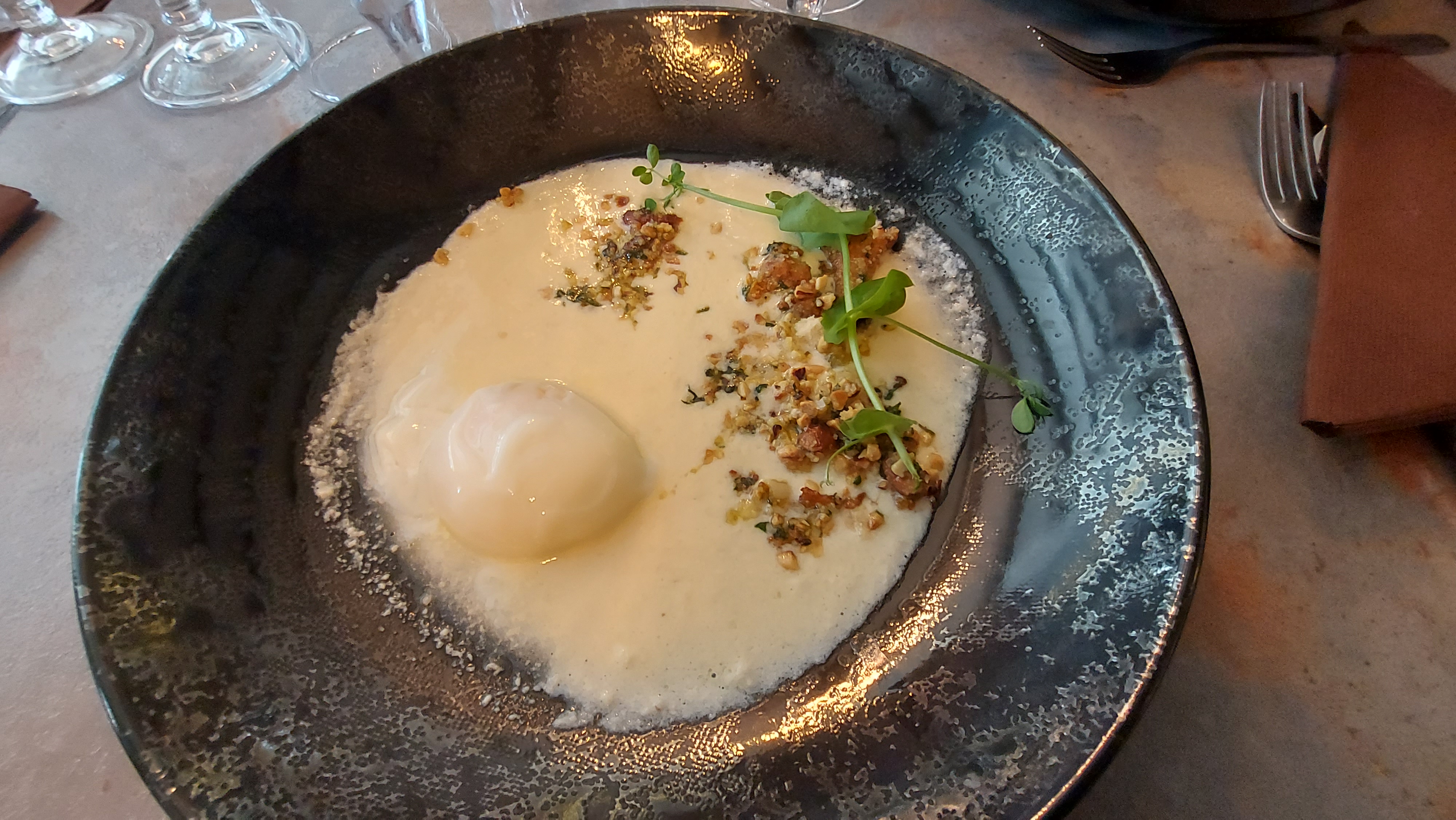 Accueil sympathique, lieu agréable, foie gras poêlé délicieux, œuf parfait plutôt mollet Coquille d’œuf dans la salade, ça arrive, mais je m’étrangle qd on me répond que ce n’est pas de chance, sans même un mot d’excuse…