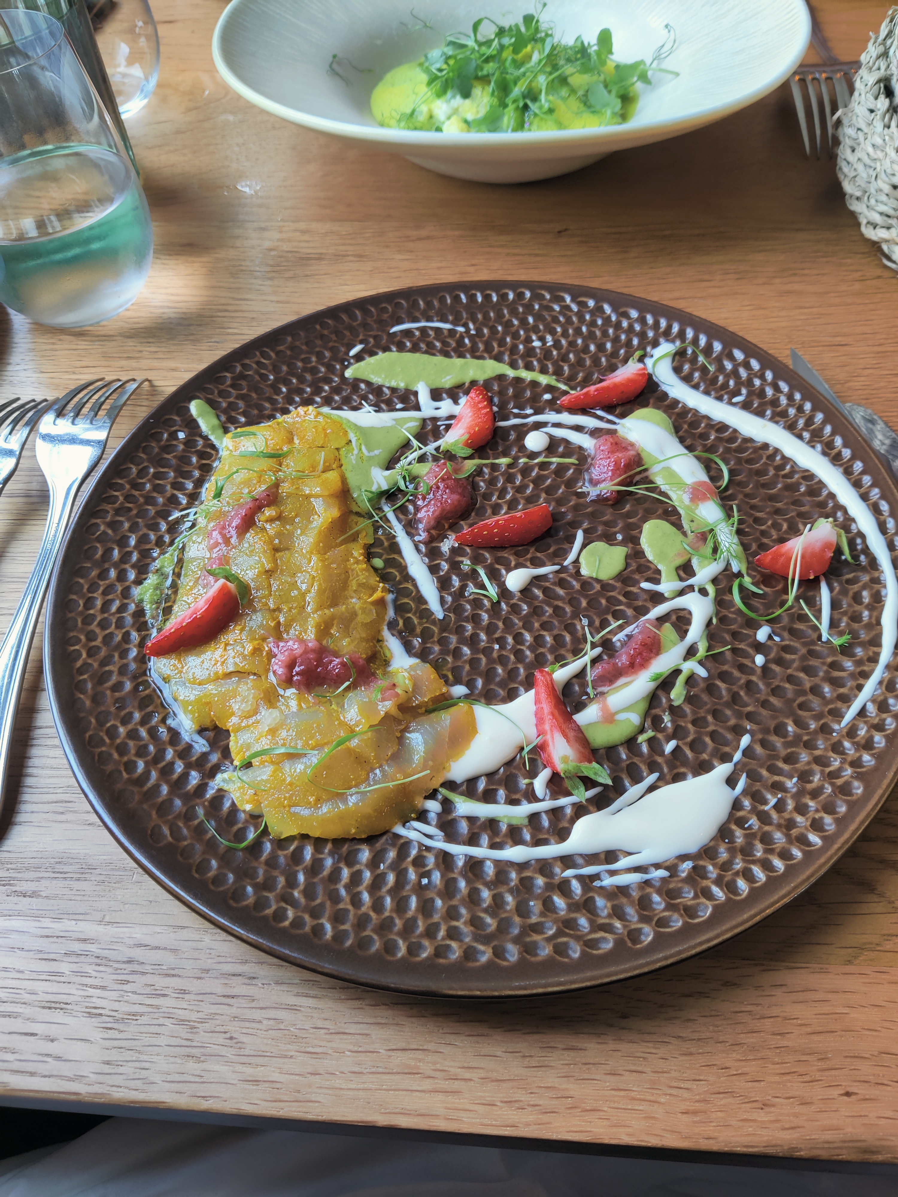 Cuisine fine, bien équilibrée, cadre nature et calme, musique d'ambiance géniale, serveur ultra sympathique avec qui nous avons bien ri. A faire.