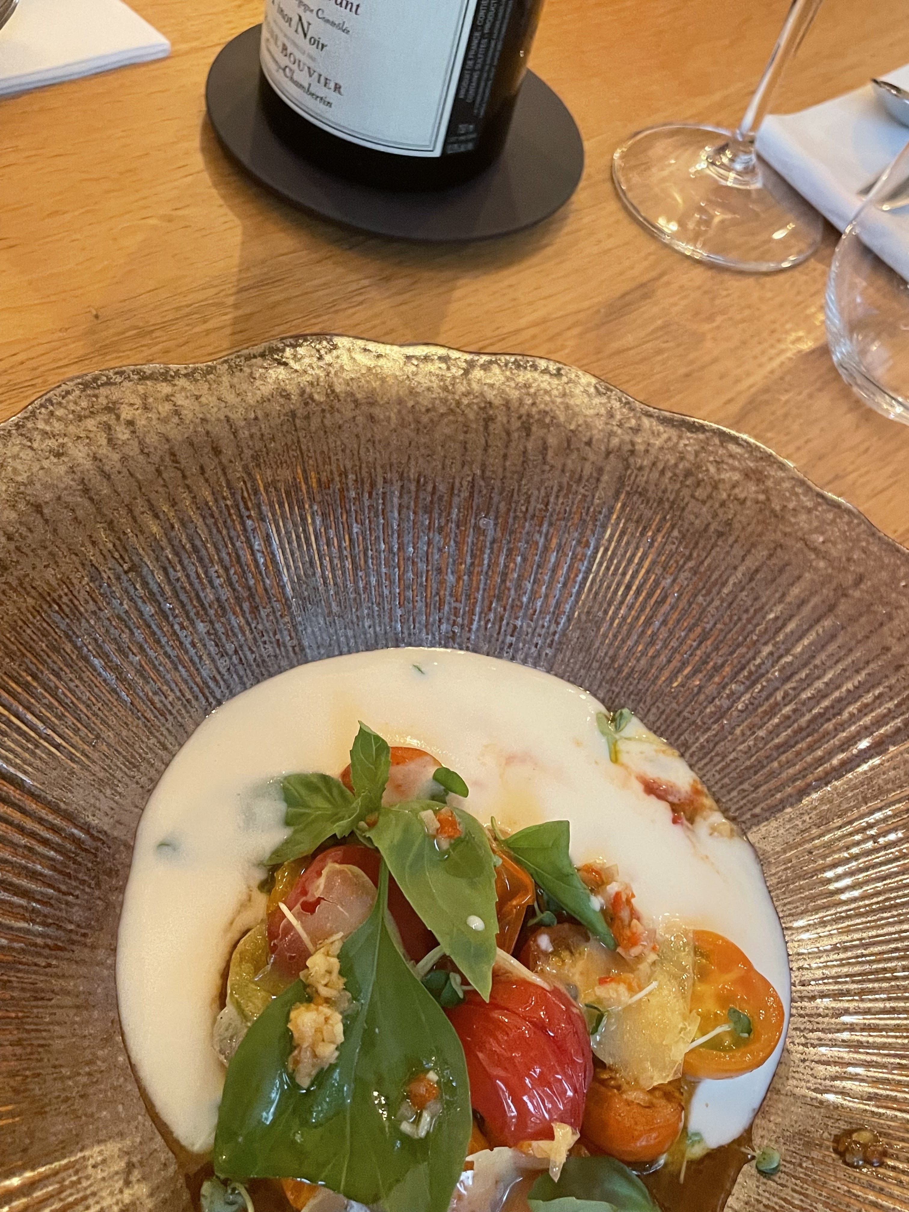 Un dîner exquis. Des plats raffinés et délicieux avec des options végétariennes originales et savoureuses. Un très jeune chef de grand talent, un service attentionné et charmant. Joli décor et une réussite en tous points.