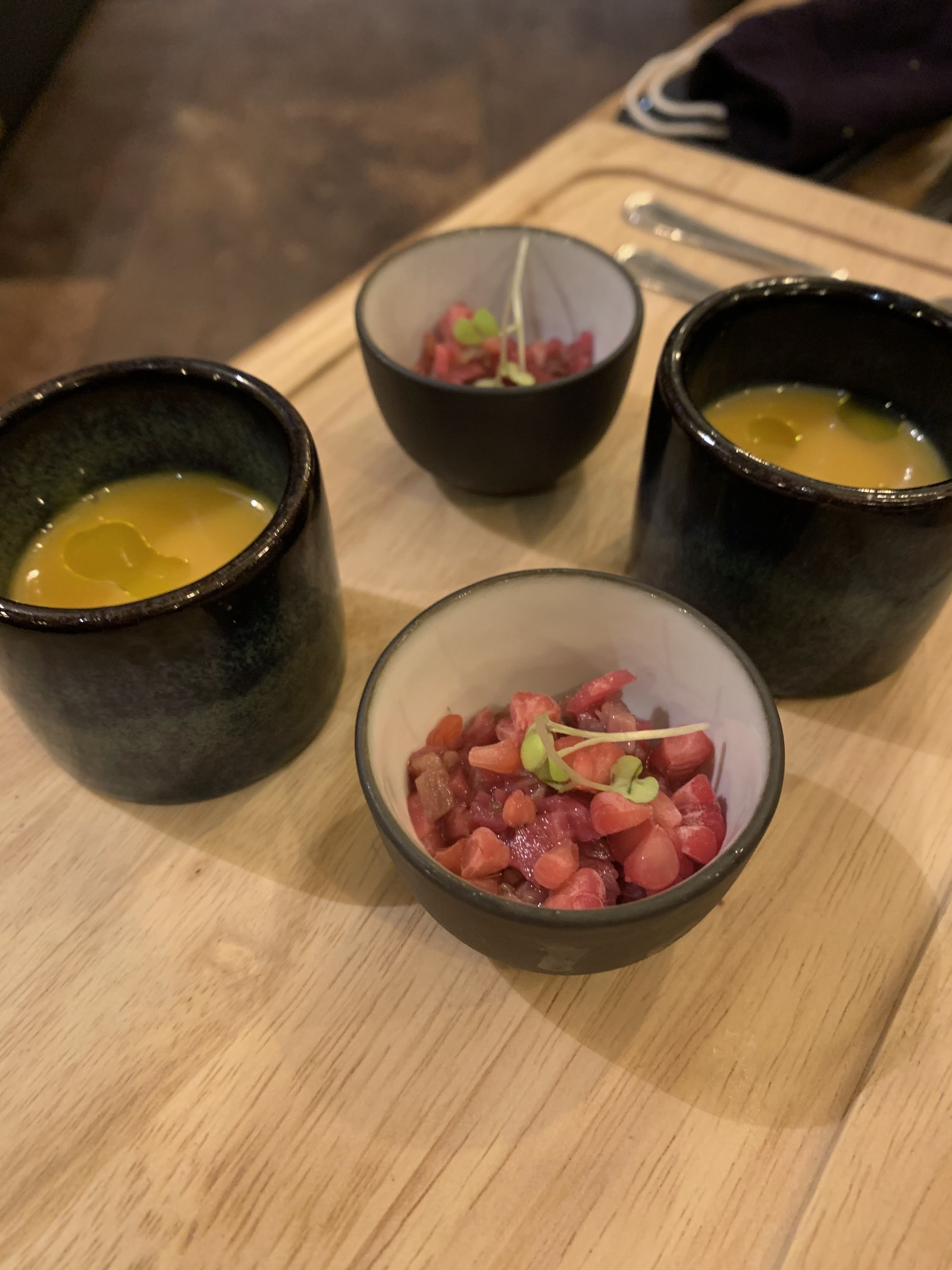 Tout était parfait , dommage que le prix des vins aux verres pour 3 soit si chers 26 euros. Dommage que lorsqu on appelle , on est pas eu l info que c était un menu surprise à 4 plats. , qu il n y avait plus le menu du marché de du coup tarif plus élevé . Très très fins, de belles découvertes culinaires et très goûteux .Après il faut compter le menu, une bouteille de vin pour 4 et un café 55euros par personne. Déçue par le dessert un peu léger car les plats sont légers aussi . Pas de légumes un peu dommage. Les serveurs super ainsi que les explications. Je testerai les forges, il semblerait que les assiettes soient plus copieuses et plus abordables au niveau prix , ce que vous avions eu le dernière fois . Une fois de temps en temps ..oui sinon trop onéreux a mon goût.nous étions de cet avis 3 sur 4.