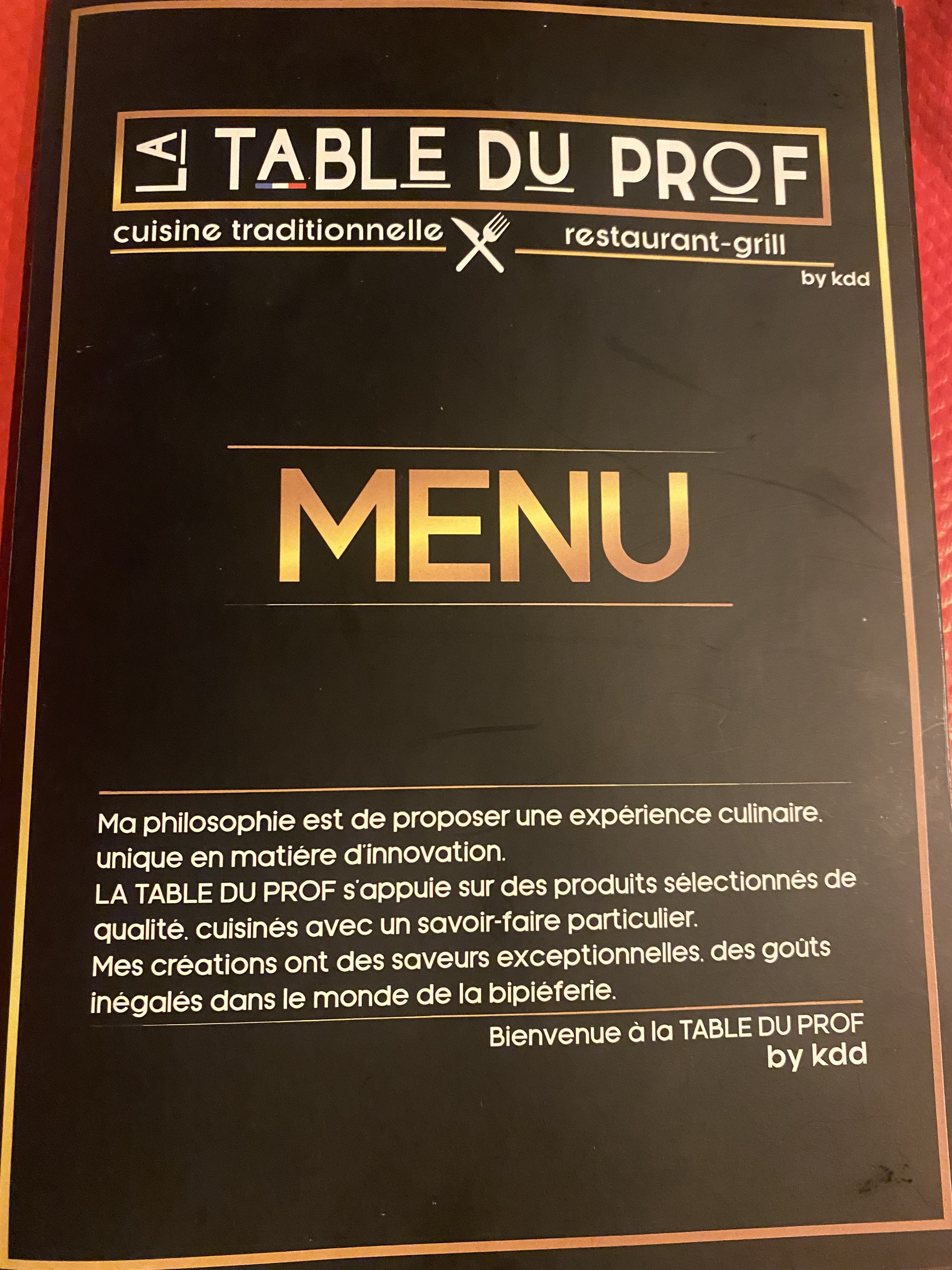 La table du prof est un restaurant où on y mange très bien. La cuisine est vraiment très bonne le service est nickel le gérant est sympathique et souriant les produits sont frais et très bon seul bémol la musique! Beaucoup trop forte à mon goût c'est vraiment dommage.