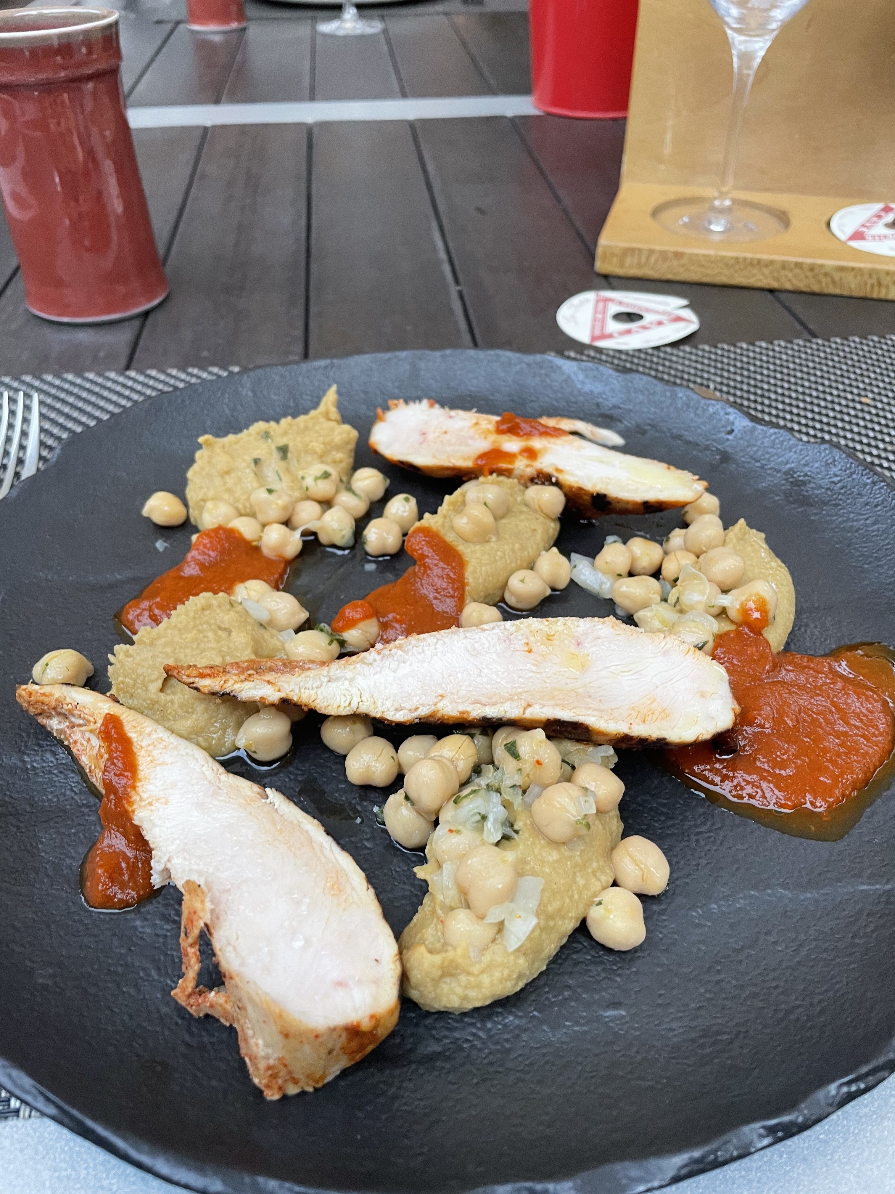 Des assiettes minutieusement préparées. De bons produits. Originale mise en bouche :) servie dans un mini bol en plastique des plus basiques :(. Emplacement table seule face au ballet des serveurs, dommage . Jolie terrasse, (décoration à base de panneaux d entrée de villes à vignoble bof). Certaines pièces de vaisselle en poterie originale et intéressante