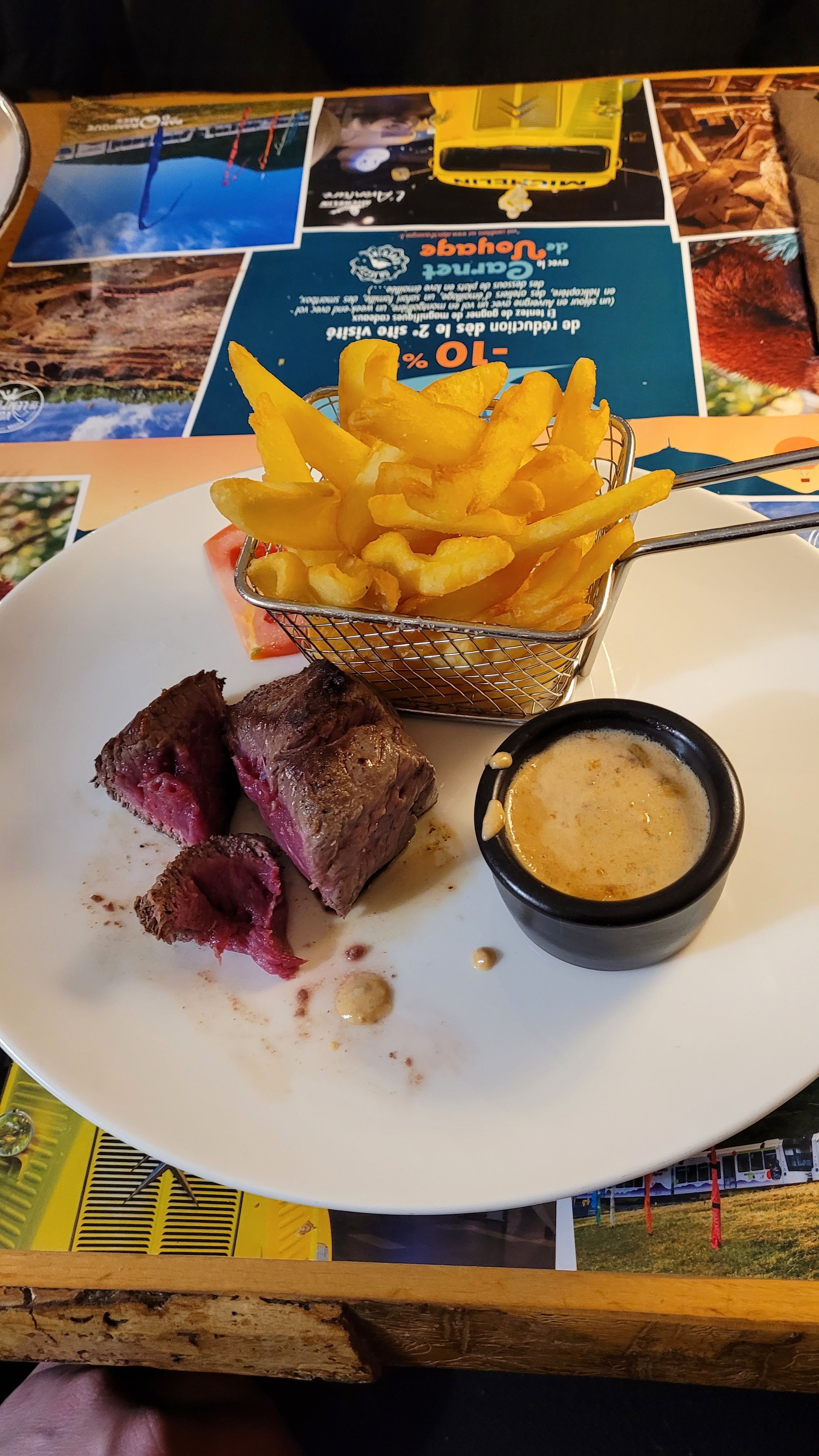 Super repas viande et salade excellent. Une petite crème brûlée aux myrtilles délicieuse. Service très rapide. Un cadre très chaleureux et un serveur super gentil. On chercher désespérément un restaurant ouvert un lundi soir hors saison en janvier et c'était le seul ouvert. L'établissement a accepté notre chien sans problème car flux client très faible et nous a installer sur une petite table excentré pour aucunes gênes des autres clients. nous avons eu un super accueil . Nous recommandons vraiment!