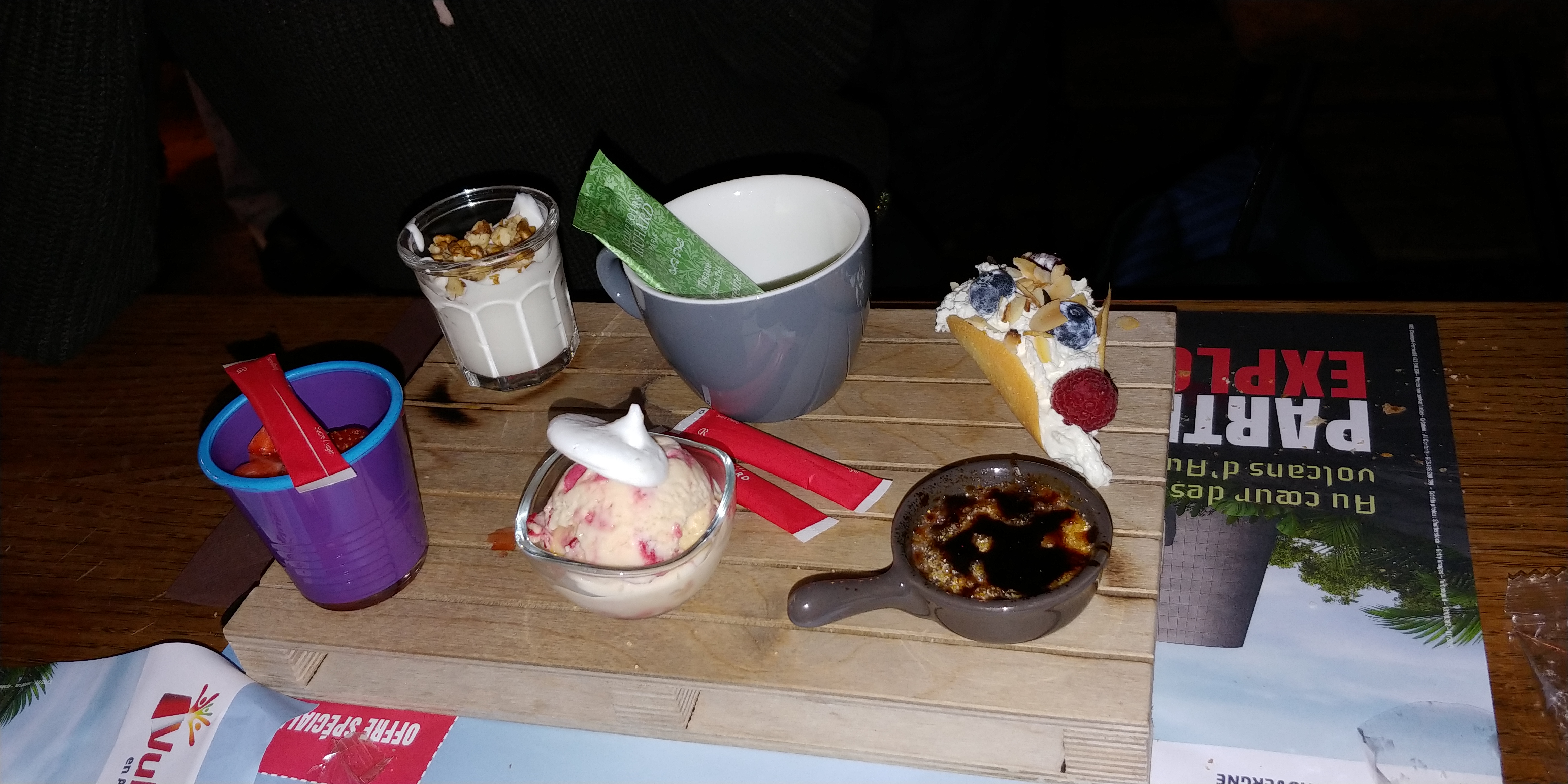 Entrée du menu à 19€ : simple pâté à priori pas fait maison Plat copieux : tartiflette Le pain servi n'était pas frais L'une des boules de glace servie était fondue. Nous l'avons signalée mais explication non plausible Nous avons apprécié d'avoir été acceptés pour déjeuner alors que l'horaire était tardif