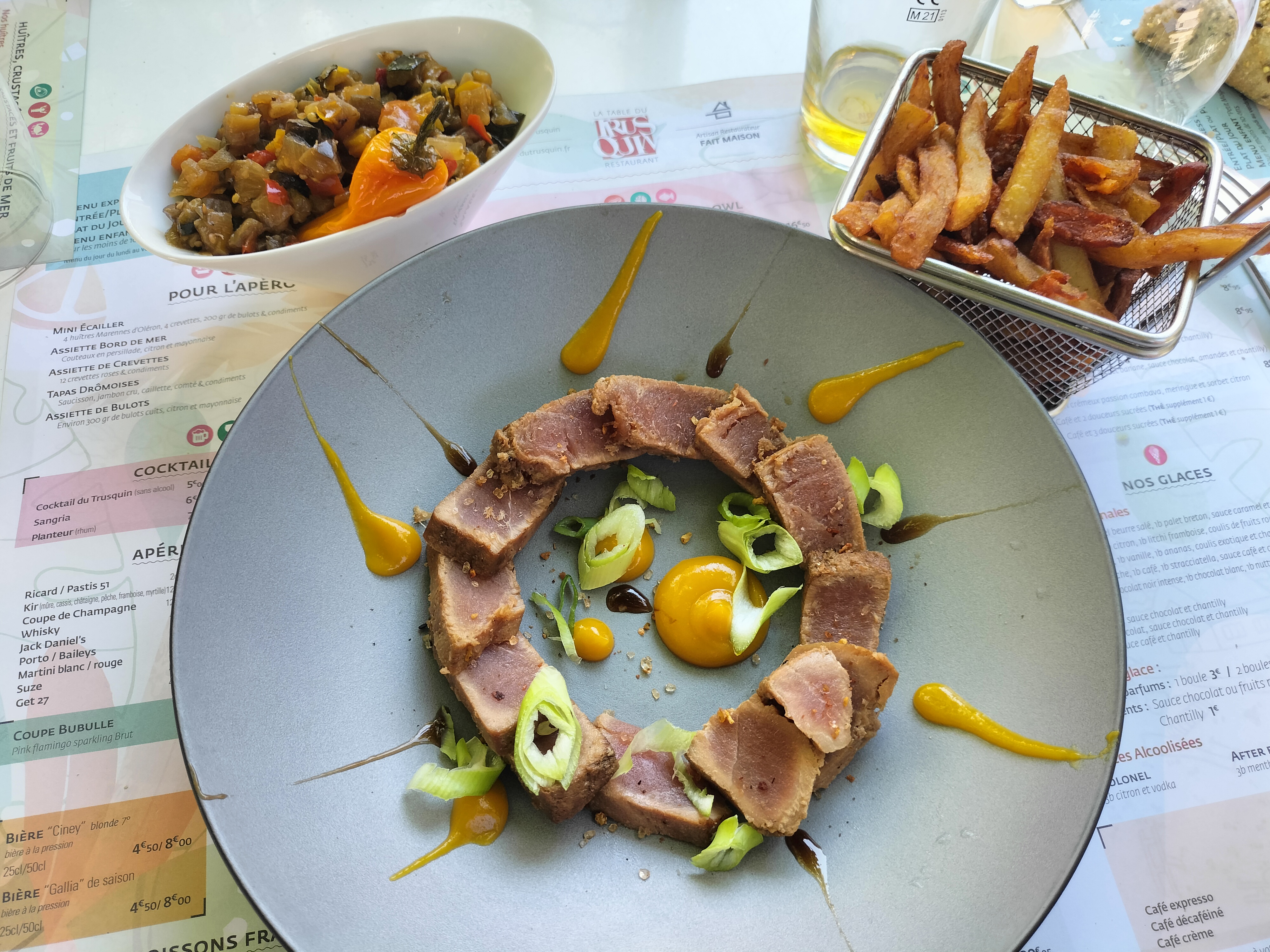 Bon restaurant, cadre sympa, salle intérieure en Pierre bruyante, dommage. Pour plus d'intimité, je vous conseille le haut Trusquin avec sa cuisine Gastronomique, haut de gamme. Plus cher évidemment mais un Rapport Qualité prix intéressant. Cela dépend de ce que l'on cherche 😉